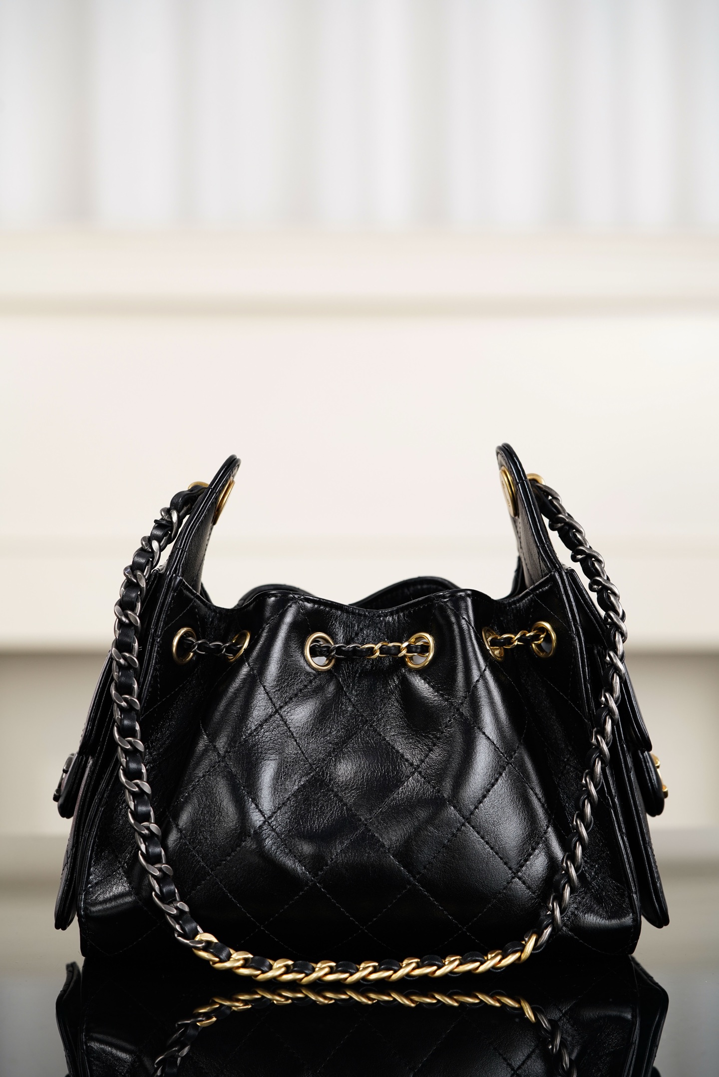 𝐂𝐇𝐀𝐍𝐄𝐋 𝟐𝟔𝐂新款 𝟐𝟓𝐁𝐚𝐠 𝐦𝐢𝐧𝐢 油蜡皮鸳鸯链 一眼心动的𝐇𝐨𝐛𝐨‼️ 亮面油蜡皮🐂;看起来娇嫩实则好打理👏🏻 双拼链条也太绝了吧🤩 金银双标和黑色搭配永不过时✔️ 寓意“有金(进)有银(赢)”~ 开口可调节的抽绳设计很实用; 侧面两个小口袋、省心好搭子一枚👏🏻 随便怎么搭配都是手拿把掐~ 尺寸:𝟐𝟎𝐱𝟐𝟐𝐱𝟏𝟐.𝟓𝐜𝐦