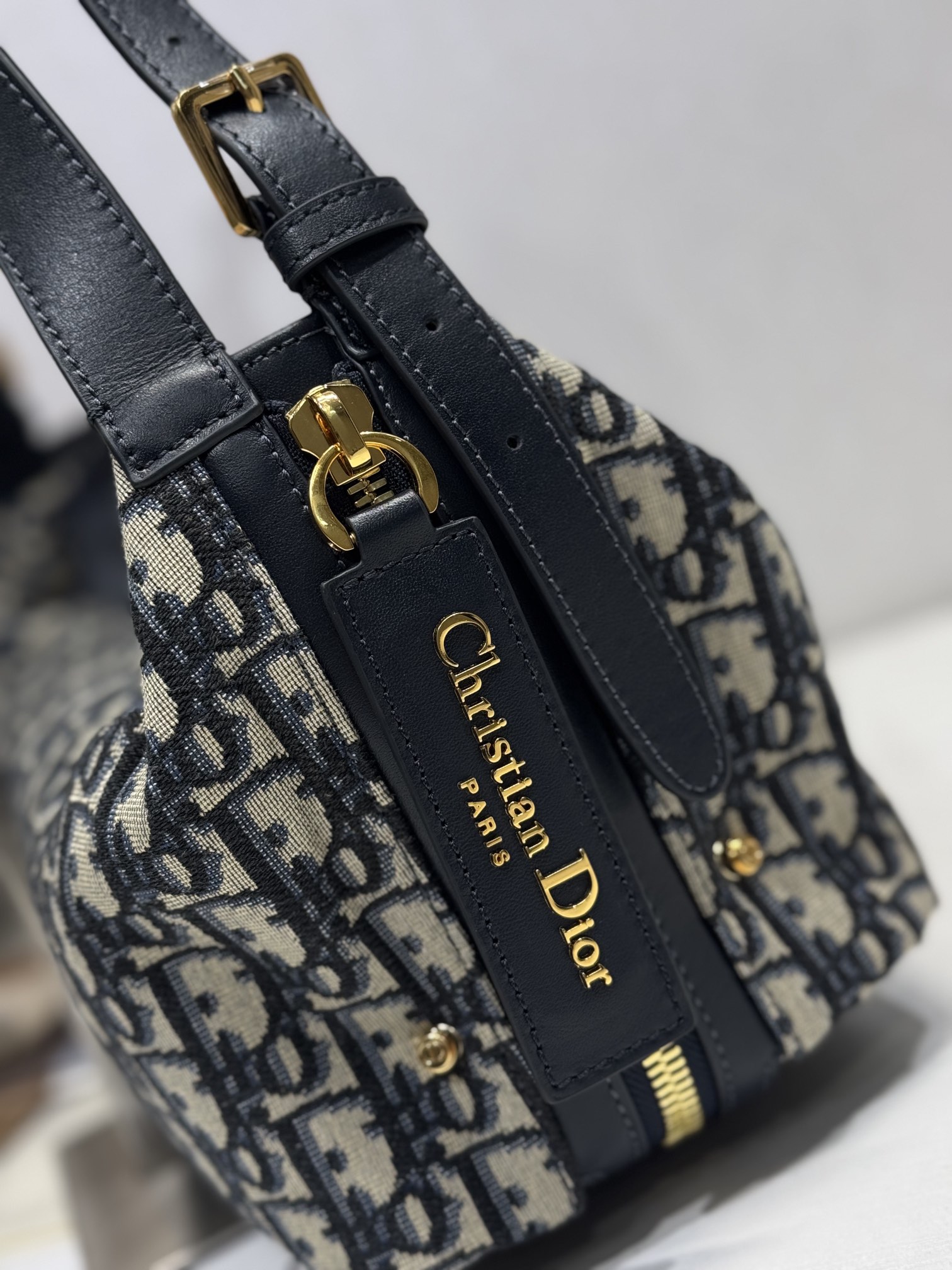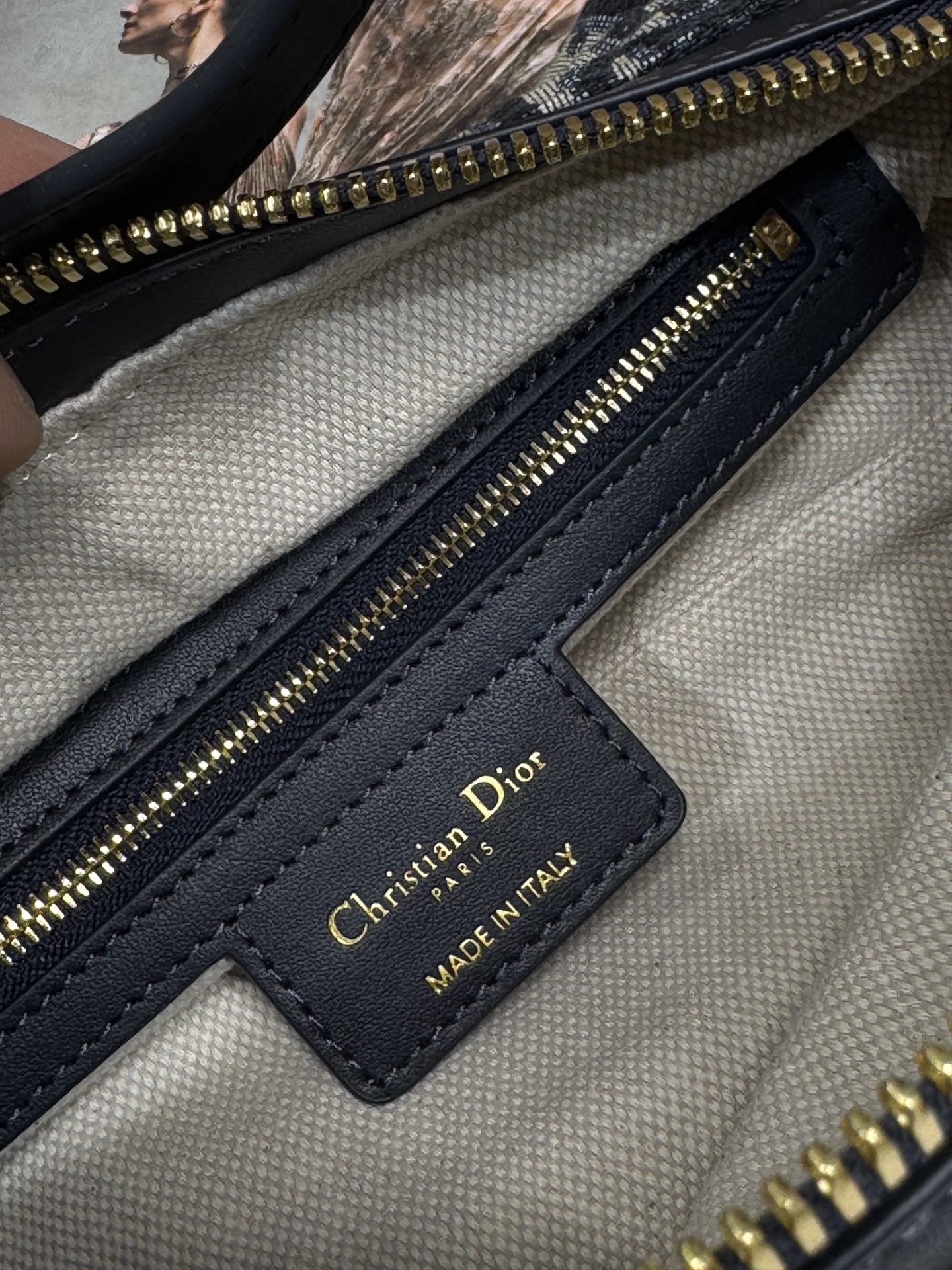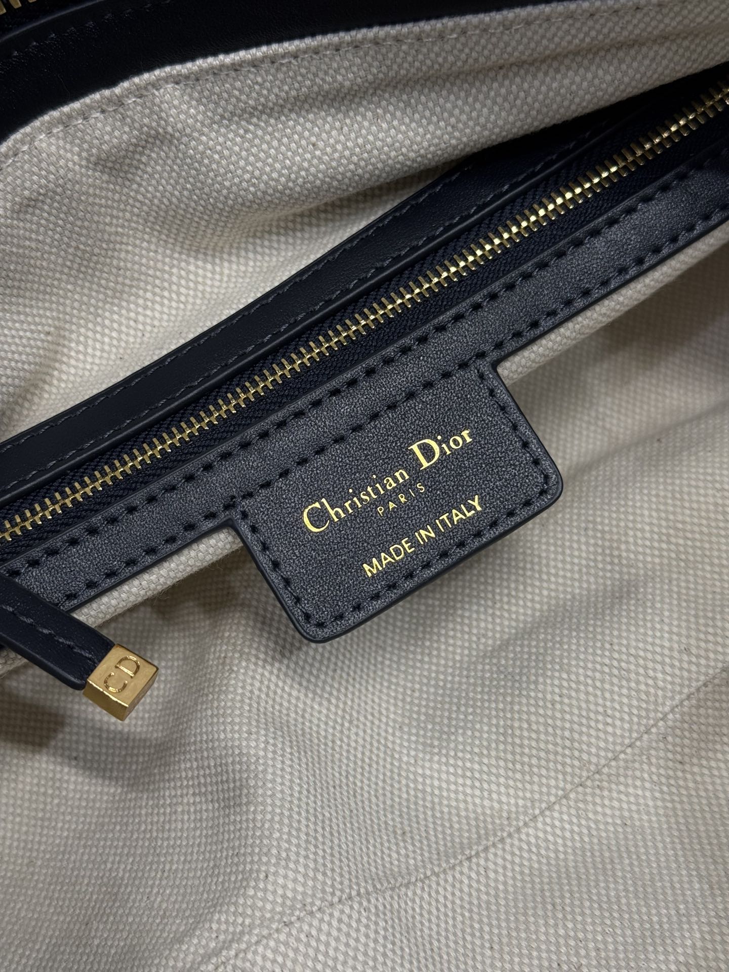 侧面装饰性口袋搭配皮革拉链头,饰以复古金色饰面金属 Christian Dior Paris 标志
