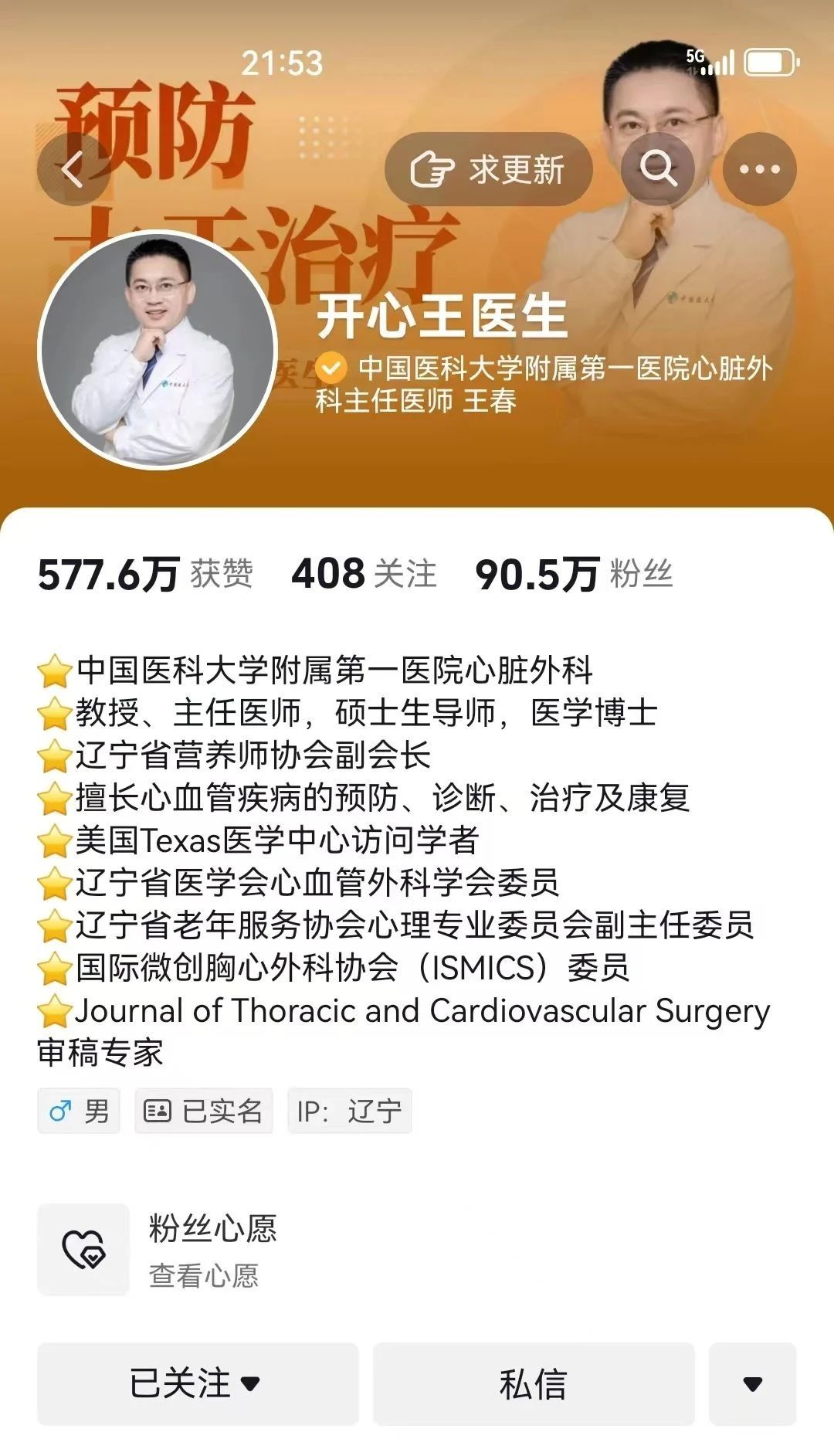 十、王春教授(中国医科大学第一附属医院心脏外科主任医师)(抖音严谨医学科普前五名)