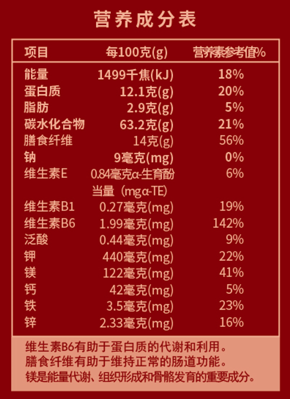 三、高膳食纤维:每日摄入本产品150克,即可以完成每日摄入目标的84%。膳食纤维有助于维持正常的肠道功能。足量的膳食纤维摄入,是血糖平稳的保障。