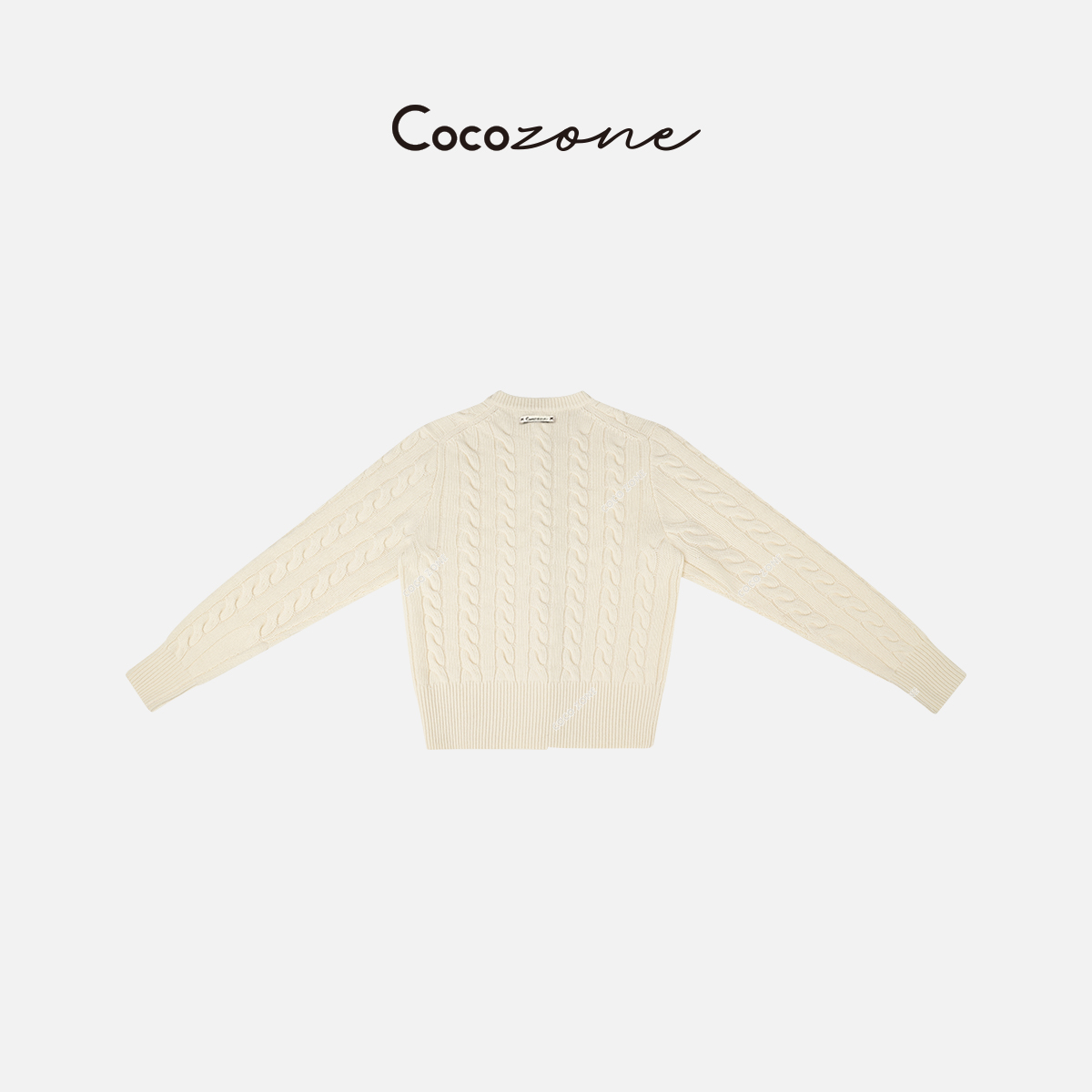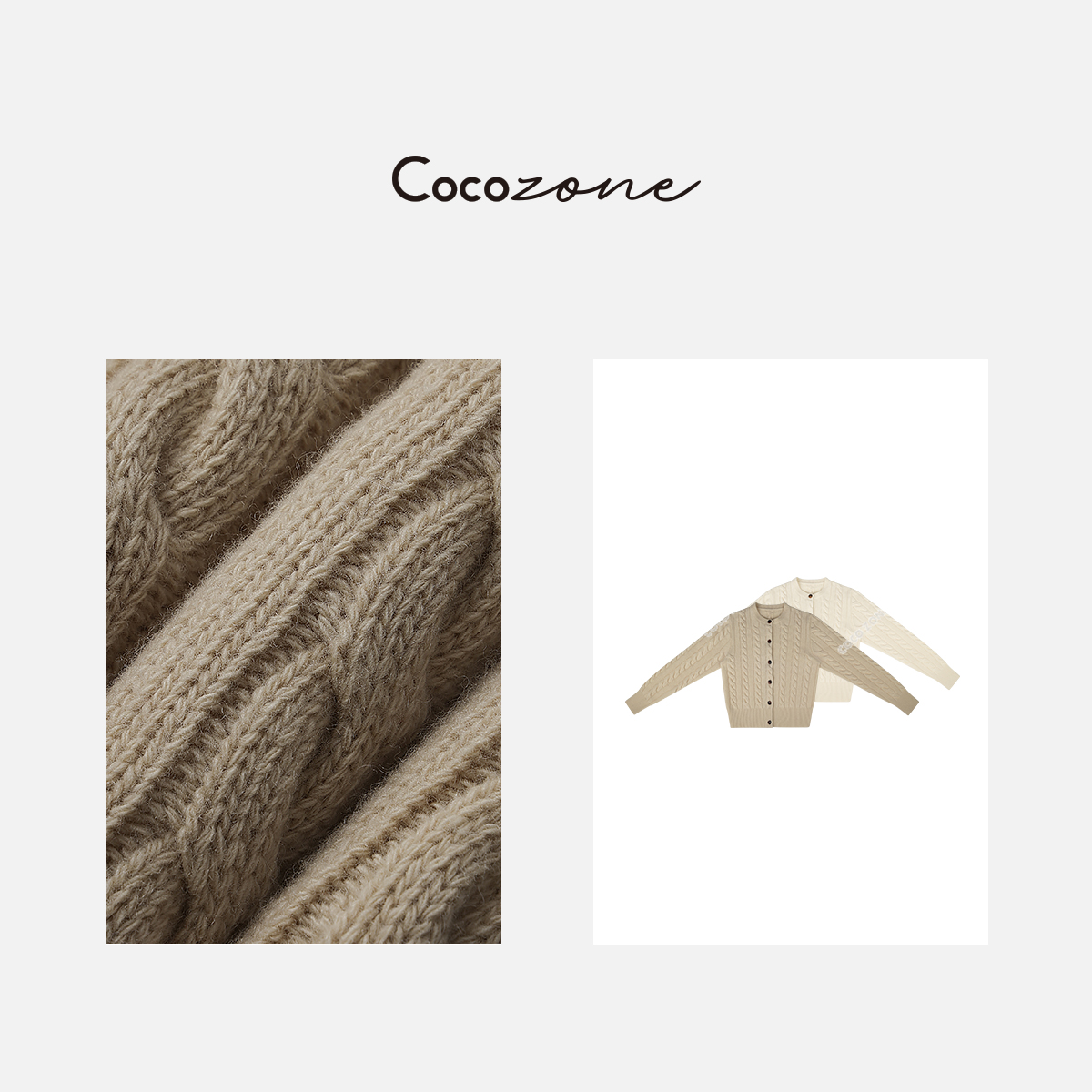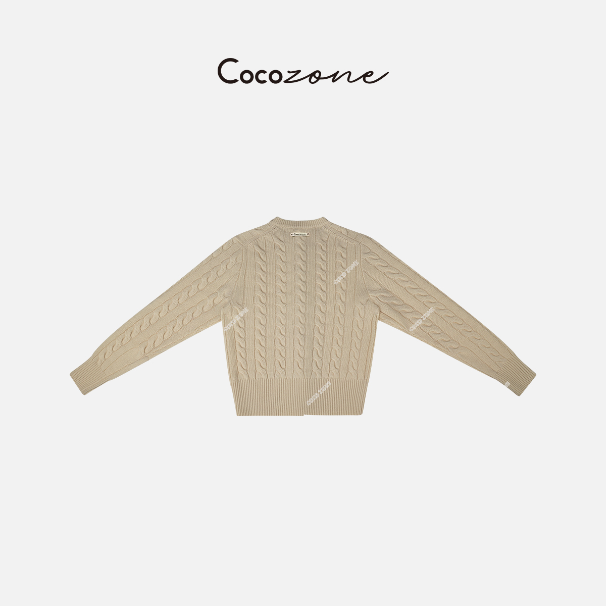 COCO ZONE100%羊毛圆领麻花纹单排扣针织开衫23C30578