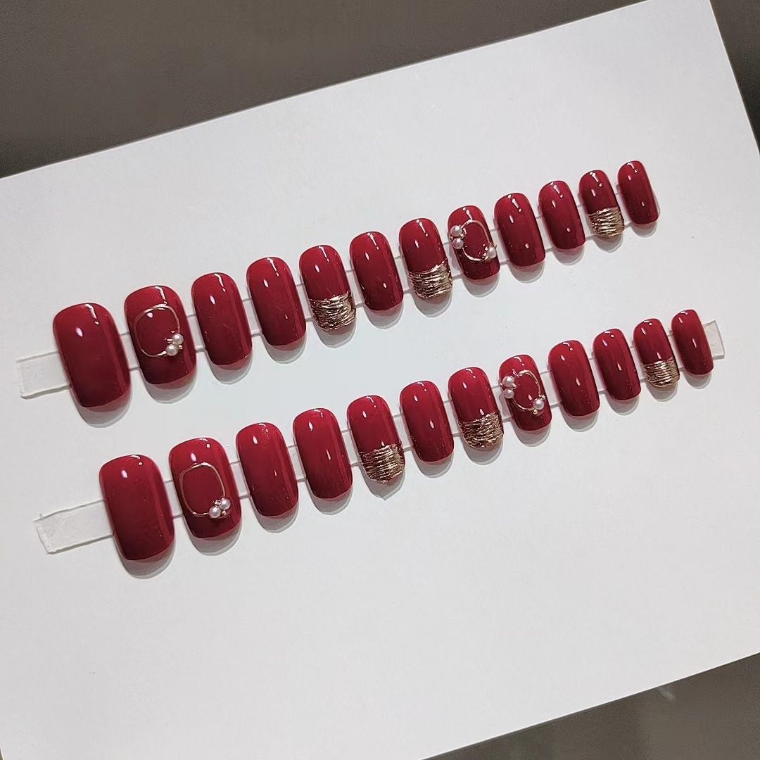 【新年限定!显白穿戴甲】金玉锦绣中长方酒红色显白穿戴甲结婚新年新娘美甲立体魔镜粉,显白的酒红色中长方设计。ry