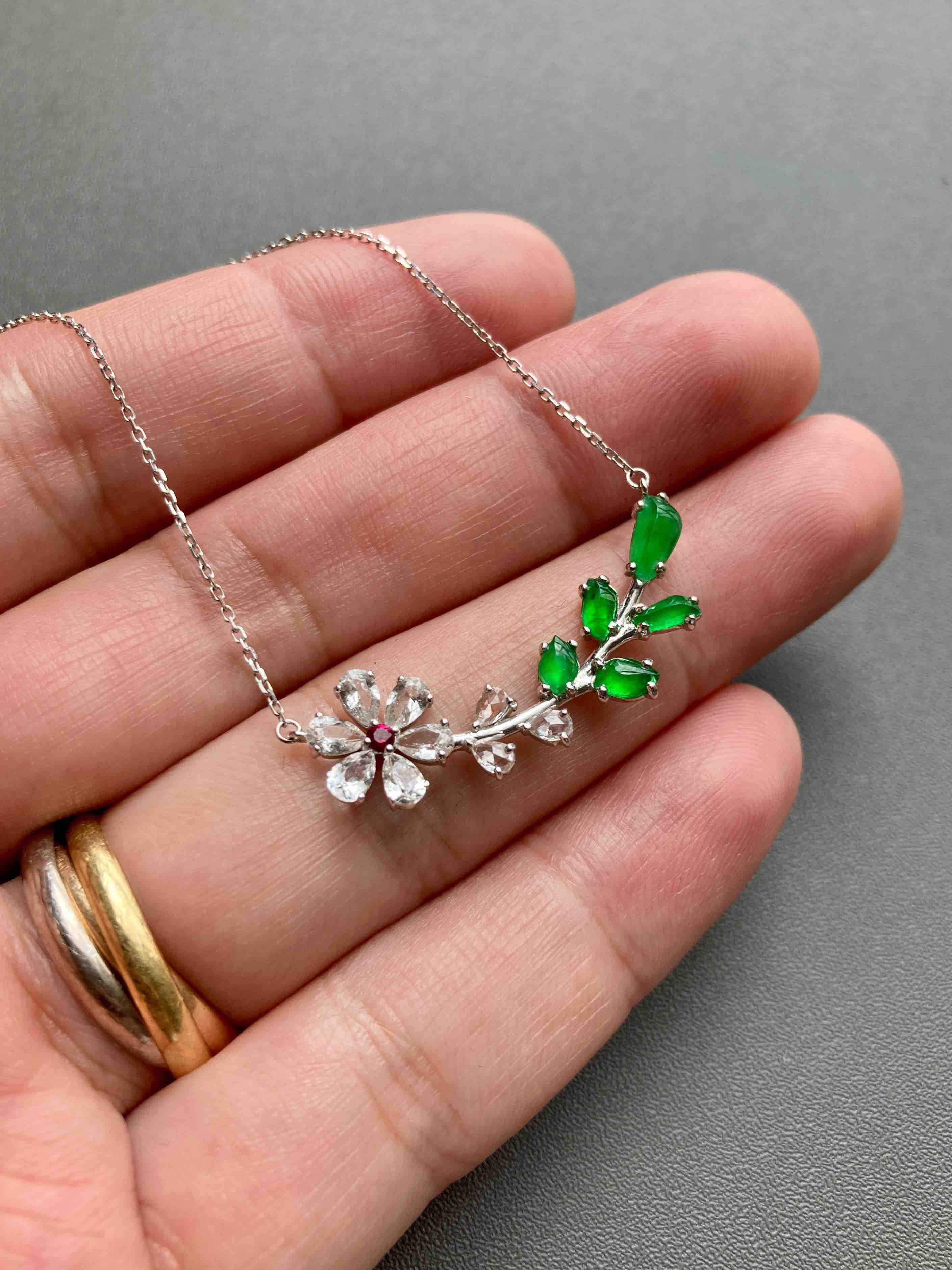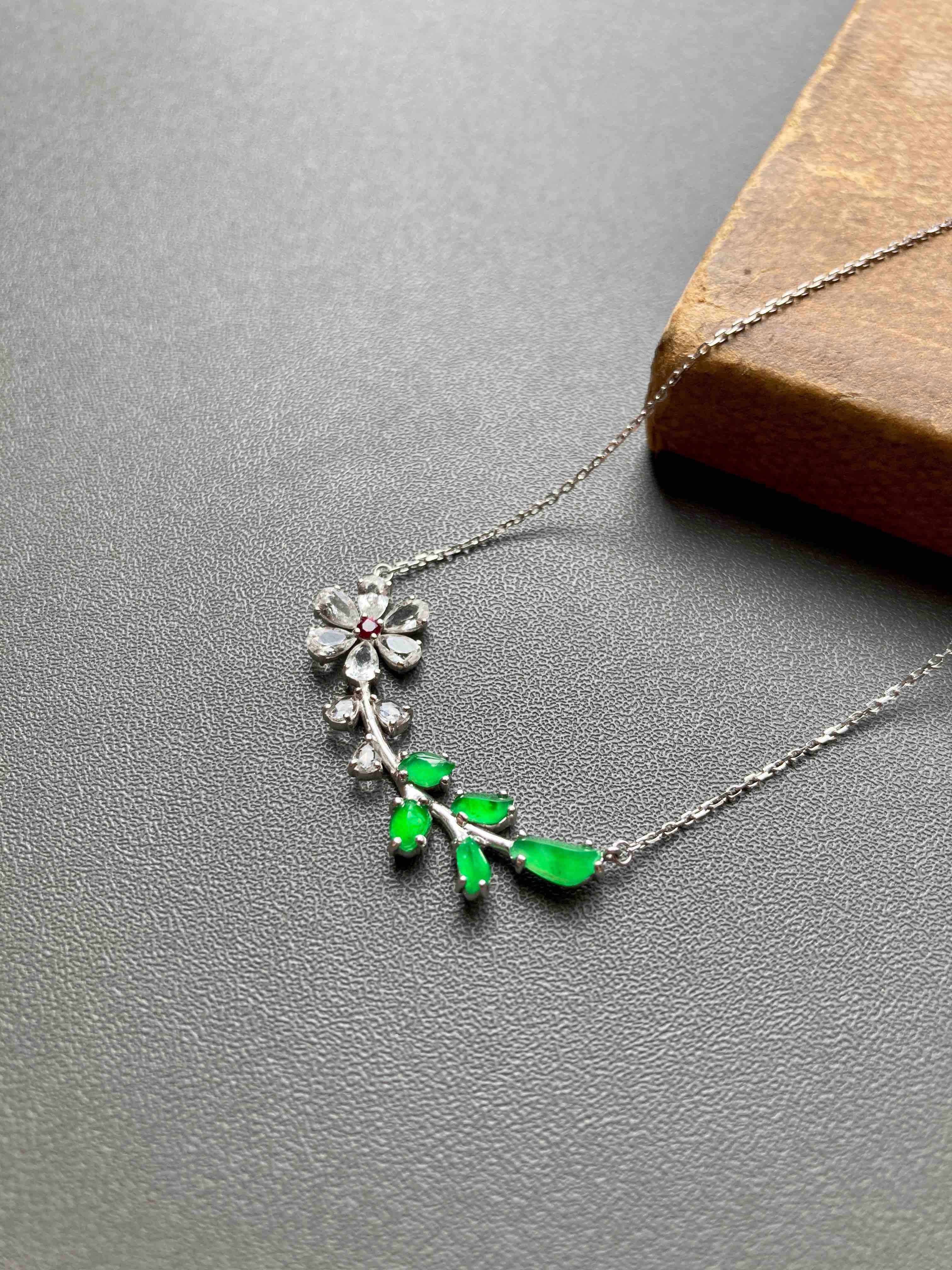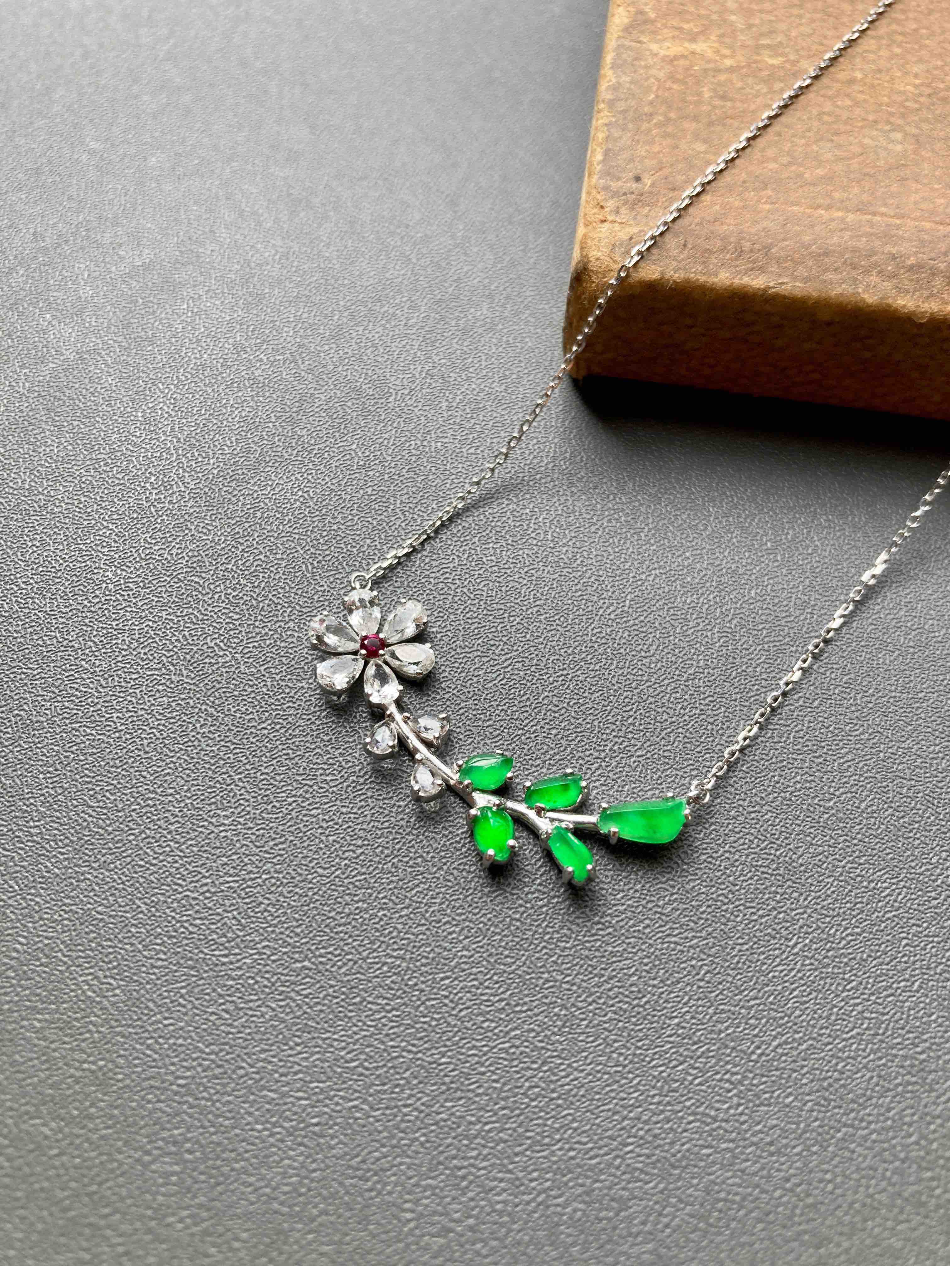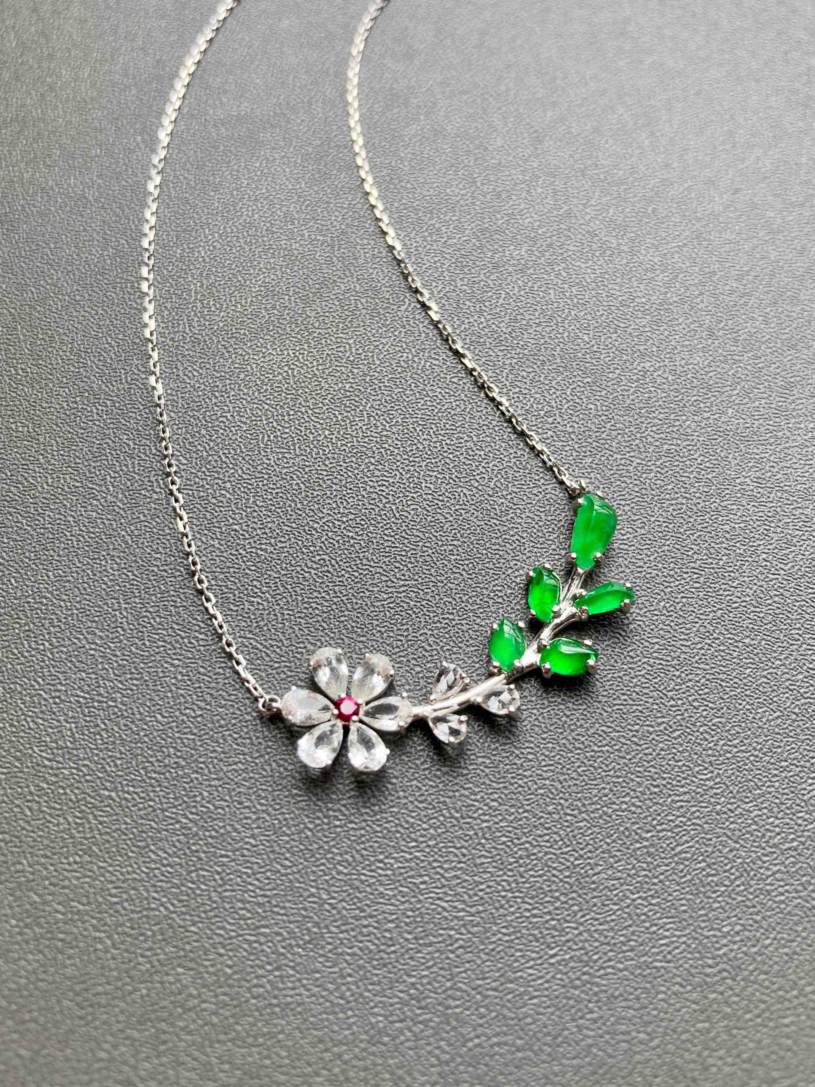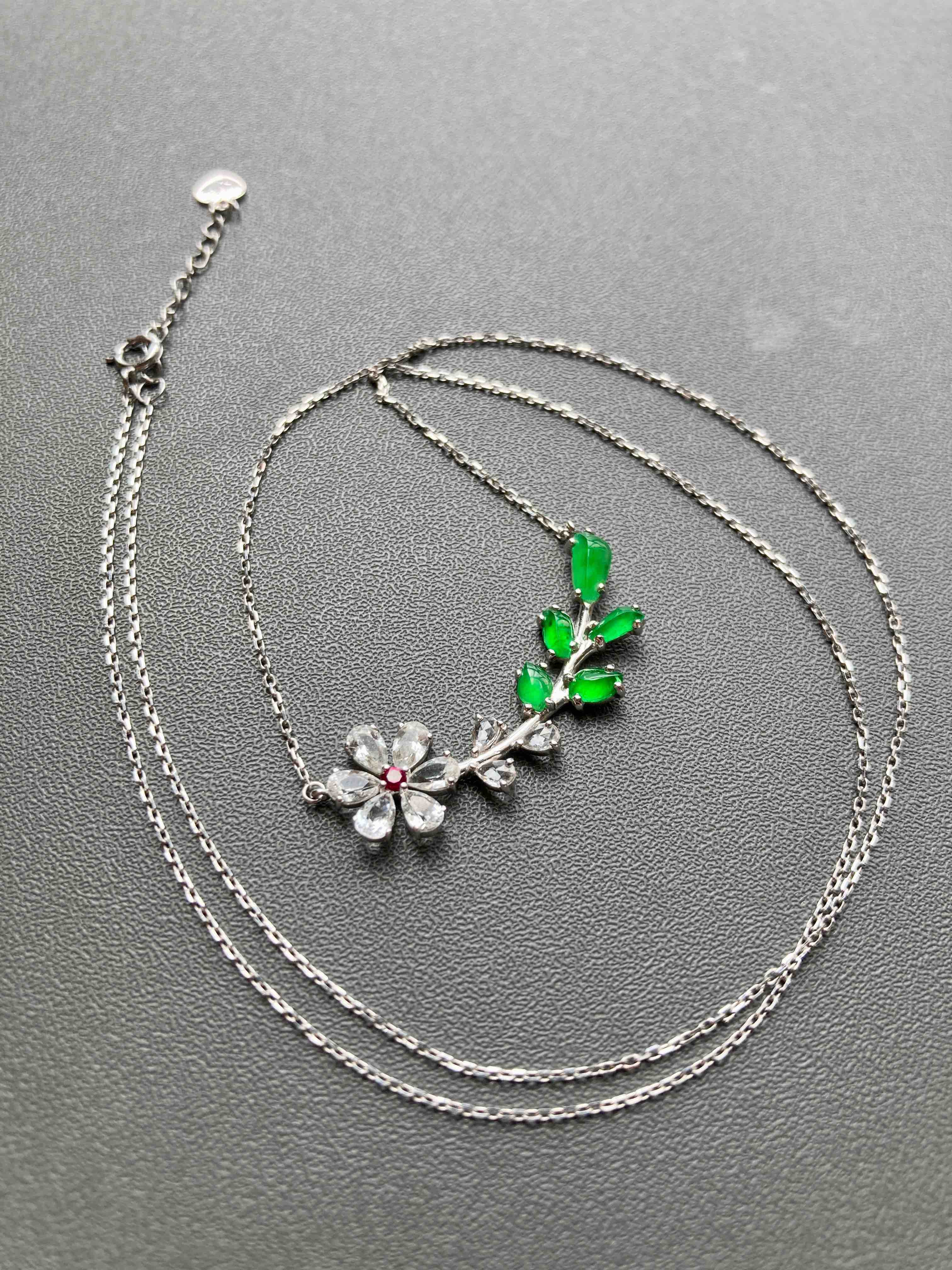 小特别,高冰种阳绿翡翠小花拼镶锁骨链,色标级正阳绿翡翠和无色蓝宝石拼镶,花心是红宝石,18k白金镶嵌,款式时尚简洁,镶嵌后