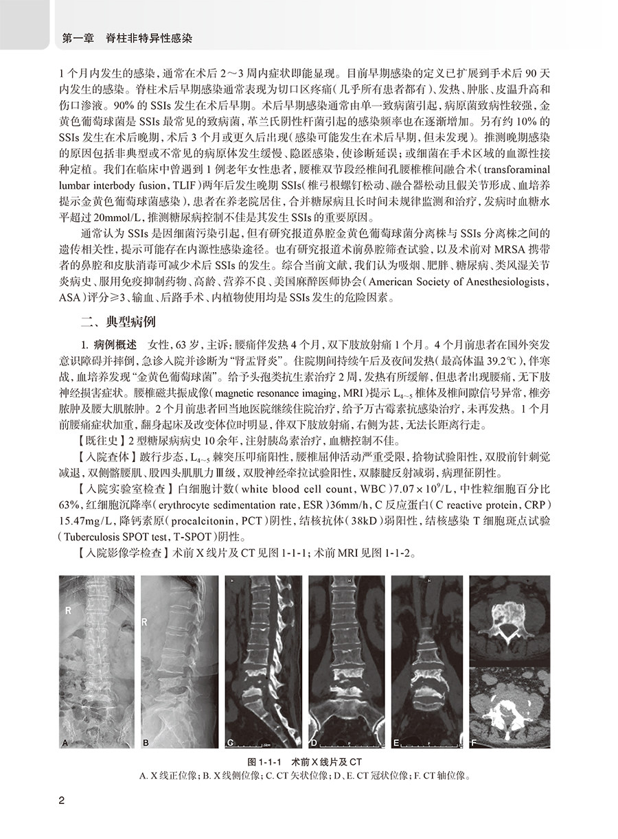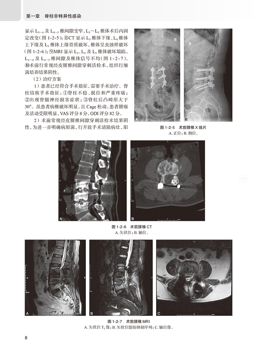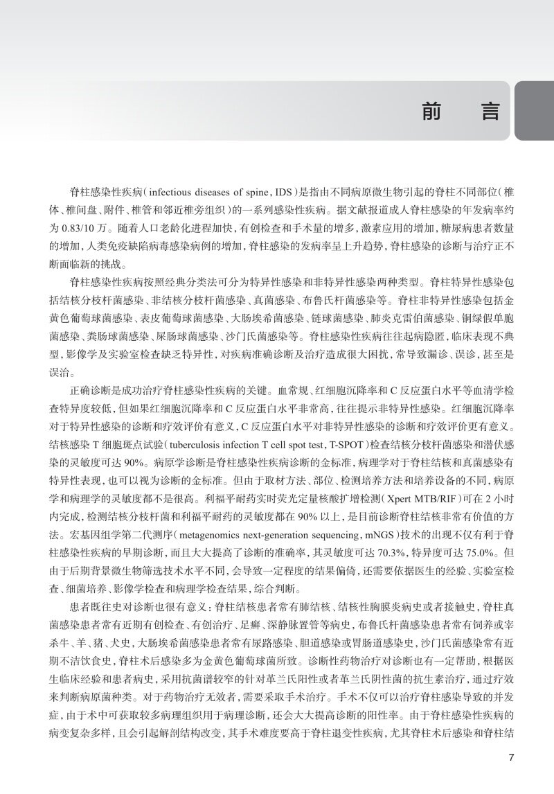 脊柱感染性疾病是指由不同病原微生物引起的脊柱不同部位(椎体、椎间盘、附件、椎管和邻近椎旁组织)的一系列感染性疾病,约占全身骨骼肌肉系统感染的2%~7%。脊柱感染性经典分类法可分为特异性感染和非特异性感染两种类型。脊柱特异性感染包括结核分枝杆菌感染、非结核分枝杆菌感染、布鲁氏杆菌感染、真菌感染和寄生虫感染。脊柱非特异性感染包括金黄色葡萄球菌感染、表皮葡萄球菌感染、大肠埃希菌感染、链球菌感染、肺炎克雷伯菌感染、铜绿假单胞菌感染、粪肠球菌感染、屎肠球菌感染、沙门氏菌感染等。本书将针对不同类型的脊柱感染,先进行概述,之后从临床表现、影像学检查、病理学和实验室检查、非手术治疗、手术适应证和禁忌证、术前准备、手术步骤、术后处理等方面进行阐述,最后附上2~3个经典病例。这些经典病例是本书的精髓所在,旨在加深读者对该疾病的理解和认识。每个病例的展示包括病史、症状、体征、影像学和实验室检查、诊断思路、术前处理、手术方法、术后管理措施,以及对该疾病的研究现状和**进展等,力争将该疾病的诊断和治疗方法阐述更加得鲜活生动。每个病例争取都具有一定代表性,在诊断和治疗上具有一定难度,达到读者有受益匪浅的感觉。随着脊柱结核手术在基层医院的逐步开展,手术失败需要翻修的患者逐年增多,此类患者手术难度大,并发症发生率高,基层医院难以完成。针对这一问题,本书将对脊柱结核手术失败翻修病例进行展示,详细阐述脊柱结核手术失败的诊断、治疗原则、手术入路选择、手术技术要点及预后。脊柱结核患者误诊行椎体强化术的问题日趋严重,脊柱外科医生对这个问题的认识存在误区,其结果是对患者产生灾难性后果。针对这一临床常见问题,本书将详细阐述脊柱结核误诊行椎体强化术患者的治疗原则和方法,及远期效果,加深同行对该问题的认识。