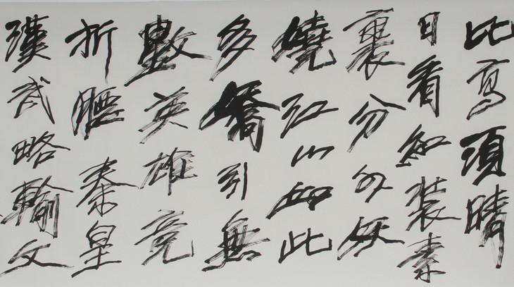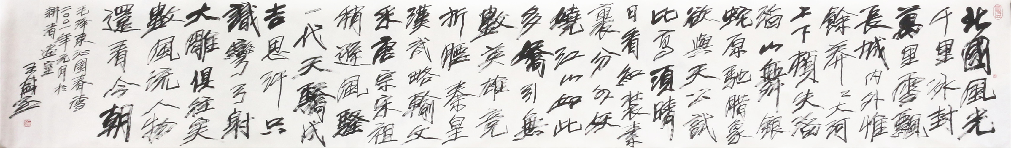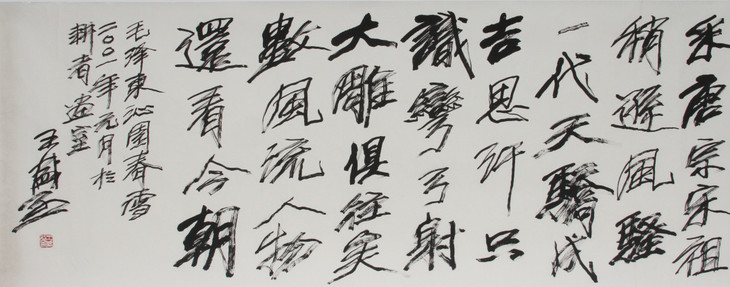 新年刚过,沈阳大雪,应景写这幅书法大作。于晨这样说,“先生穿一件黄褐色的羽绒坎肩,执一长锋毛笔,一气呵成。写完挂在画板上,一边喝不锈钢茶缸里的铁观音茶水,一边看自己的作品。”这幅作品,先生以其特有的折钗股笔法畅快淋漓地一挥而就,三米多长大横幅通篇神完气足,笔墨浓淡相间章法行气一脉贯穿,这样书作难得一见。