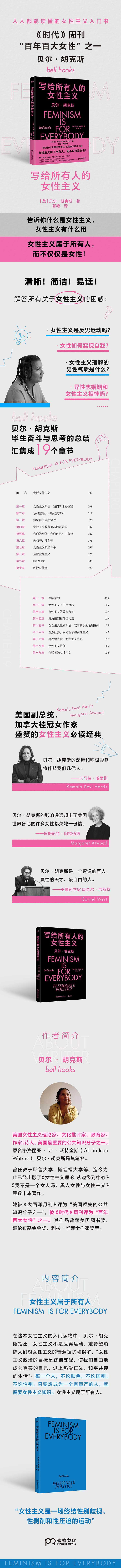 ★美国女性主义的代表人物,鼓舞数百万人的先锋思想家贝尔胡克斯是美国女性主义的代表人物之一,曾被美国《大西洋月刊》评为;我们国家领先的公共知识分子之一,被《时代》周刊评为;年度百大女性之一,曾获得美国图书奖、哥伦布基金会奖、利拉华莱士作家奖等。她一生创作了40多部作品,为推动和普及女性主义做出了巨大的贡献。★人人都能读懂的女性主义入门书物化、母职、阴茎嫉羡、有偿家务劳动、性别分离主义女性主义概念五花八门,是否让你感到无从下手?《写给所有人的女性主义》用清晰、简洁、易读的语言让每个人都可以读懂女性主义,用贝尔胡克斯的话说,这是;一本解释女性主义理论的通俗读物,一本你能带回家和亲戚、父母、祖父母、朋友分享的书。★一本书解答所有关于女性主义的困惑 女性主义是反男运动吗?女性如何实现自我?女性主义理解的男性气质是什么?异性恋婚姻和女性主义相悖吗?《写给所有人的女性主义》分析了人们最关心的十几个女性主义议题,包括生育权、美的标准、阶级剥削、家务劳动、薪酬差距、伴侣关系等,为我们解答了所有关于女性主义的困惑。★女性主义是一场终结压迫的运动,而不是反男运动贝尔胡克斯给女性主义下了一个简明而强有力的定义,即;女性主义是一场终结性别压迫的运动,由此拓宽了女性主义的视野。在她看来,女性主义不是反男运动,它属于所有人,而不仅仅是女性。只有把广大的男性也吸收到运动中来,女性主义才能实现它的最终目标:;终结支配,使我们自由地成为真实的自己,过上热爱正义、和平共存的生活。