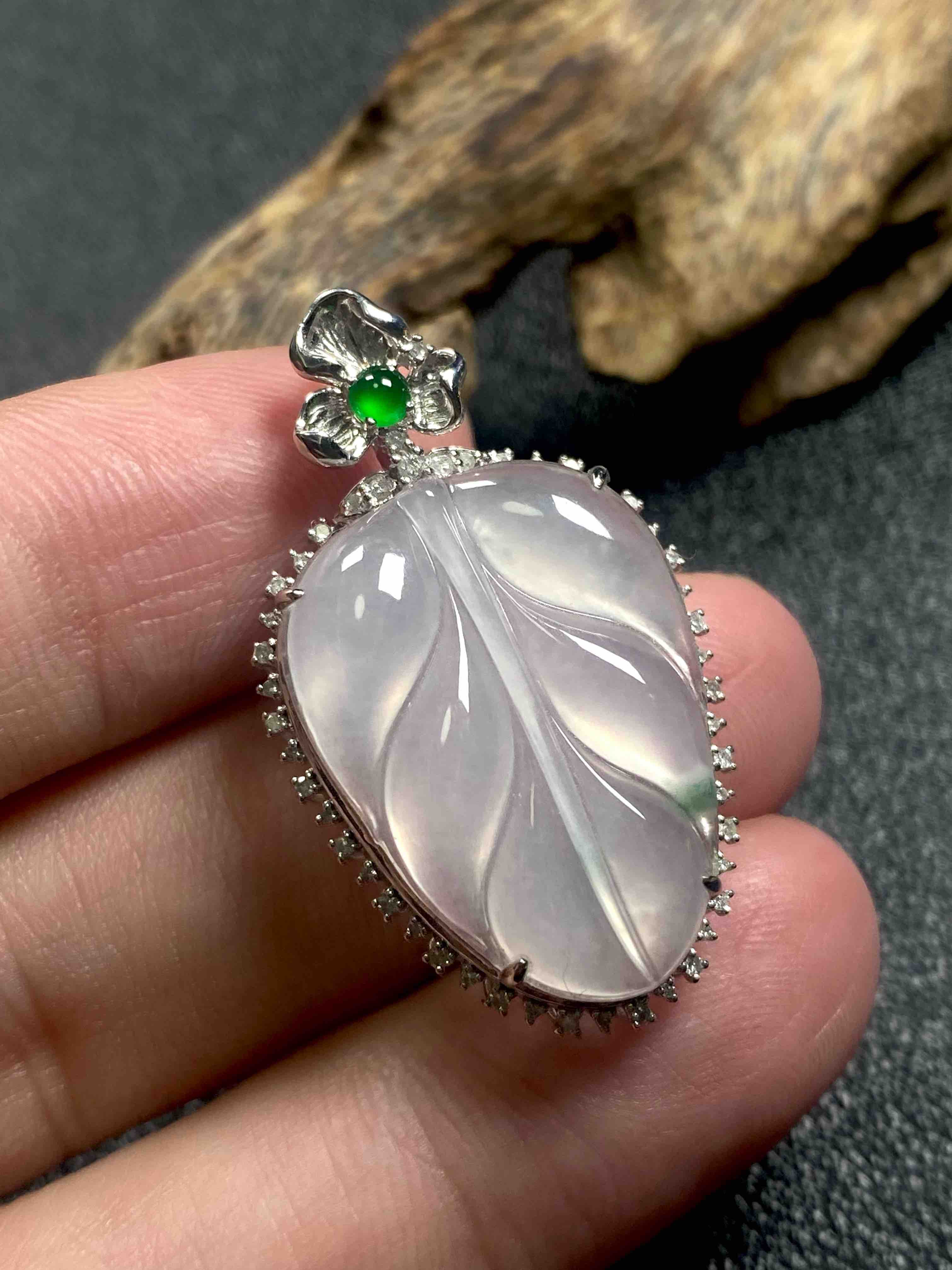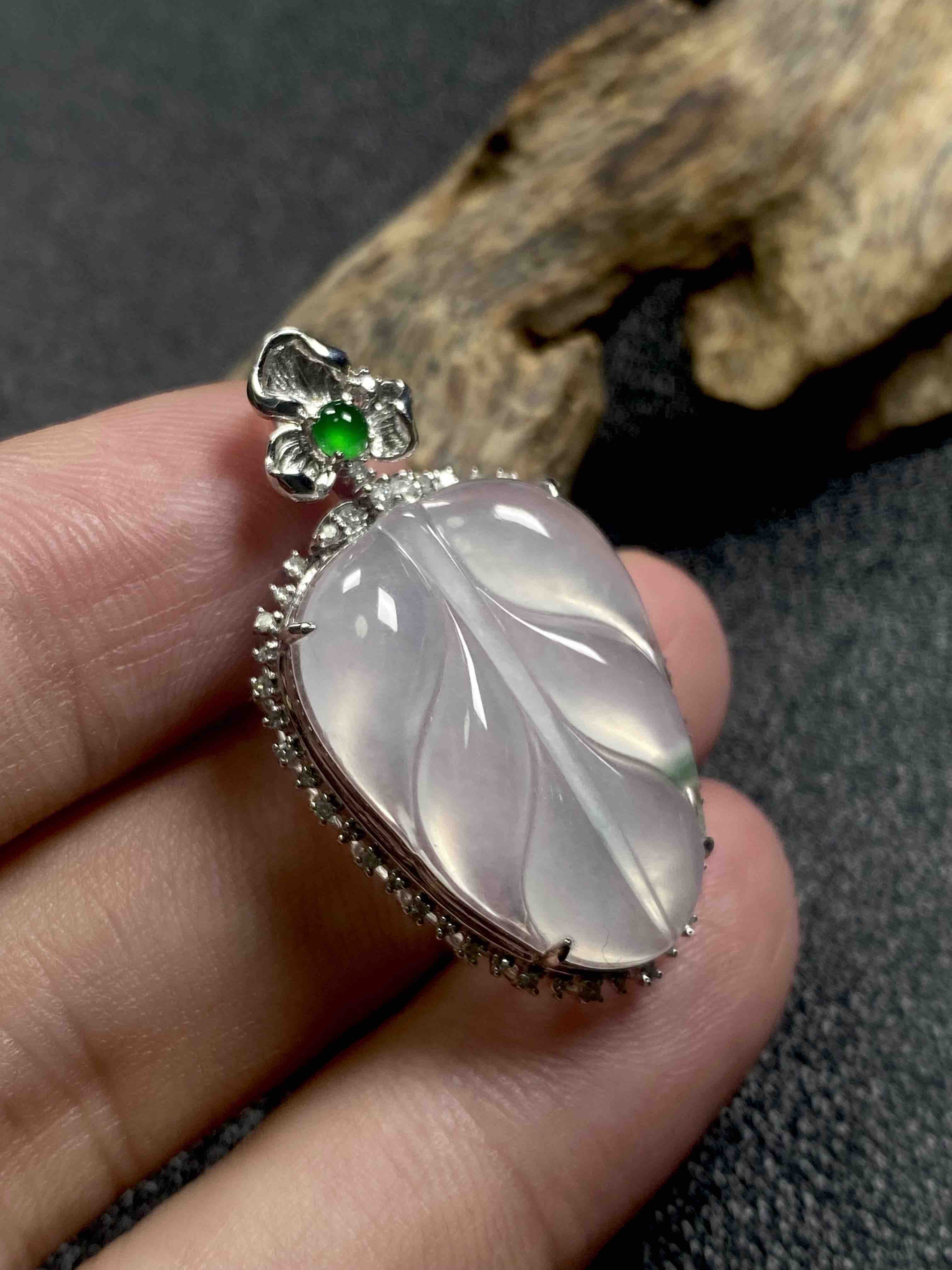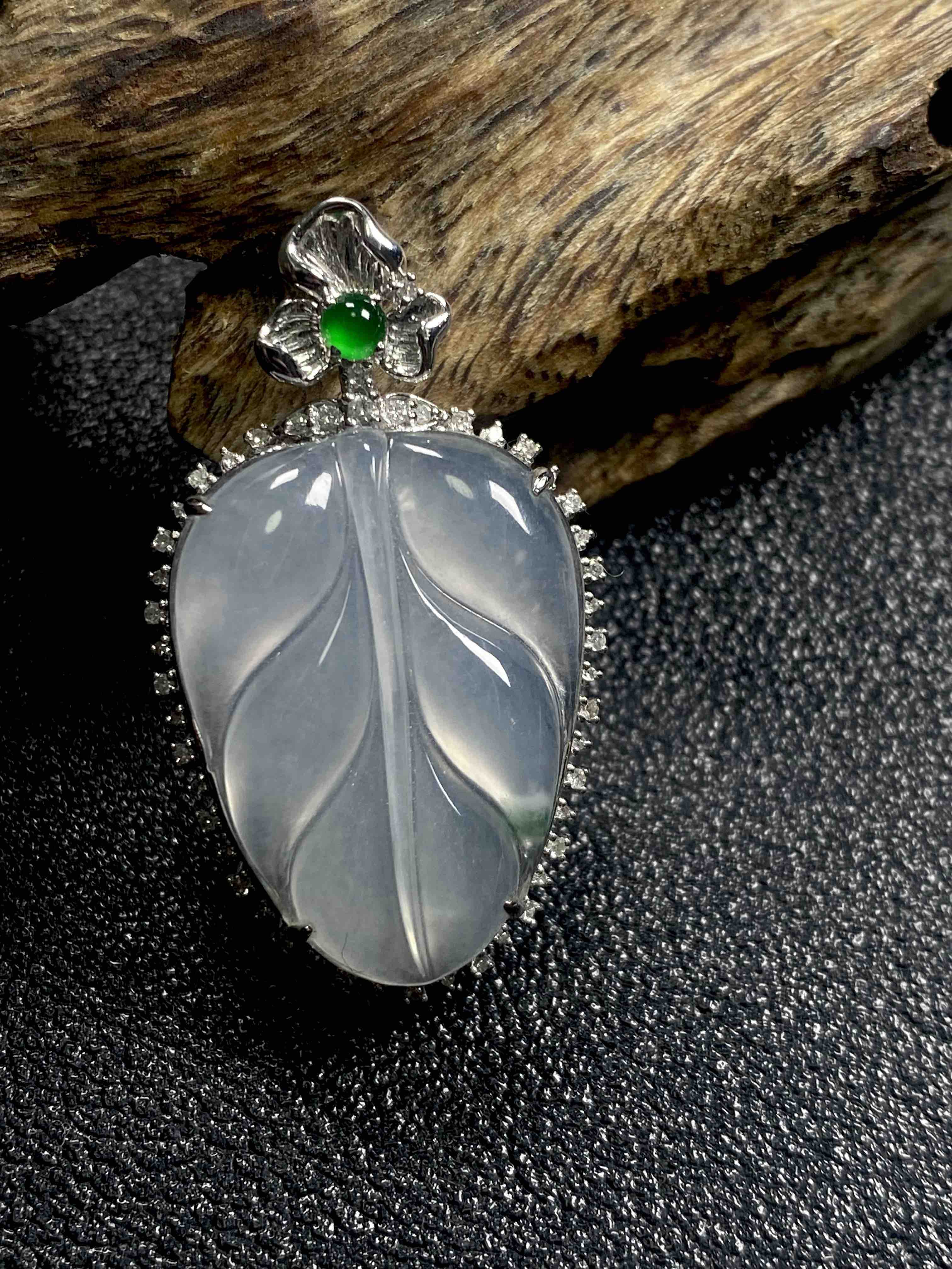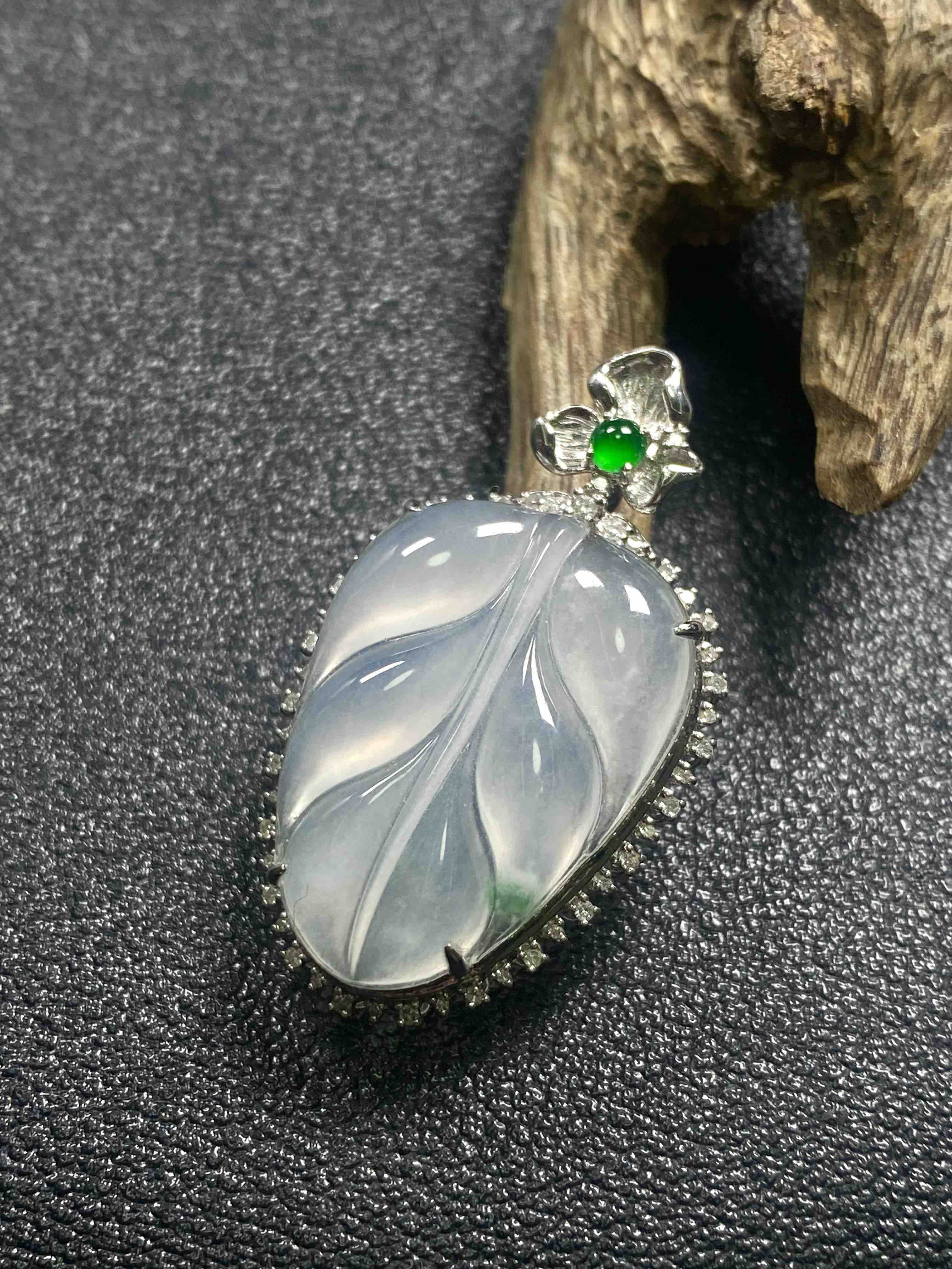 【FC0117】18K镶嵌翡翠冰种叶子吊坠 冰润光泽 莹光起胶 事业有成