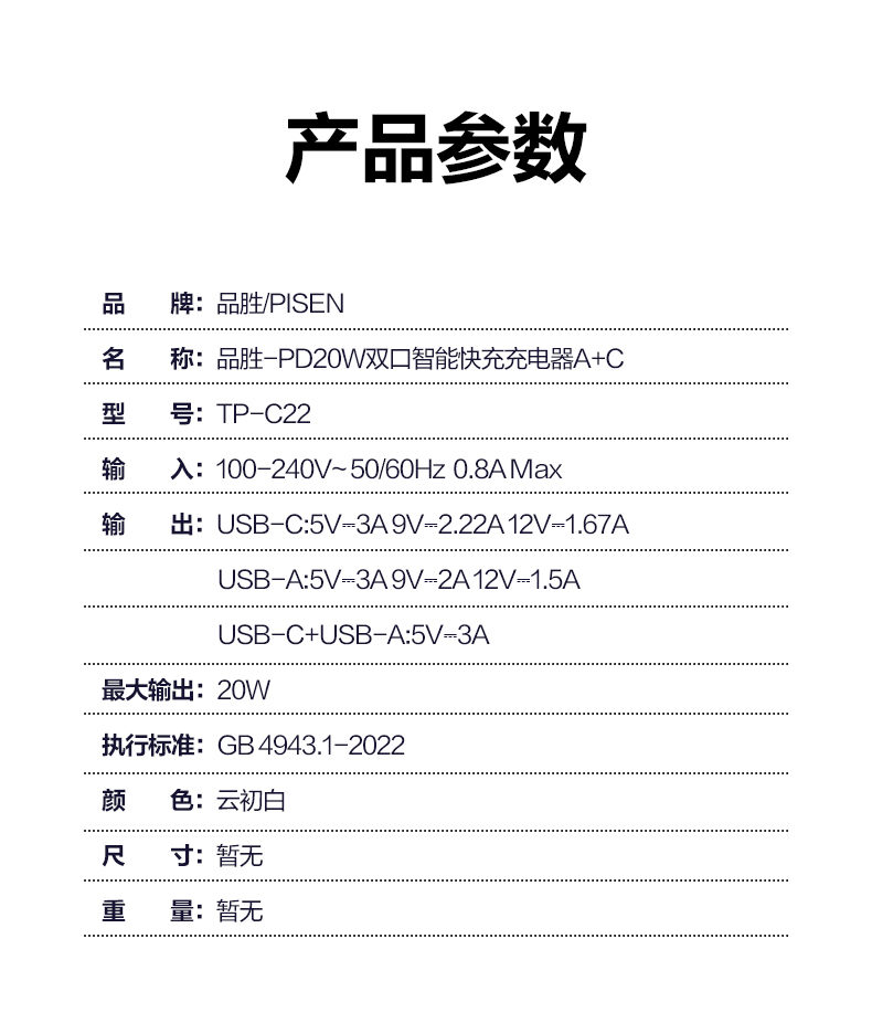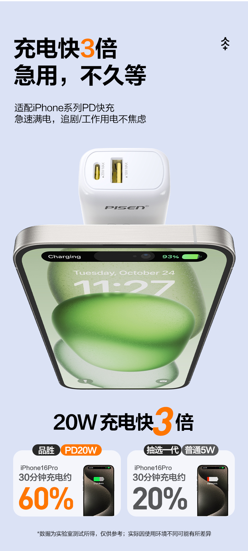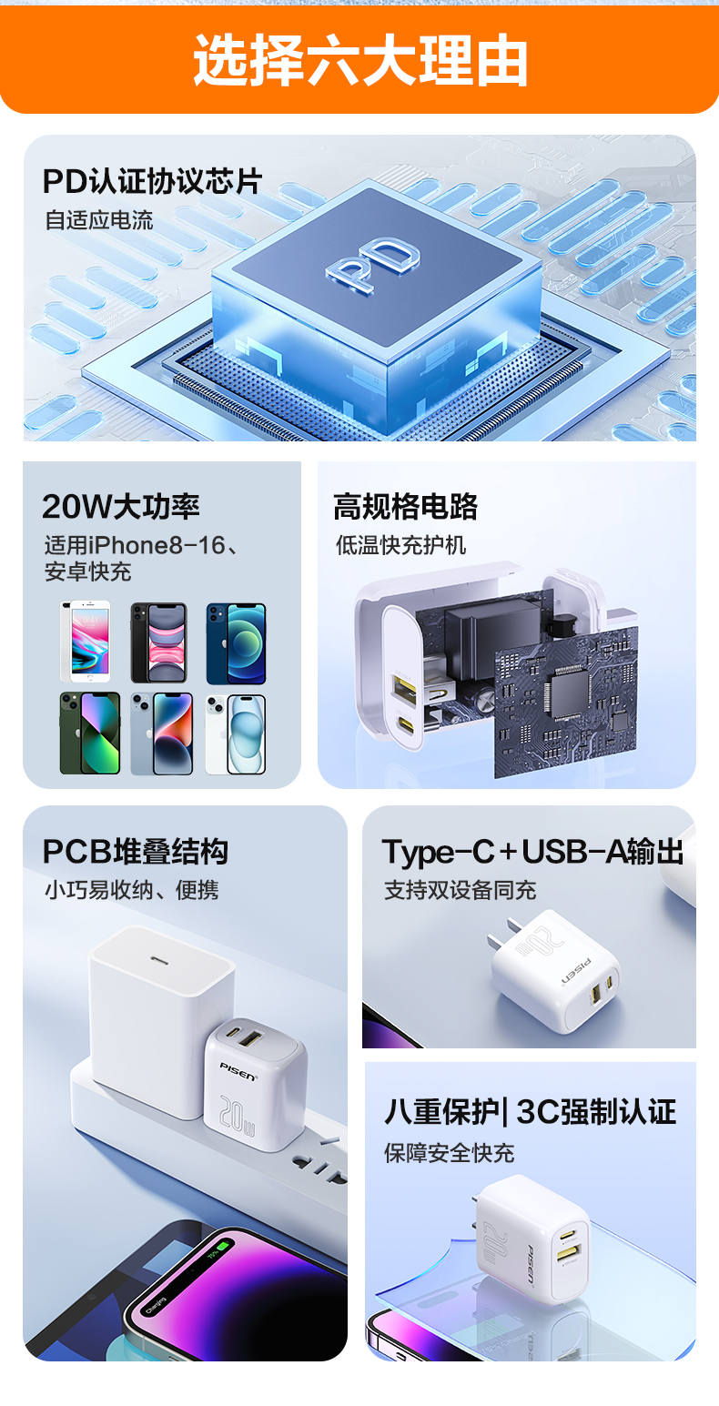 品胜 PD20W双口智能快充充电器A+C 适用于苹果华为小米快速充电