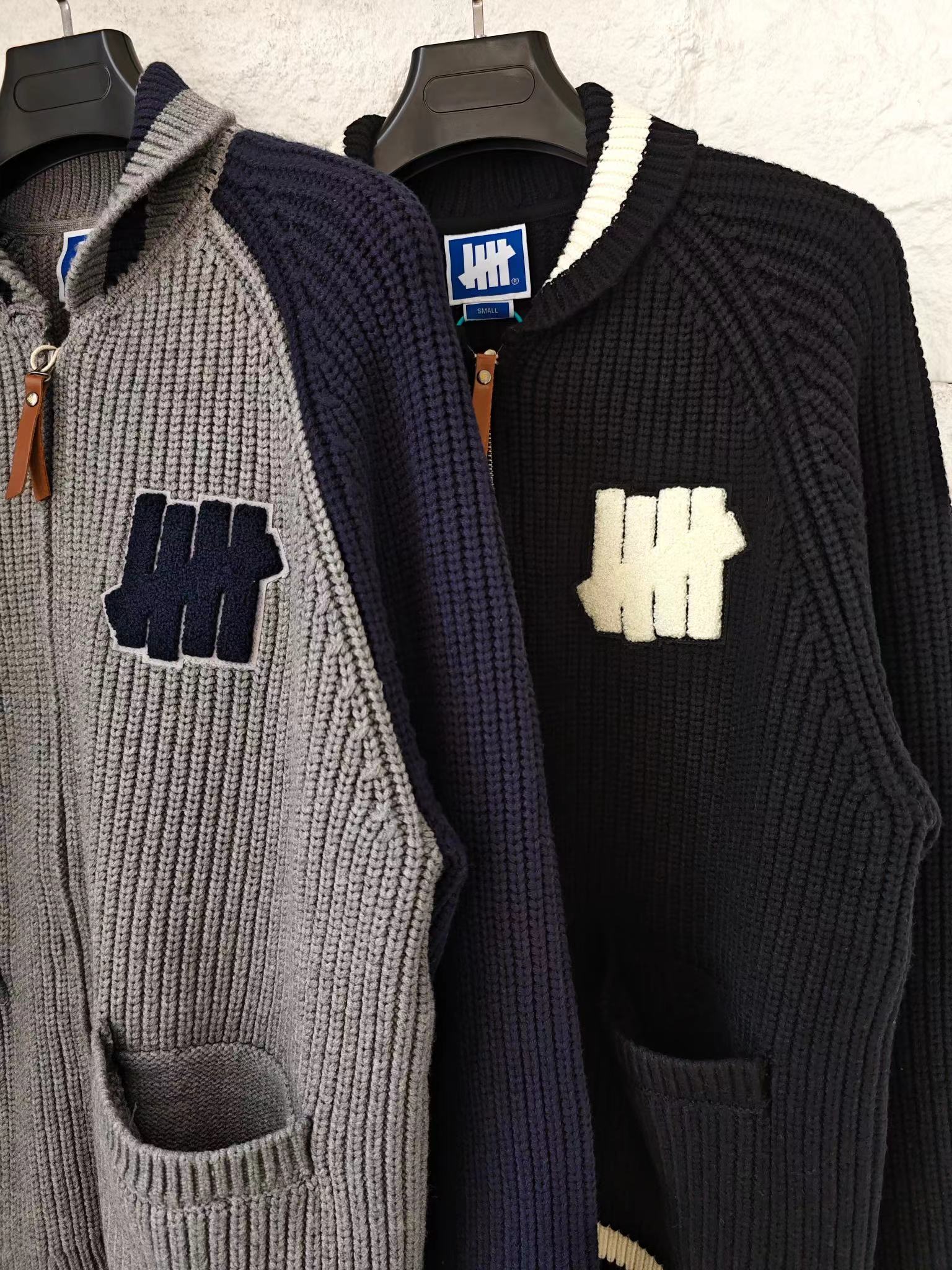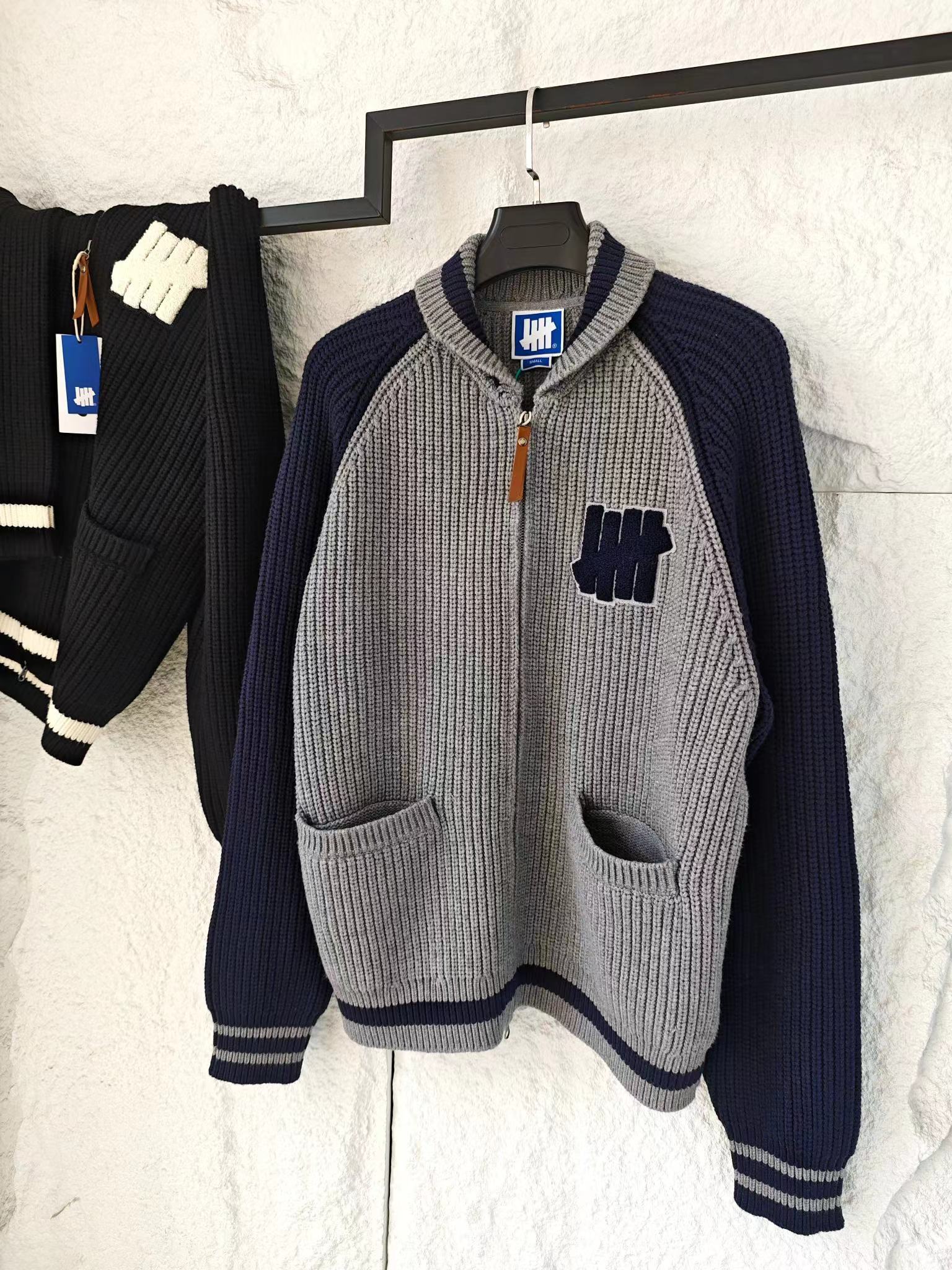 五条杠撞色Logo条纹运动复古元宝针翻领针织衫拉链外套 男女同款