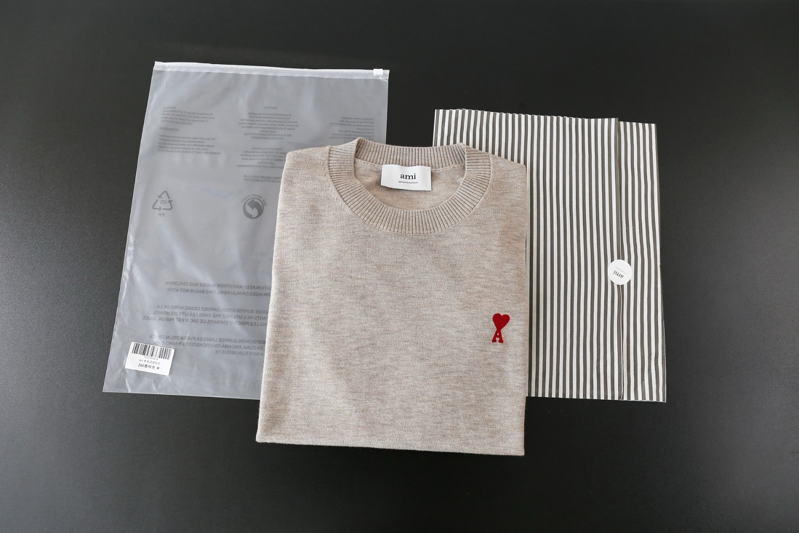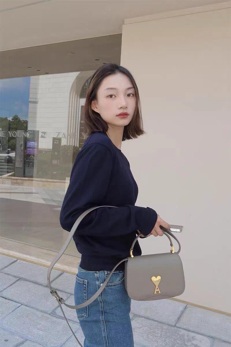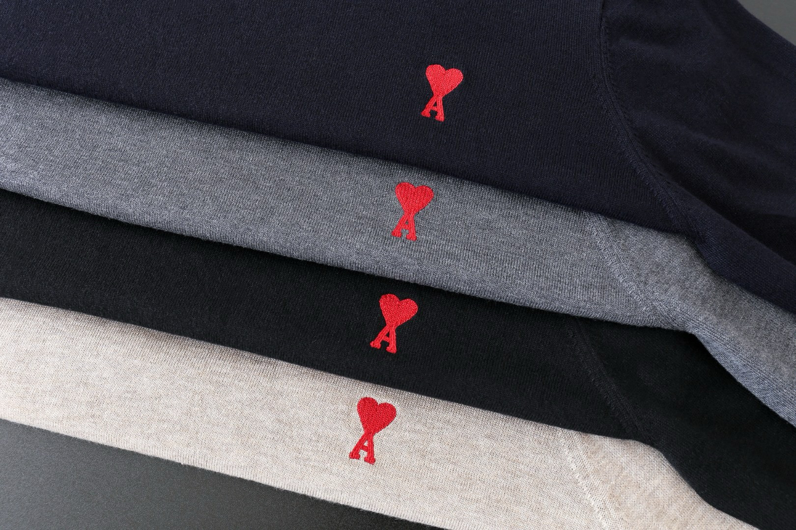 胸前刺绣AMI经典的爱心图案,图案采用进口百灵达链式爱心刺绣,表面呈精细的链条纹理,立体感强,高针数刺绣紧密不透