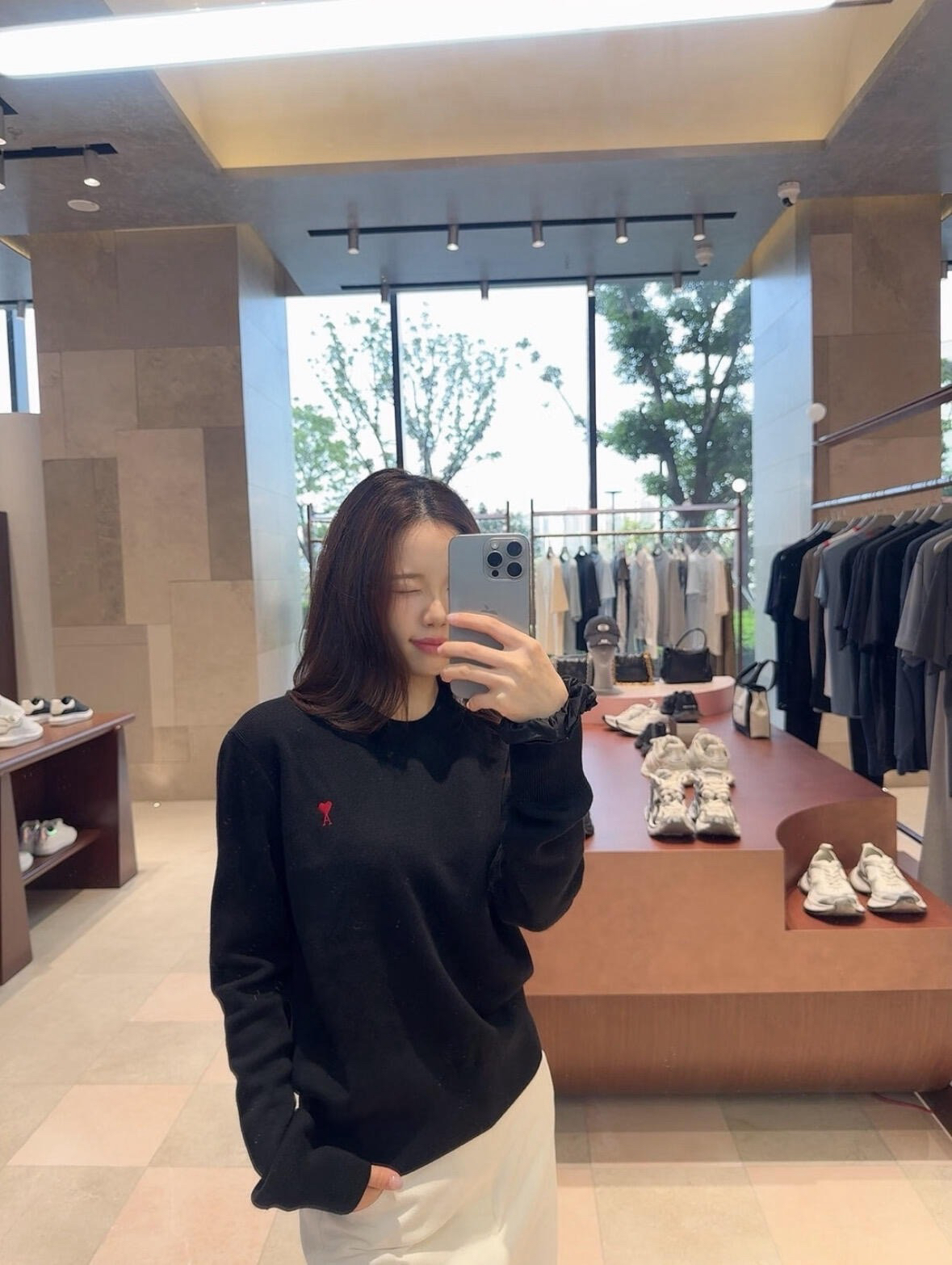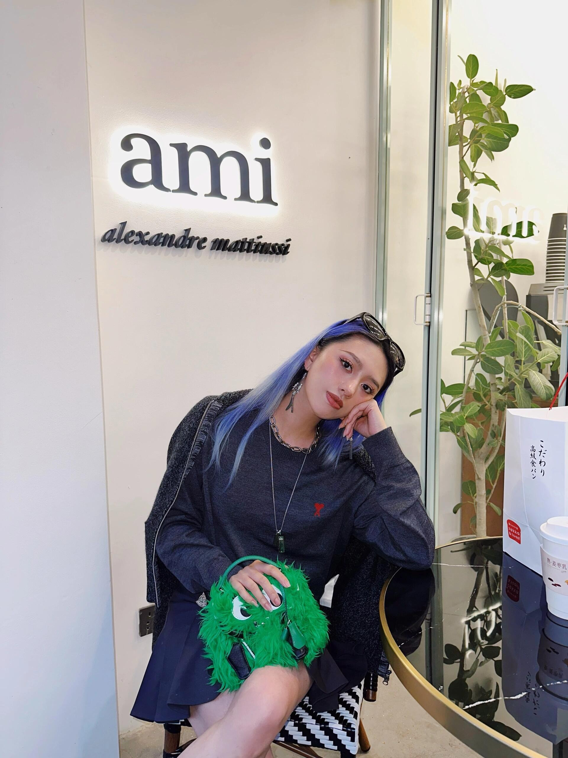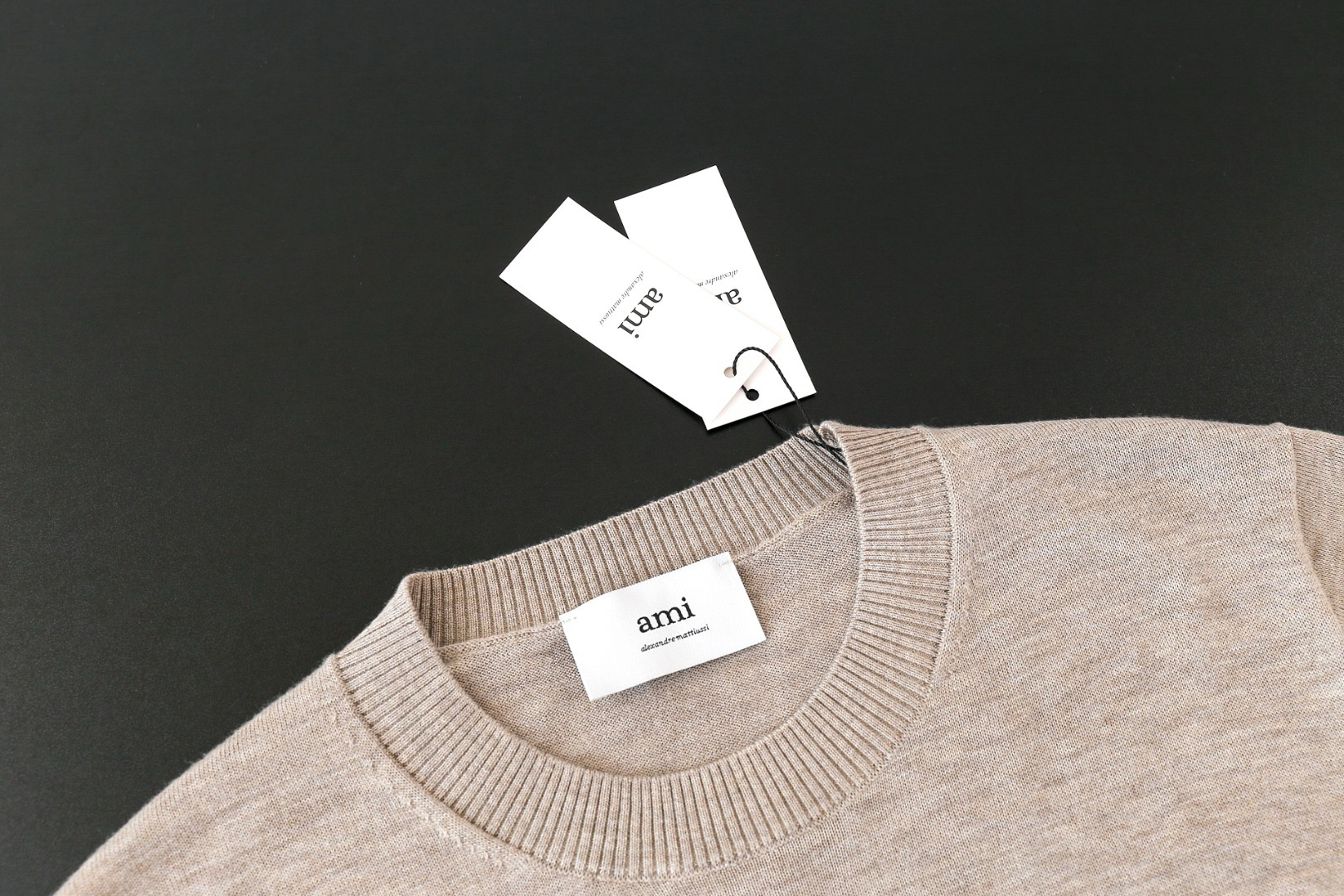 胸前刺绣AMI经典的爱心图案,图案采用进口百灵达链式爱心刺绣,表面呈精细的链条纹理,立体感强,高针数刺绣紧密不透
