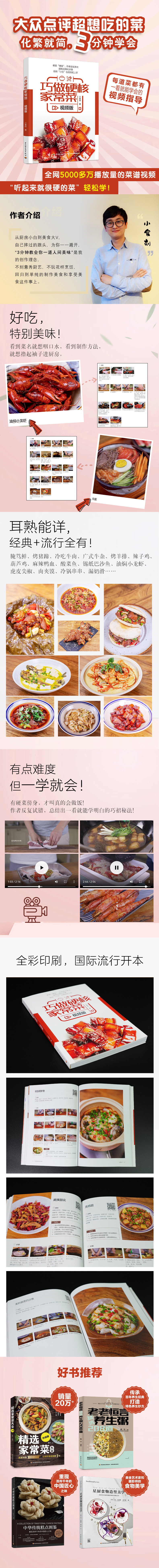 “不刻意秀厨艺,不玩花样烹饪,回归到单纯的制作美食和享受美食这件事上。在菜品的选择上以荤菜为主,区别于快手菜,选择有一定难度、‘听起来就很硬’的菜,通过我的烹饪方法将这些大菜、硬菜中的复杂步骤简化成读者能看明白、能学得会的教程,让每位想学习做菜的读者都能有所收获,让每位热爱美食的读者都能贴近美食的本质,这便是《巧做硬核家常菜视频版》的创作初衷以及核心竞争力。”小食刻老师当初是这样跟我说的。