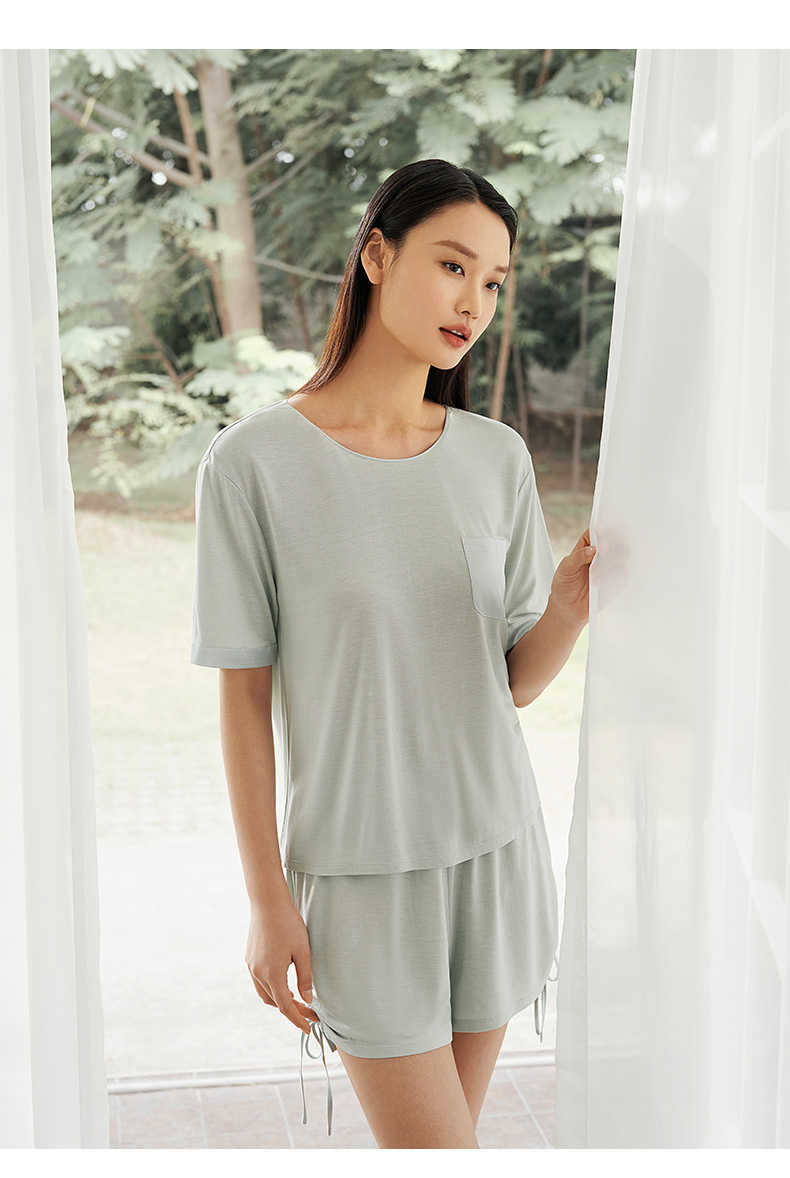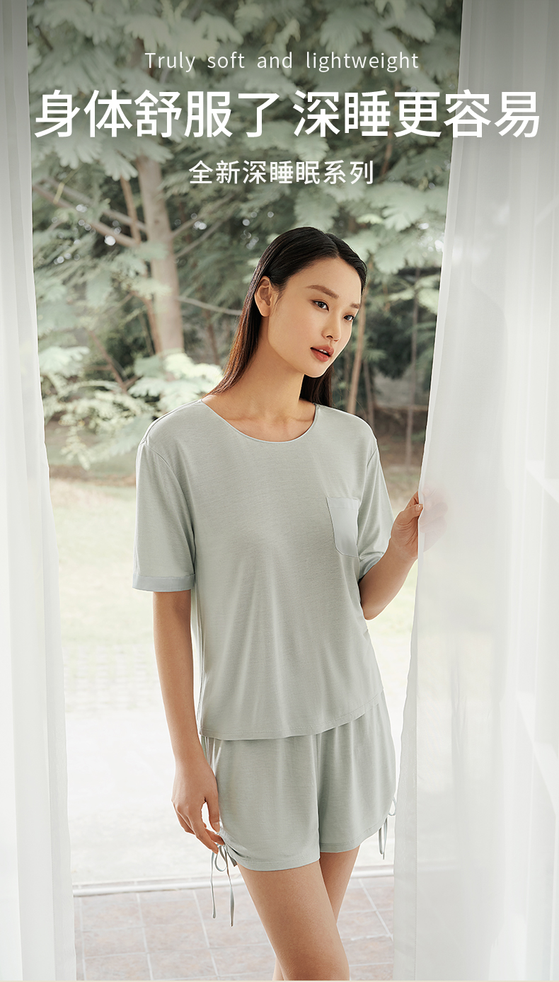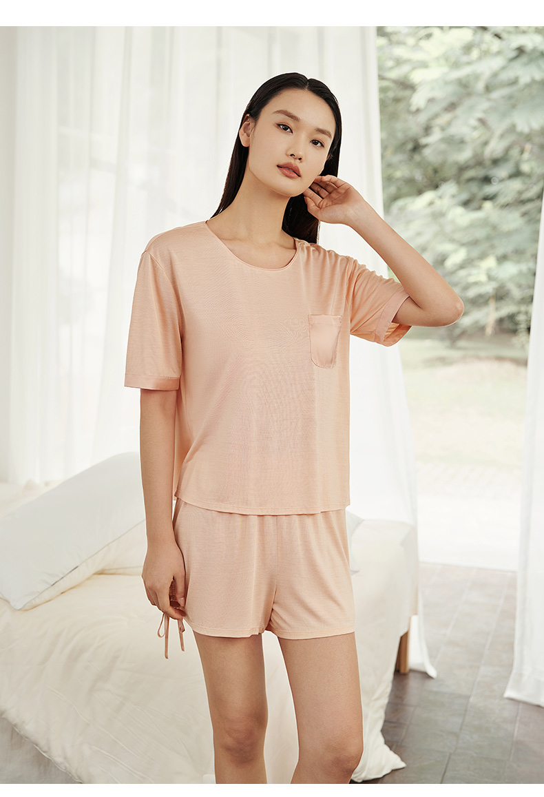 【深睡眠蚕丝睡衣】100%桑蚕丝女真丝针织家居服女短袖衣裤套金三塔 YZFEA402