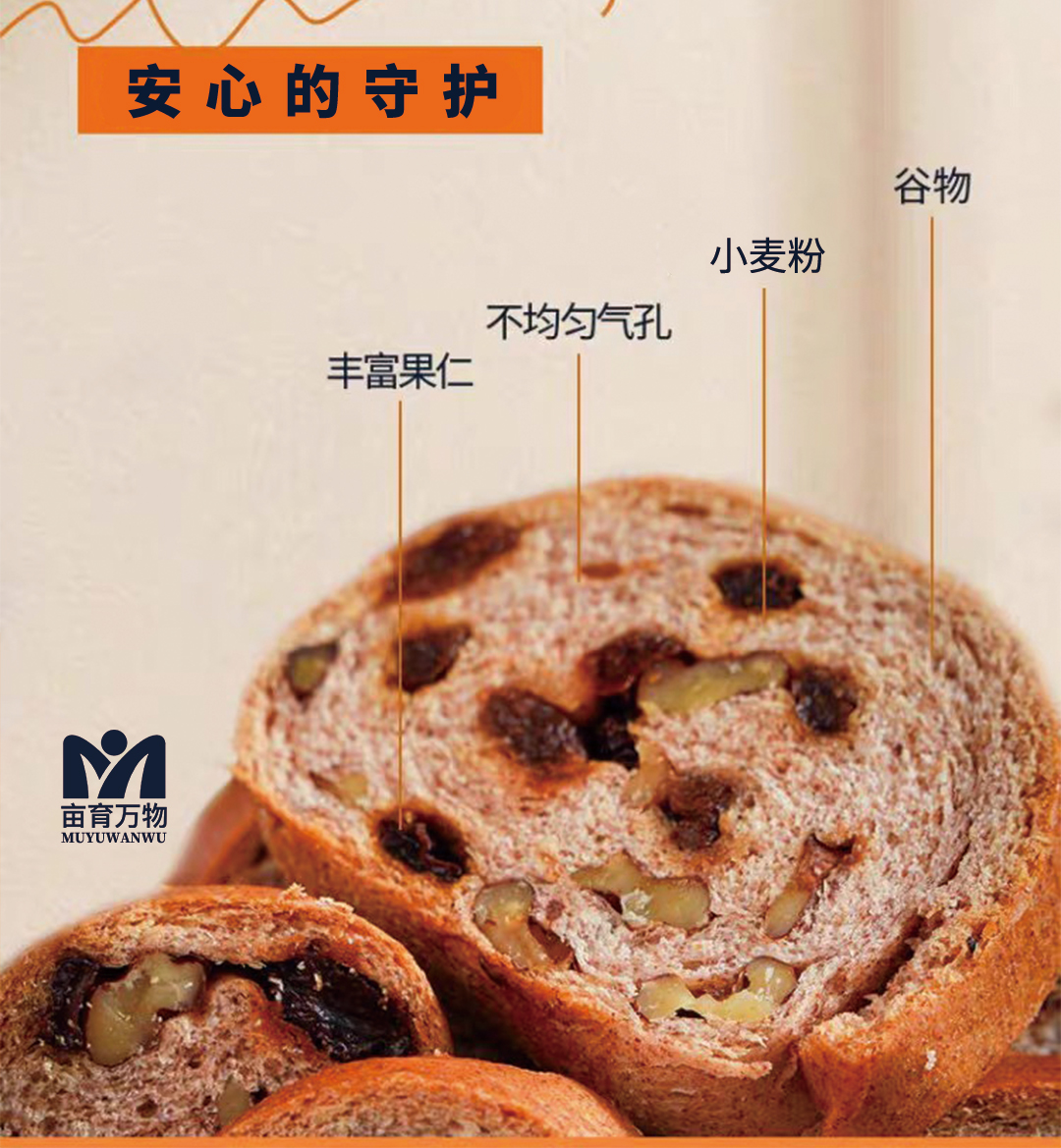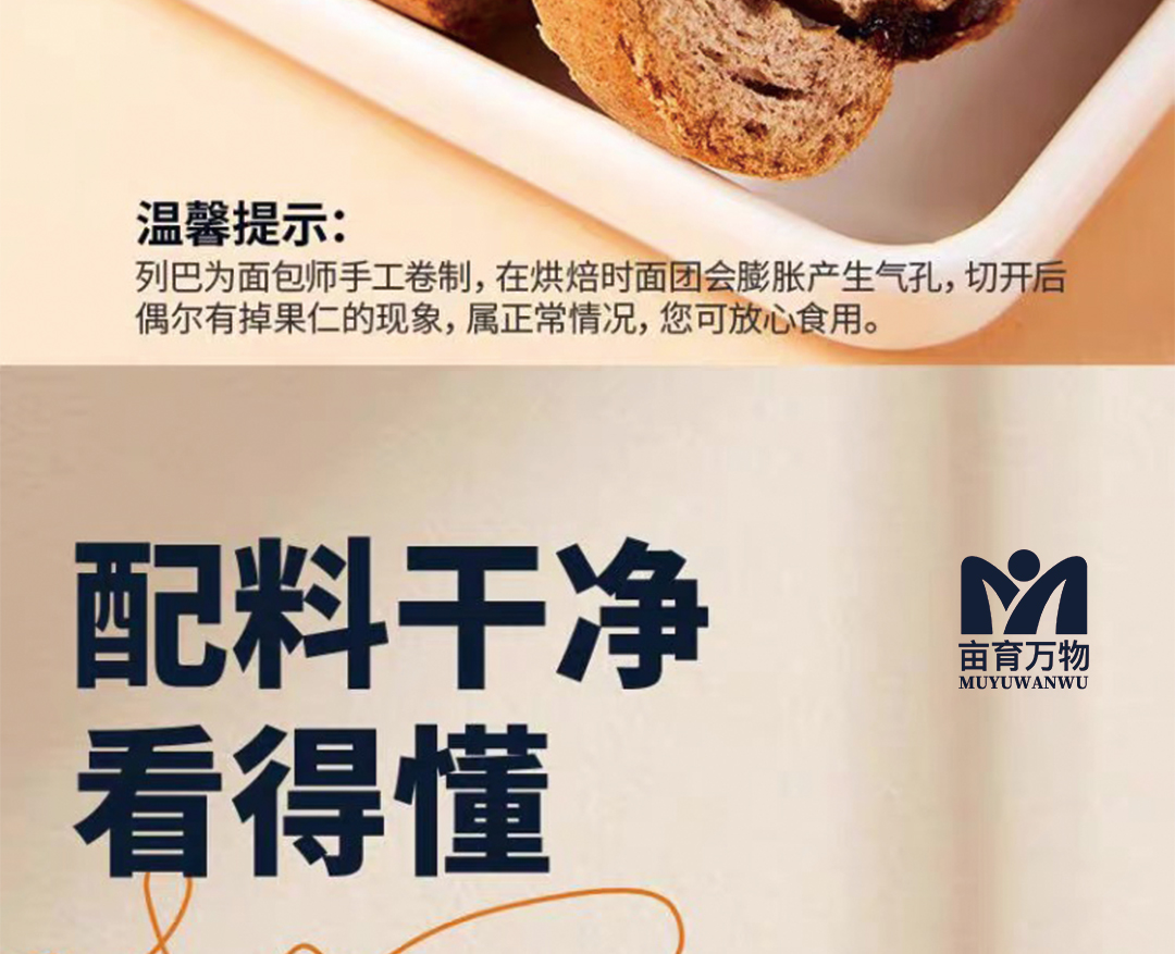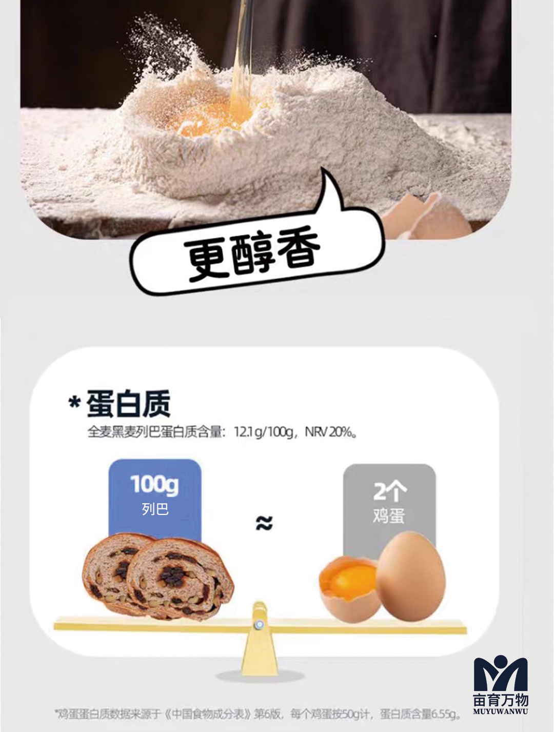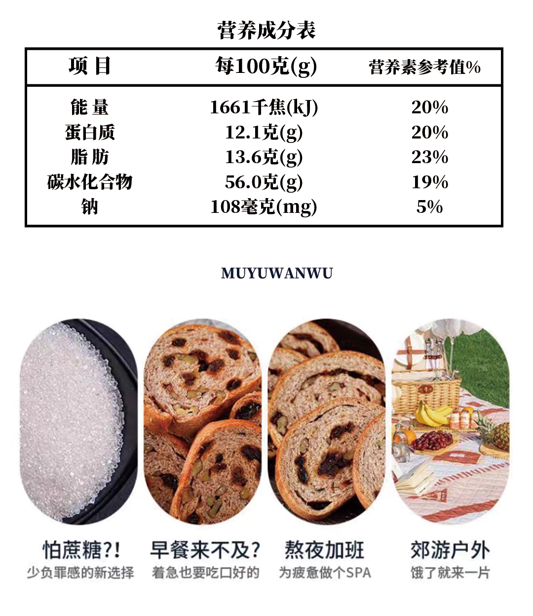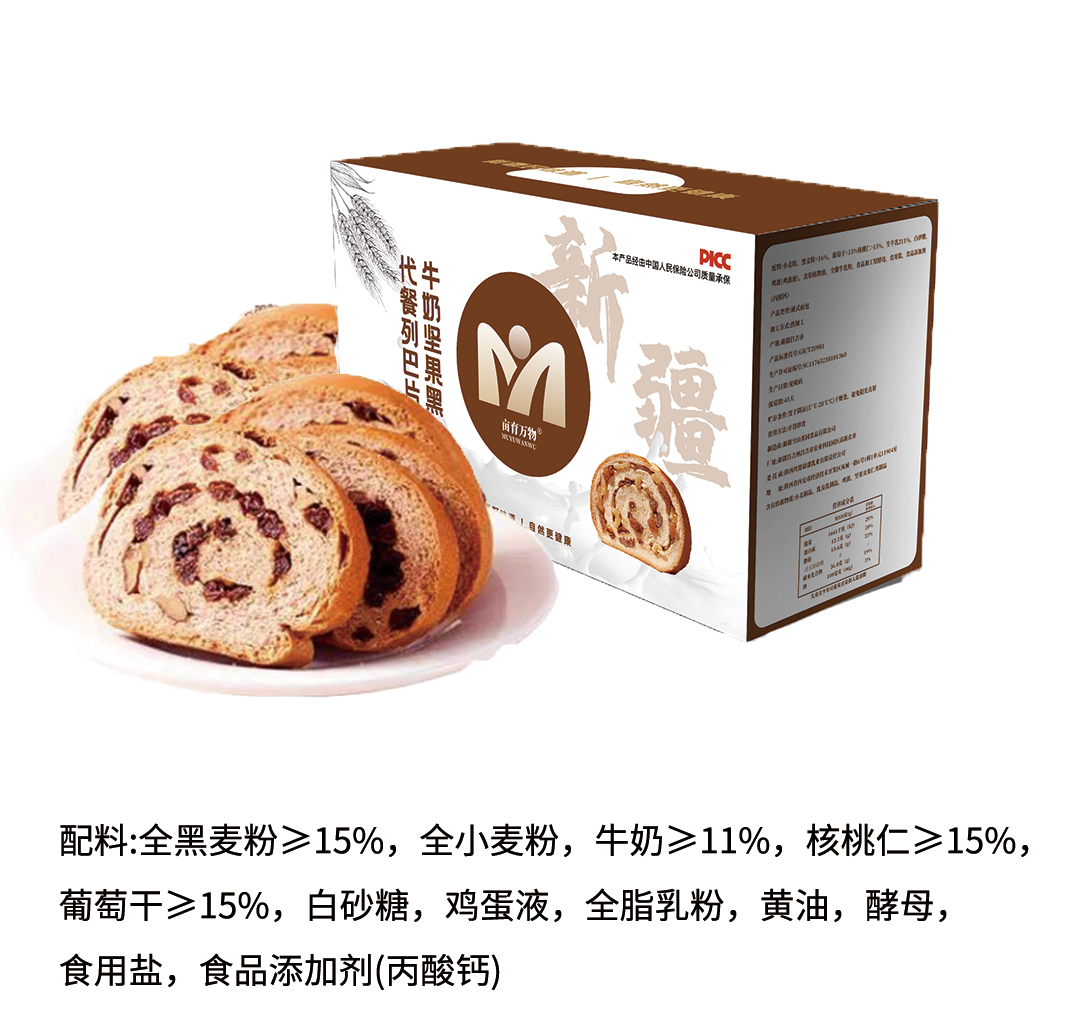 【配料表】黑麦粉,全小麦粉,牛奶,葡萄干,核桃仁,白砂糖,鸡蛋,全脂乳粉,黄油,酵母,食用盐,食品添加剂(丙酸钙)