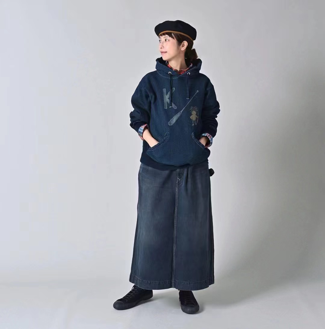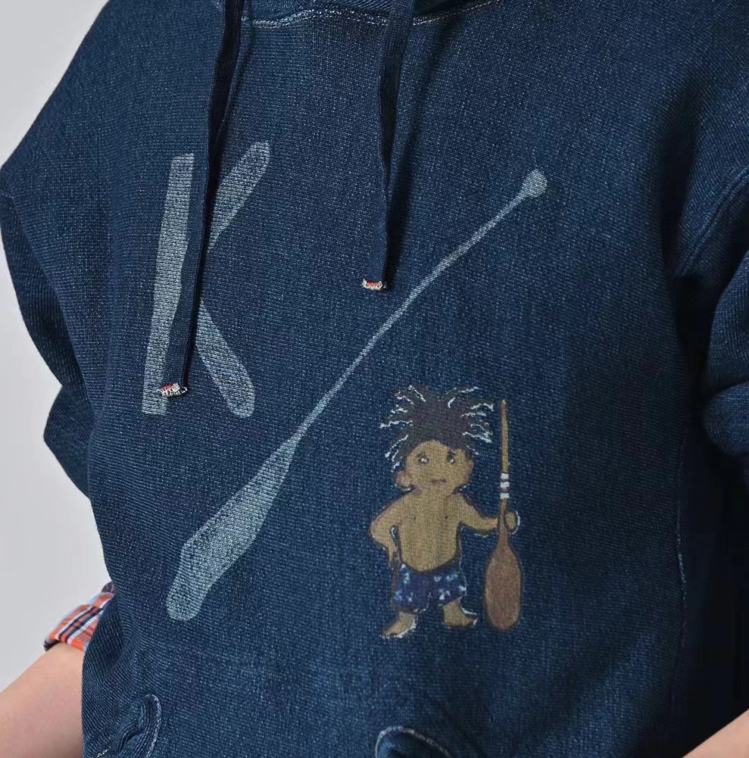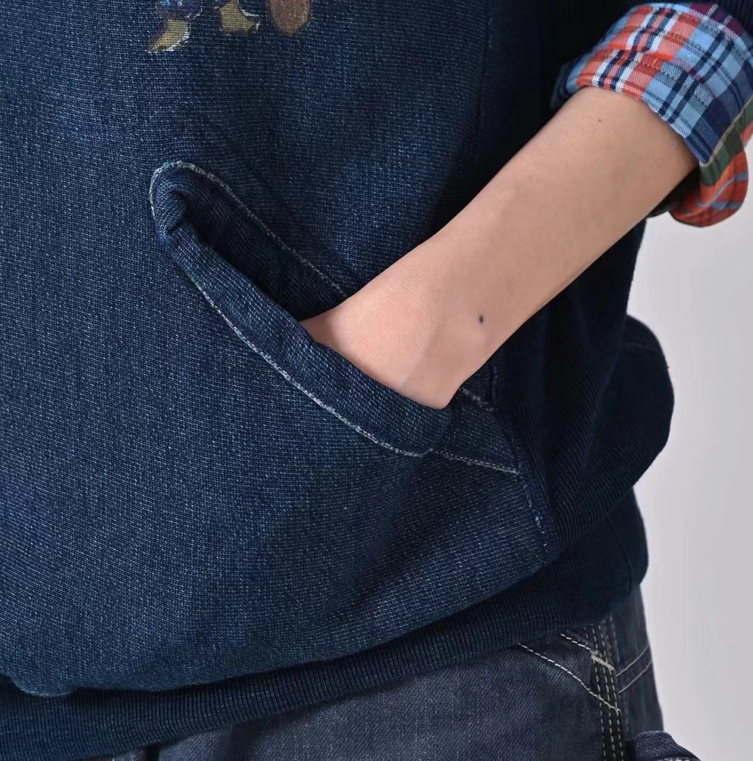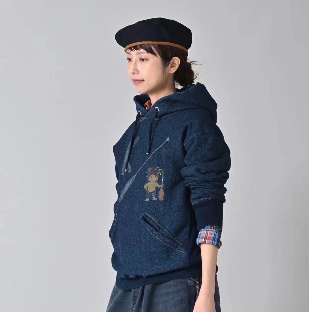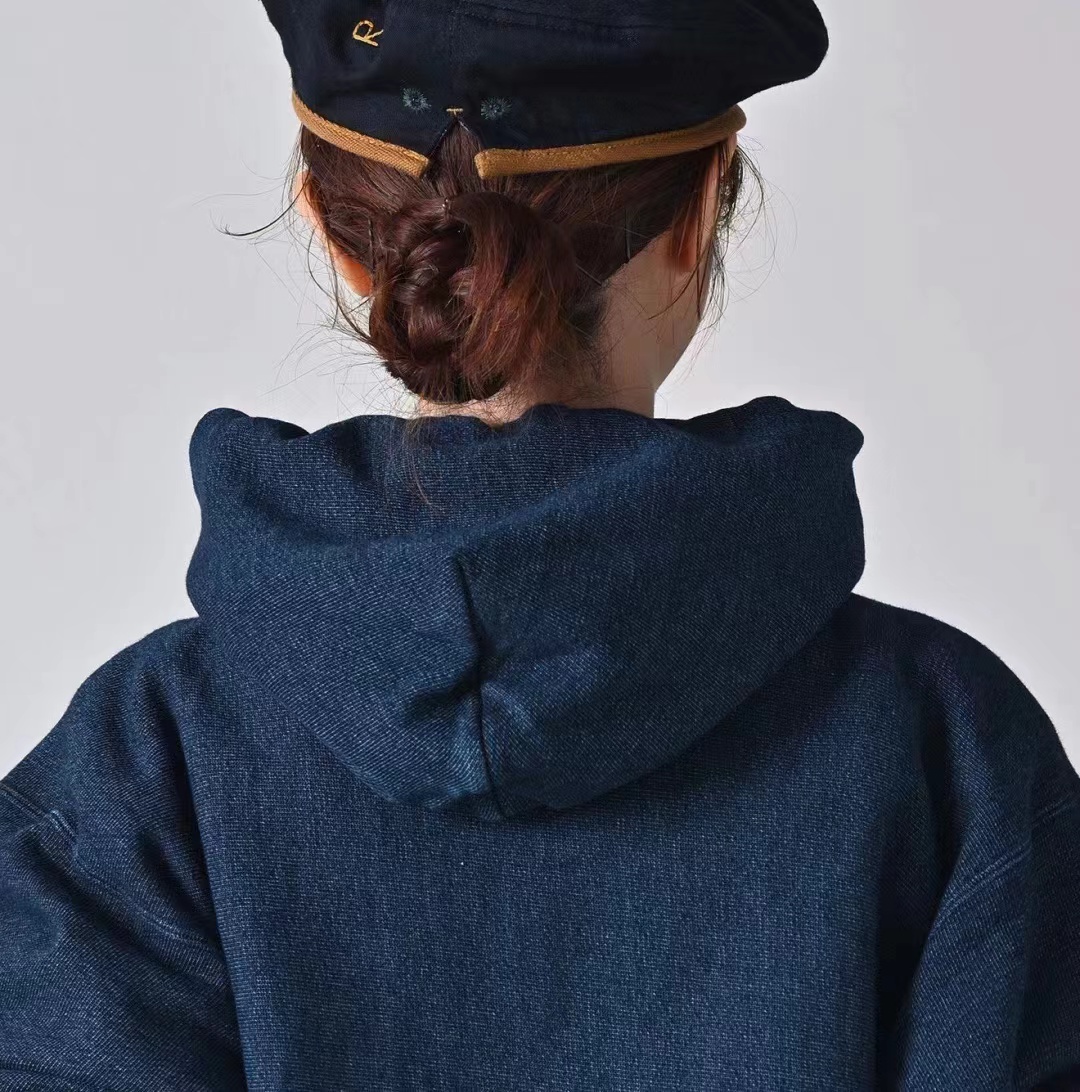 靛蓝侧拼罗纹划桨图案插兜连帽卫衣 原版靛蓝面料棉花和纺纱端定竹节+平纱+内圈3路混纺原版面料 特定机种织布 营造松弛感面料表面纹理 面料里侧微起绒 多次过水环烘后形成特有风格 配套双纱混纺微粗针罗纹 整体慵懒风+松弛感 侧拼罗纹 前印花 后里侧印花刺绣