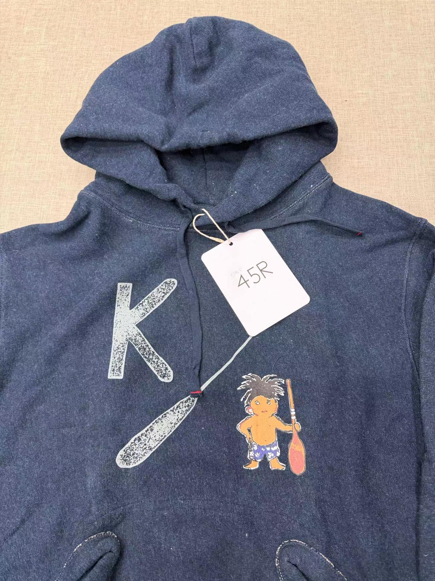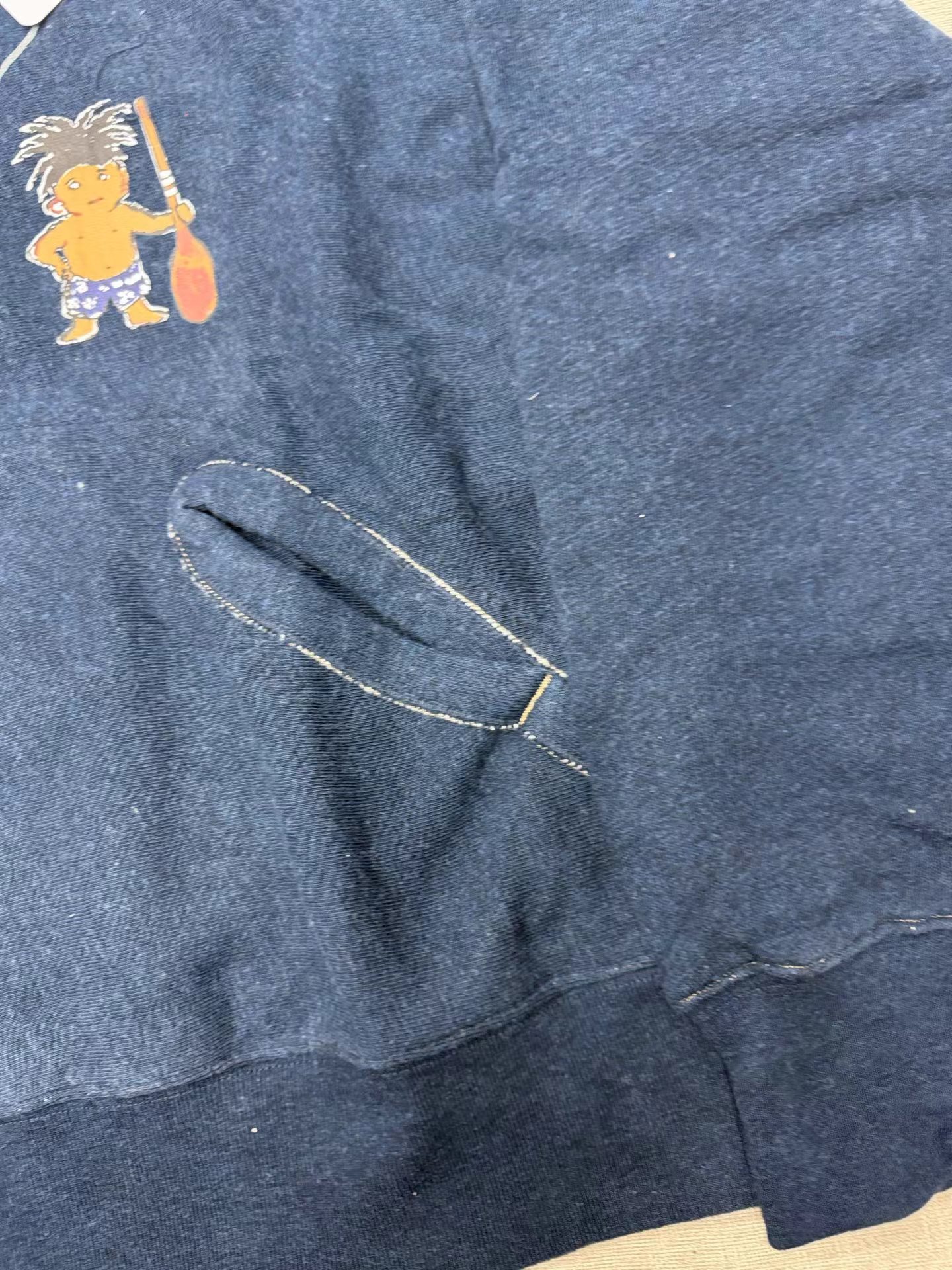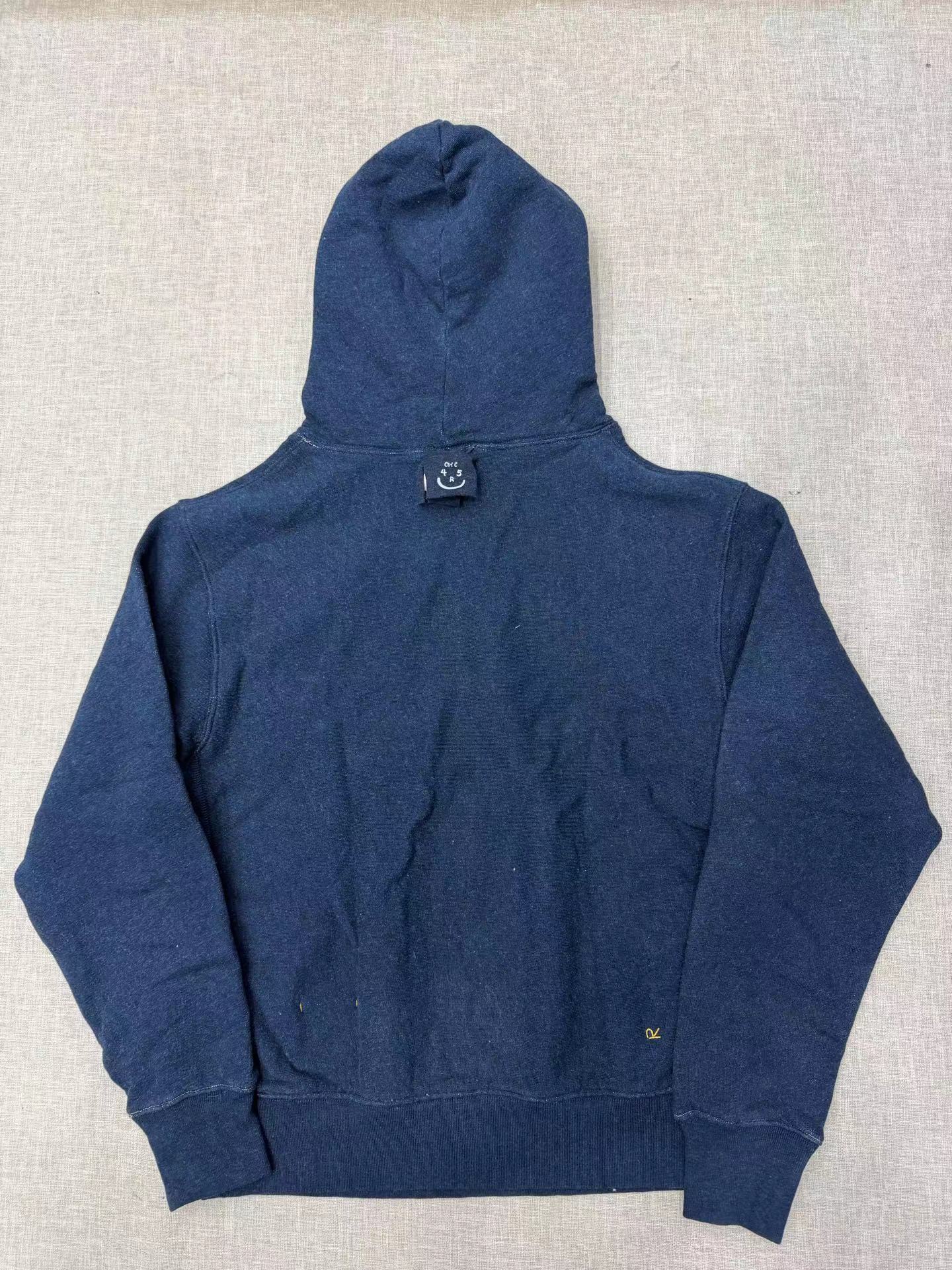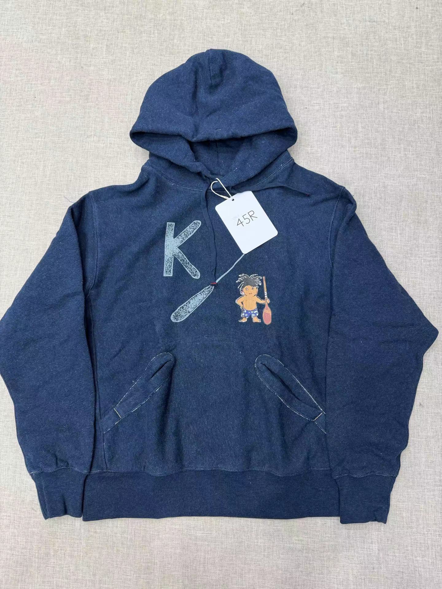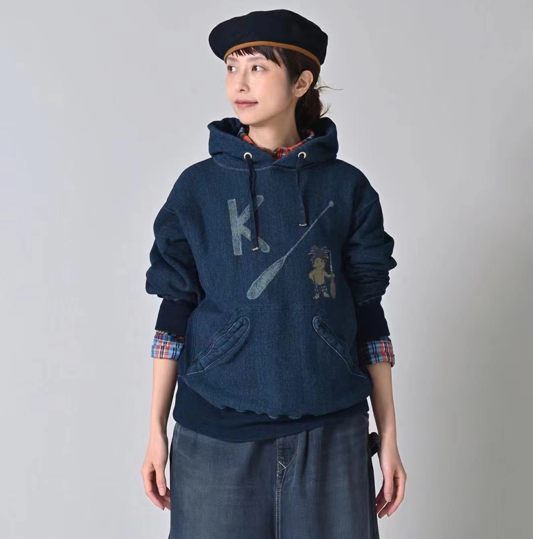 靛蓝侧拼罗纹划桨图案插兜连帽卫衣 原版靛蓝面料棉花和纺纱端定竹节+平纱+内圈3路混纺原版面料 特定机种织布 营造松弛感面料表面纹理 面料里侧微起绒 多次过水环烘后形成特有风格 配套双纱混纺微粗针罗纹 整体慵懒风+松弛感 侧拼罗纹 前印花 后里侧印花刺绣