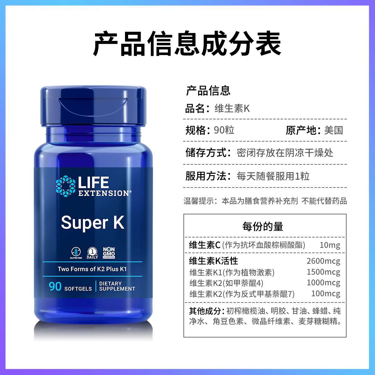 【效期 2026年5月】沿寿LIFE EXTENSION Super K(维生素K)90粒
