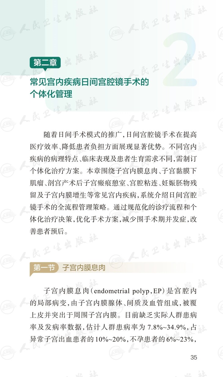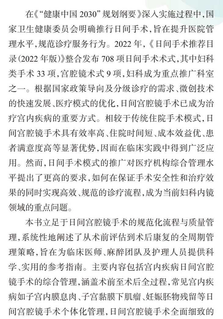 1.《日间宫腔镜手术规范化流程与质量管理》一书聚焦日间模式下宫腔镜手术的标准化操作与全程质量控制,系统阐述了从术前评估到术后康复的全周期管理策略。主要内容包括:宫内疾病日间宫腔镜手术的综合管理,覆盖术前至术后全流程;常见疾病如子宫内膜息肉、子宫黏膜下肌瘤、妊娠胚物残留等的个体化手术方案;全面细致的麻醉管理;以及护理操作与质量控制要点。致力于帮助医疗团队建立高效、安全的日间手术流程。