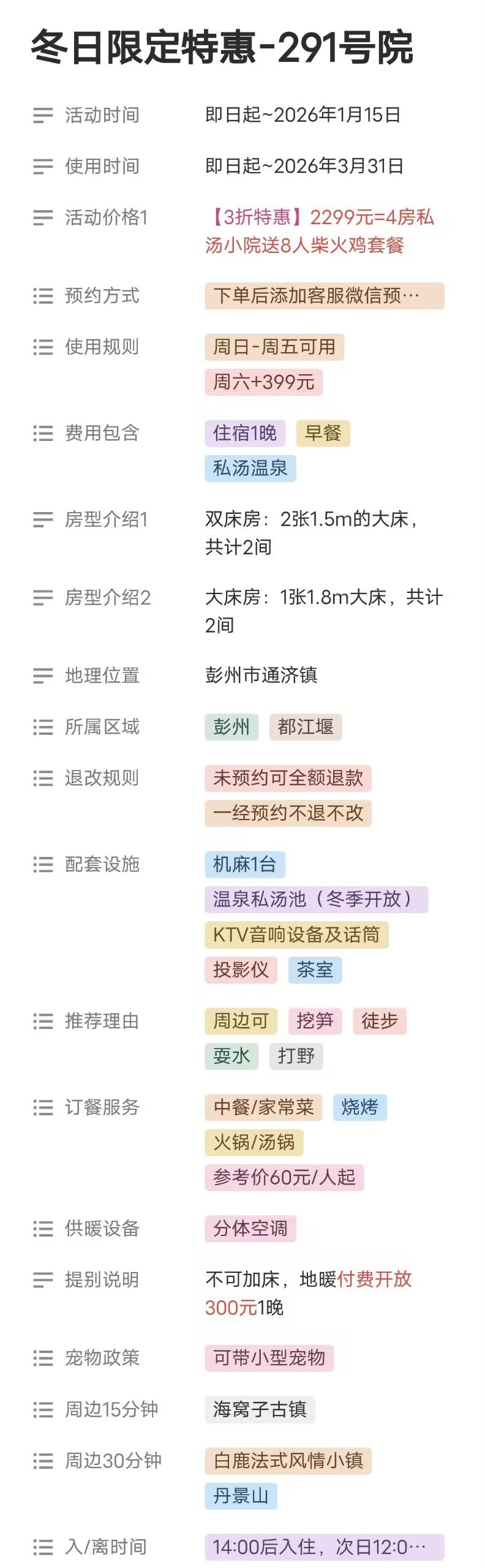 【觅趣·冬日限定】2299元=4房温泉私汤小院,送2餐,住宿+早餐+晚餐(柴火鸡)冬日壁炉烤火、冬季挖笋,K歌、草坪、近鱼凫湿地、海窝子古镇、通济花海,临溪靠山,开启童话自然之旅-彭州291号院gl