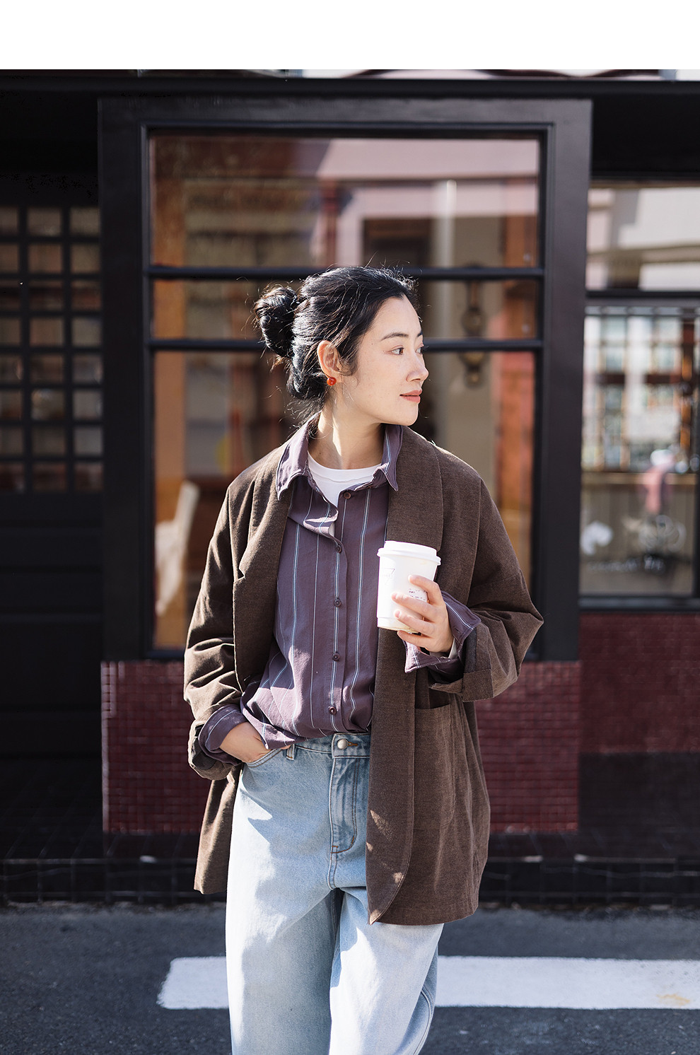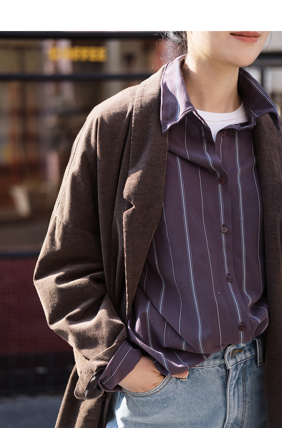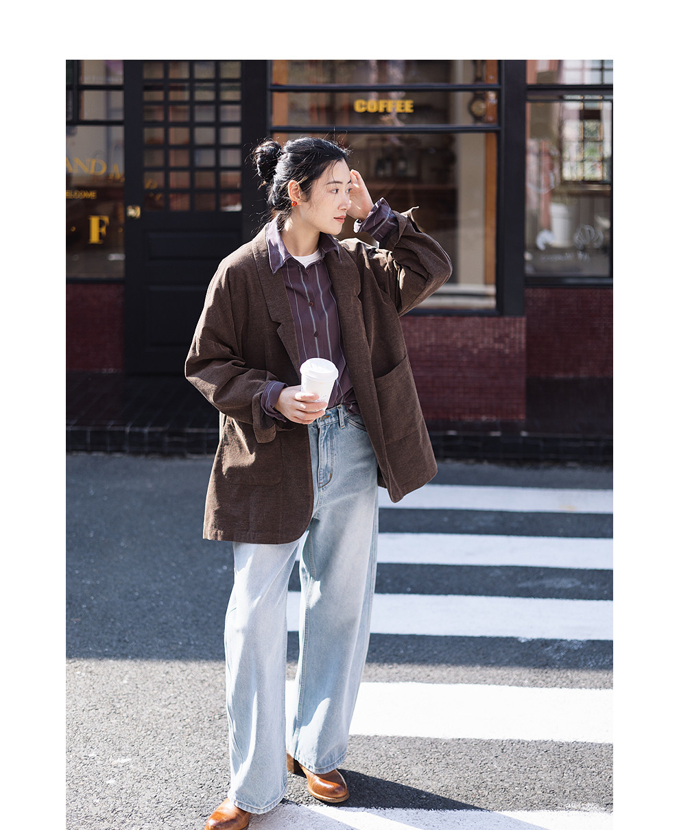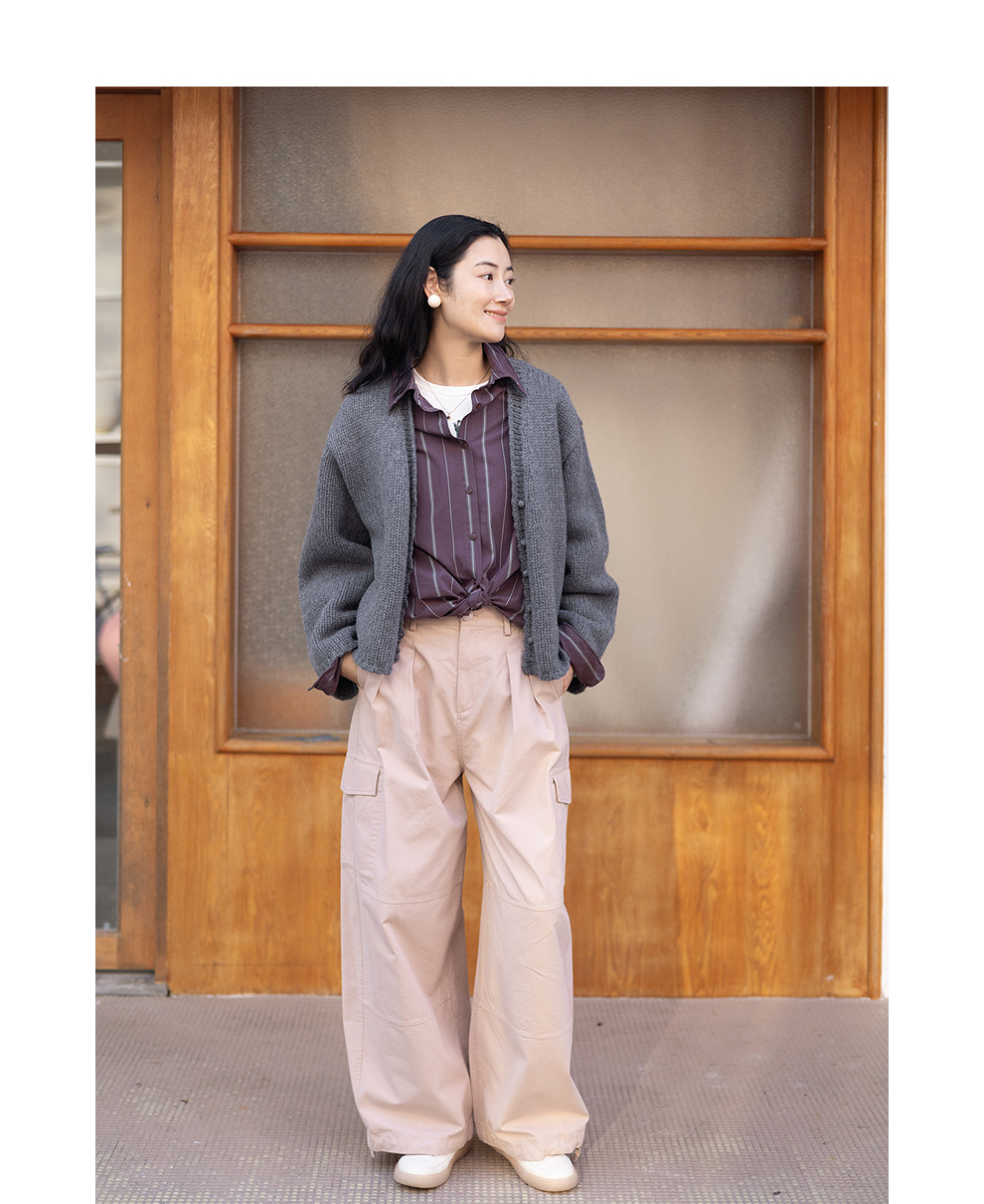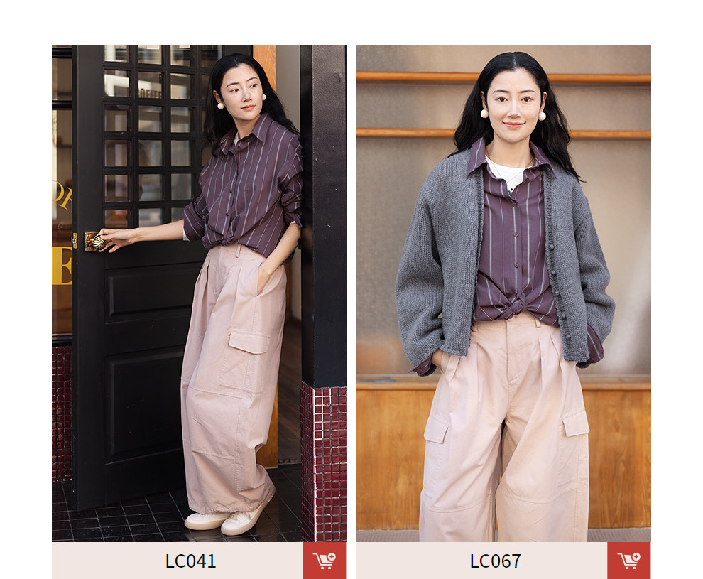 绽放053朵/沙感长绒棉盐缩条纹鱼骨设计长袖衬衫女春新款百搭上衣