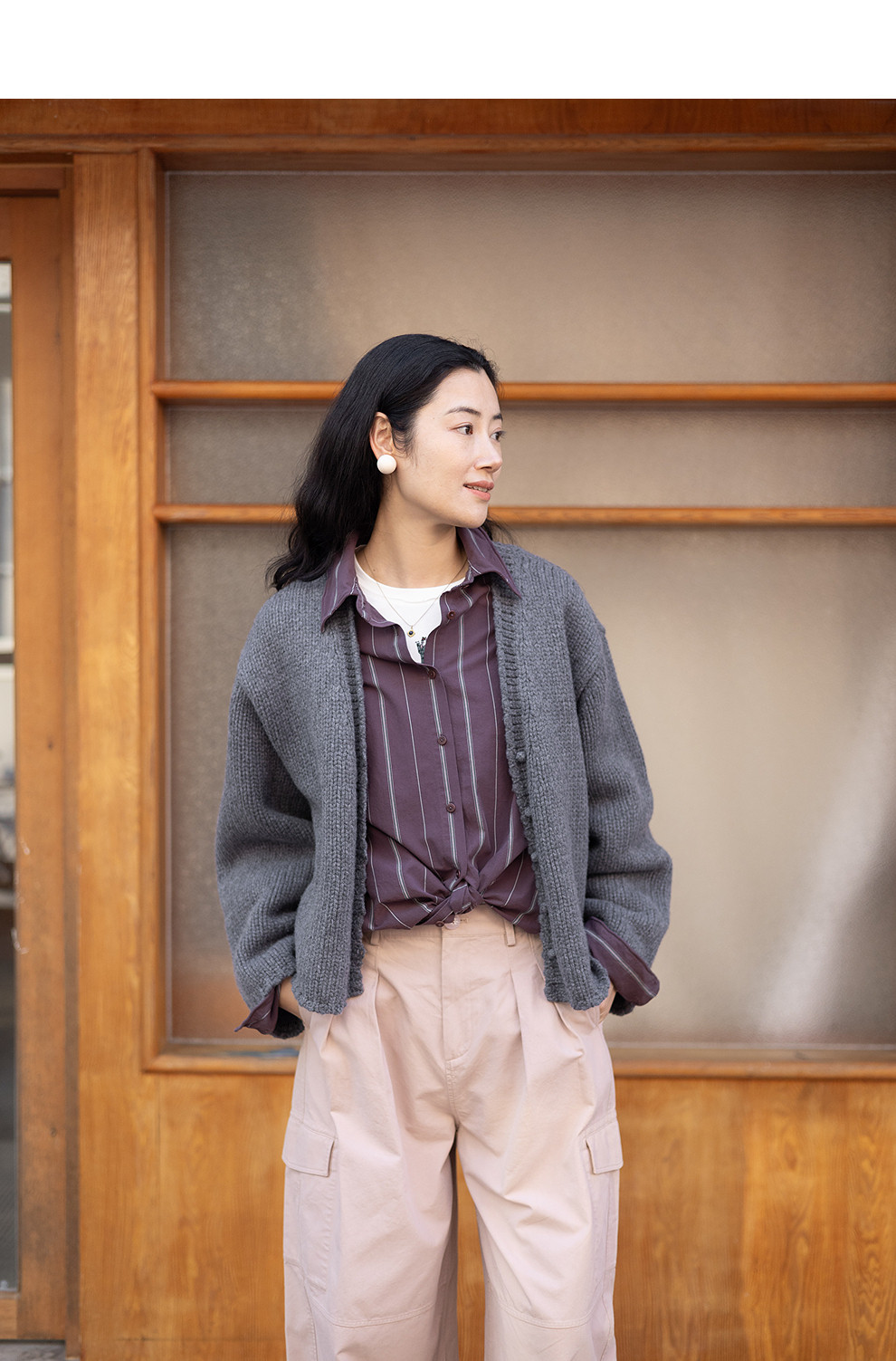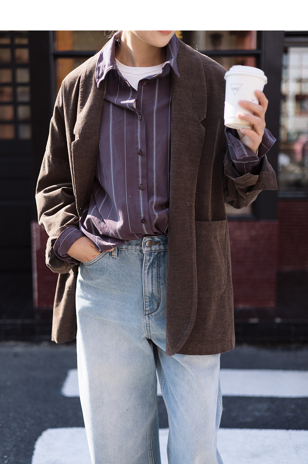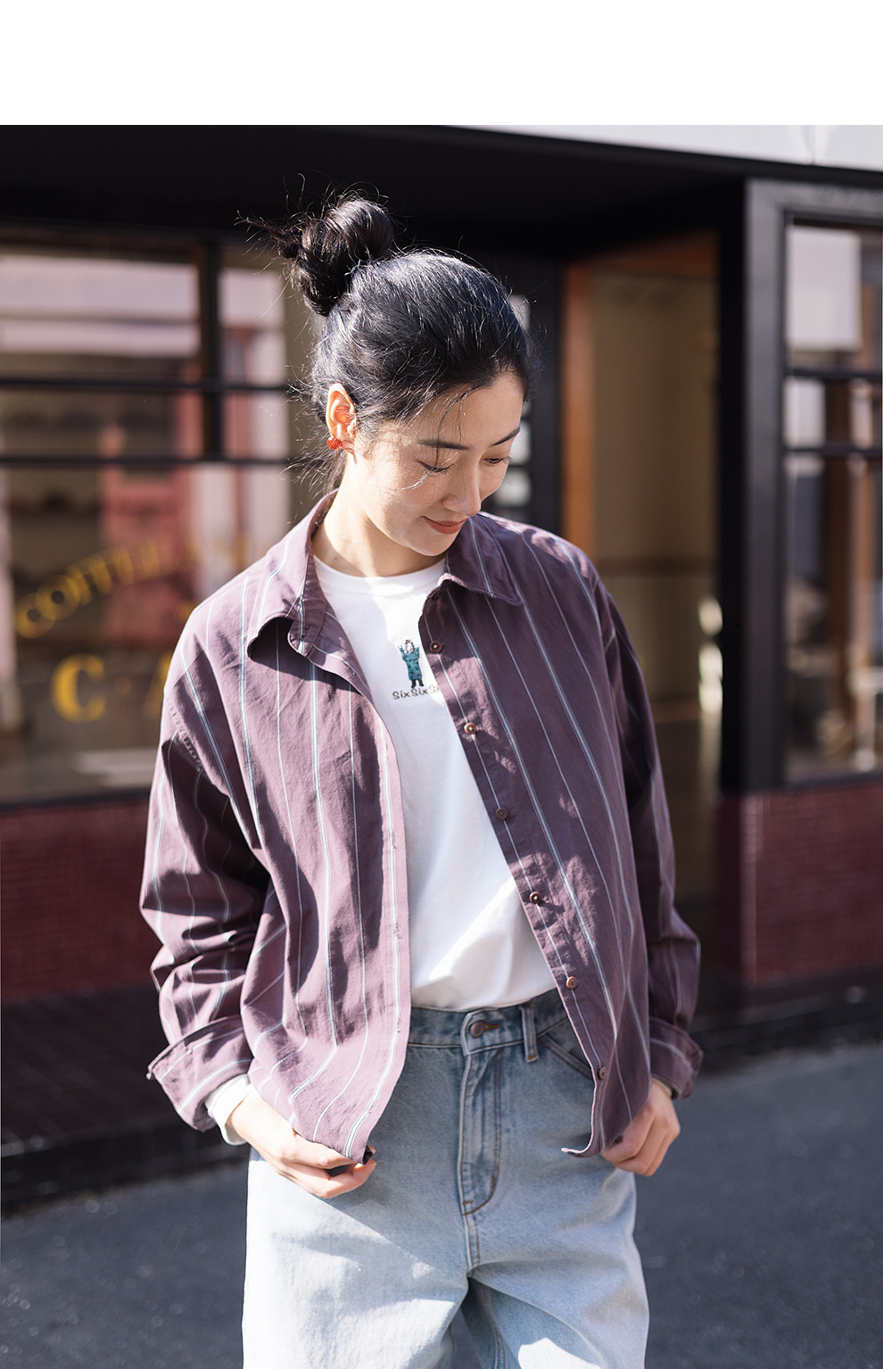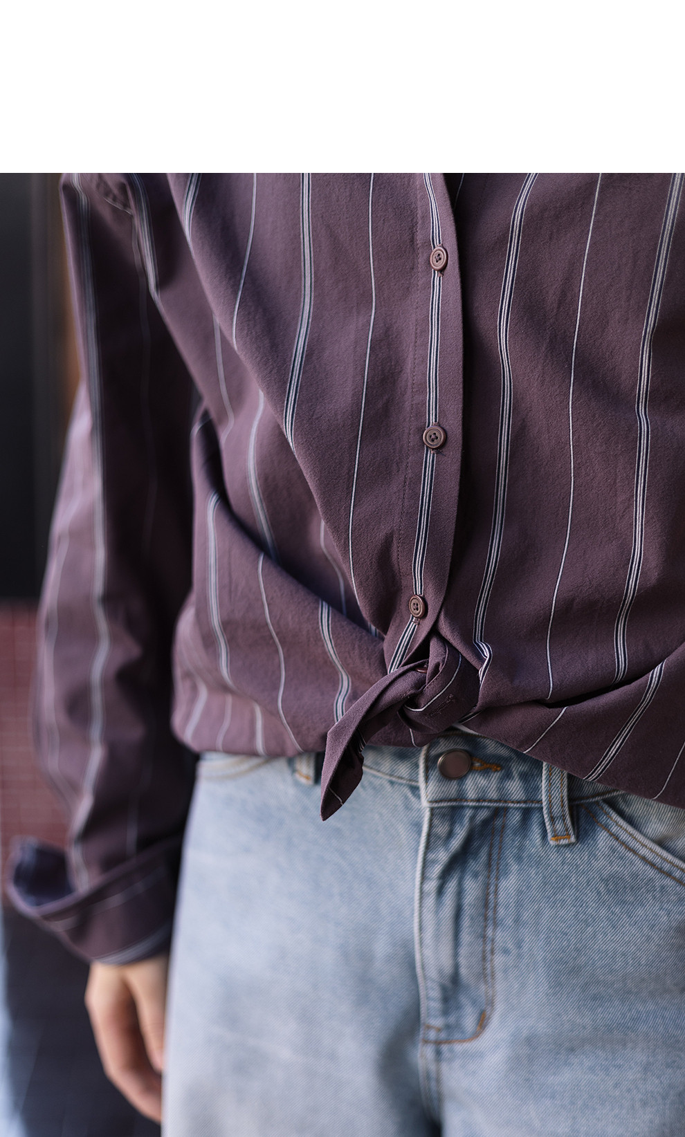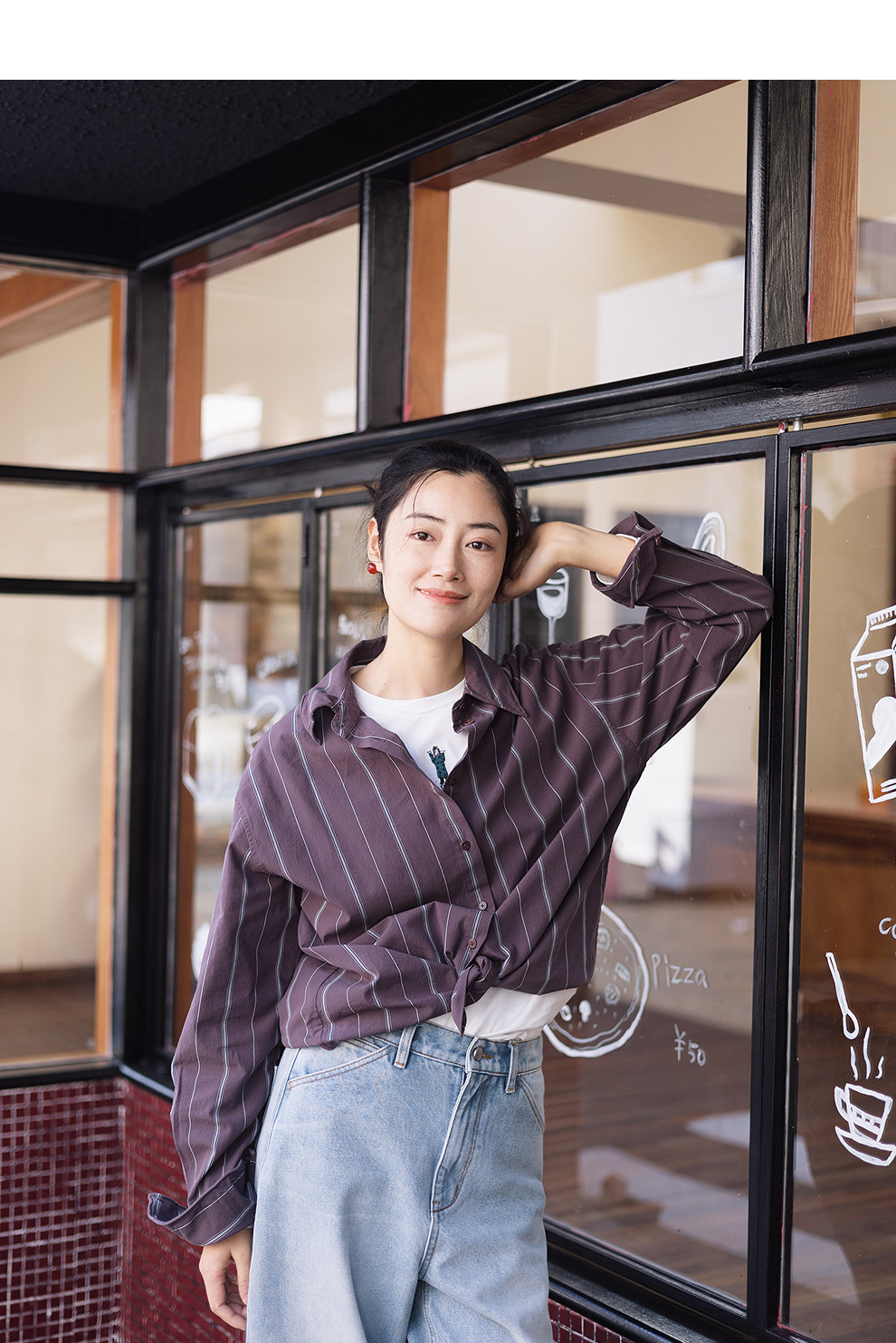 绽放053朵/沙感长绒棉盐缩条纹鱼骨设计长袖衬衫女春新款百搭上衣