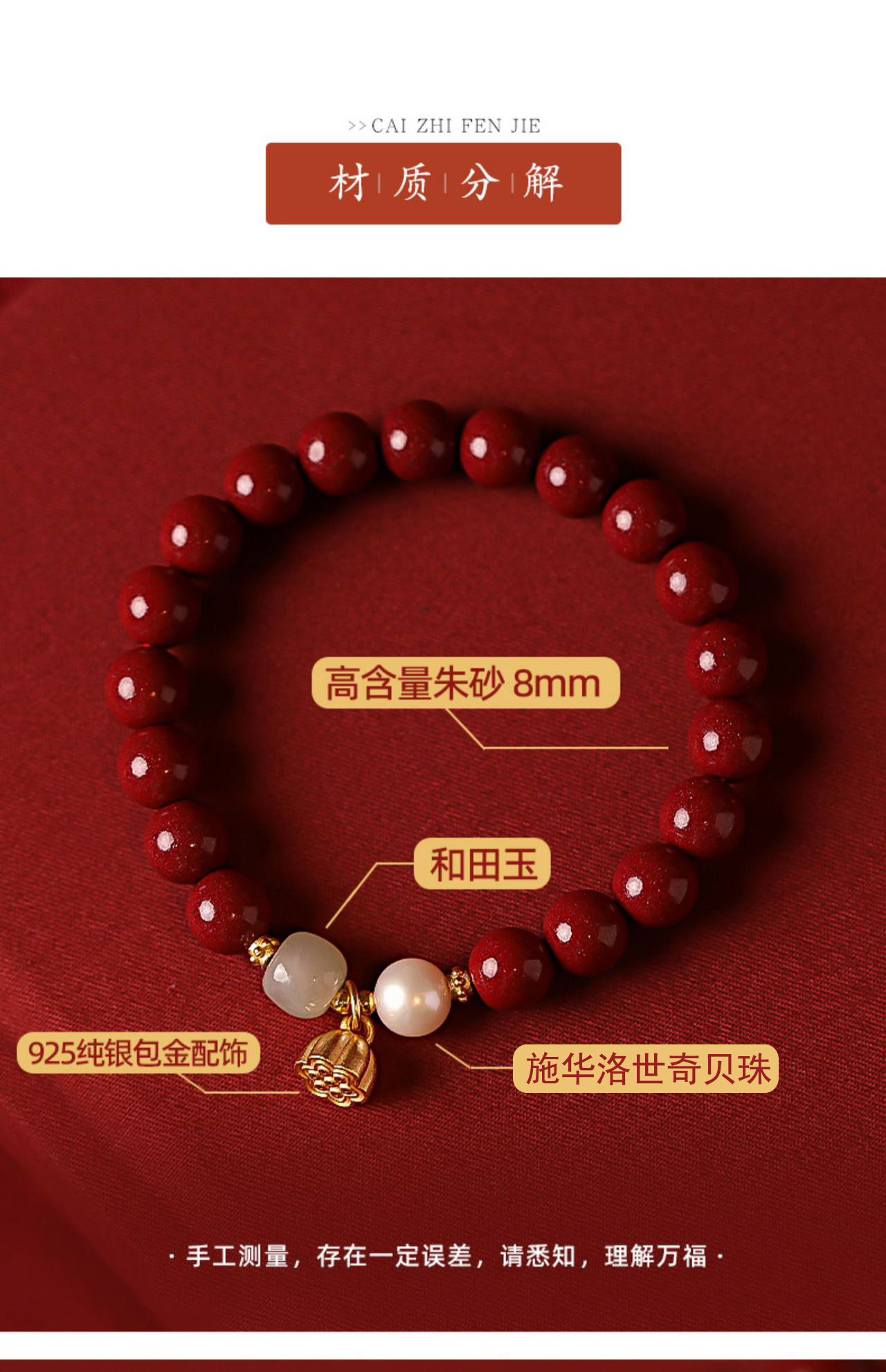 【品名】:【买一送一】 BAOFANDI宝梵迪古法传承朱砂和田玉手链 【发货物流】:圆通 【发货时效】:72小时 【合并发货扣减运费吗?】:否 【物流拦截费用】:不需要 【不发货区域(除疫情区外,偏远地区发不发货)】:海外 港澳台 【加运费区域(偏远地区或者其他地区是否加运费)】:新疆、西藏、青海、宁夏+5 【 售后标准(支不支持7天无理由退换货等)是否扣发出运费】:支持7天无理由 ,但是撕掉标签后不能售后,试戴不要撕毁标签!;产品有问题请在签收48小时内,带快递面单产品图片按售后处理,超时不予处理望谅解~手串挂件生产批次不同款式/颜色可能会有点偏差,请以实物为准,介意者慎拍~需要扣除发货运费5元 【注意】:需送礼多加礼盒*1礼袋*1质保卡*1需要联系客服另加收5元 |