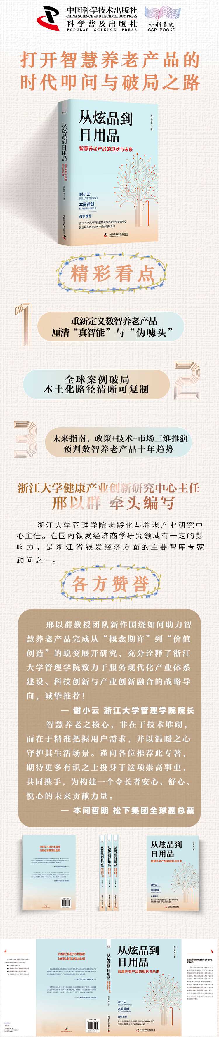 本书系统剖析了中国智慧养老产品的发展逻辑与实践路径。在人口老龄化加速(60岁以上人口超3.1亿)与;未富先老的双重压力下,传统养老服务面临护理人员缺口超百万、供需错配等严峻挑战。智慧养老产品通过技术赋能,以;设备平台服务三位一体模式重构养老场景:智能监测设备实现健康数据实时采集,智慧平台完成风险预警与资源调度,线上线下服务融合提供精准干预。本书通过对适老交互手机等案例的解析,提出破局路径:需求端需建立;用户画像精准分层,供给端需通过模块化开发降低成本,政策端需构建;普惠十特惠补贴体系,最终推动智慧养老从;技术炫示走向;需求驱动,实现科技温度与商业可持续的统一。