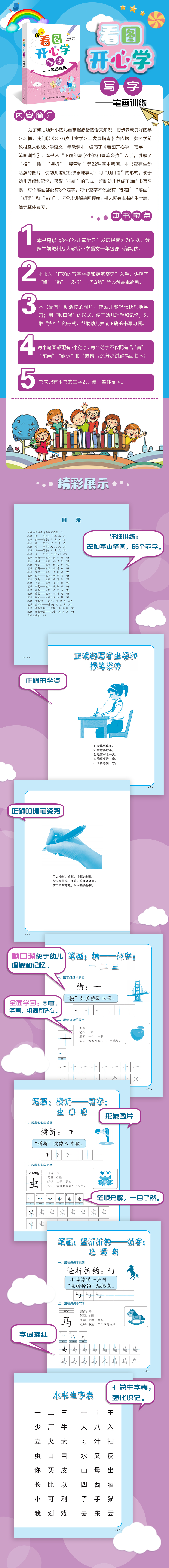 为了帮助幼升小的儿童掌握必备的语文知识,初步养成良好的学习习惯,我们以《3~6岁儿童学习与发展指南》为依据,参照学前教材及人教版小学语文一年级课本,编写了《看图开心学 写字——笔画训练》。本书从"正确的写字坐姿和握笔姿势”入手,讲解了"横”"撇”"竖折”"竖弯钩”等22种基本笔画。本书配有生动活泼的图片,使幼儿能轻松快乐地学习;用"顺口溜”的形式,便于幼儿理解和记忆;采取"描红”的形式,帮助幼儿养成正确的书写习惯;每个笔画都配有3个范字,每个范字不仅配有"部首”"笔画”"组词”和"造句”,还分步讲解笔画顺序;书末配有本书的生字表,便于整体复习。