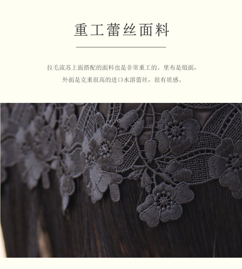 拉毛流苏上面搭配的面料也是非常重工的。里布是缎面,外面是克重很高的进口水溶蕾丝,很有质感。