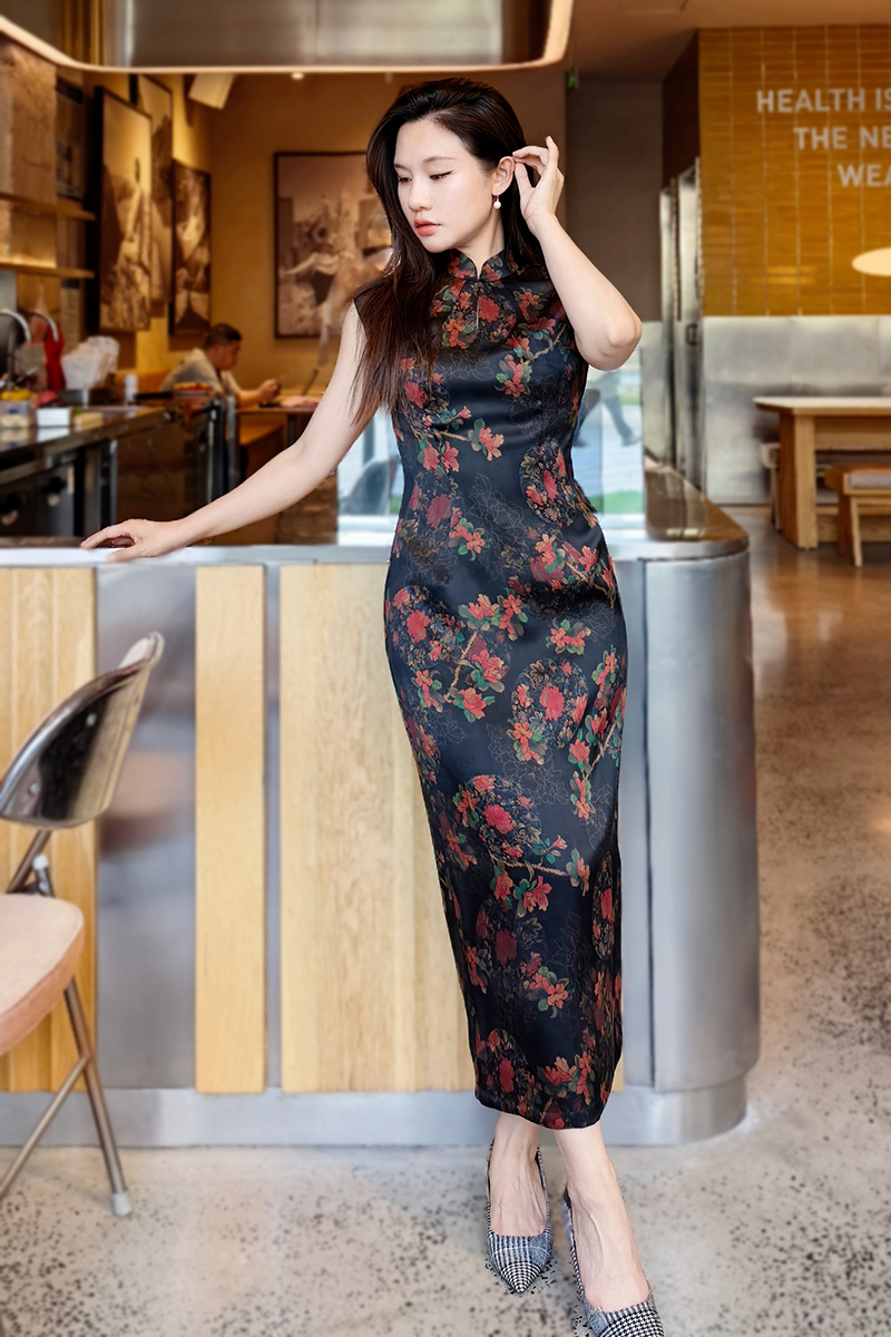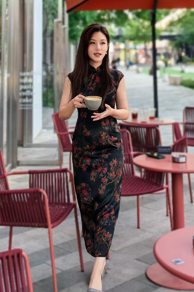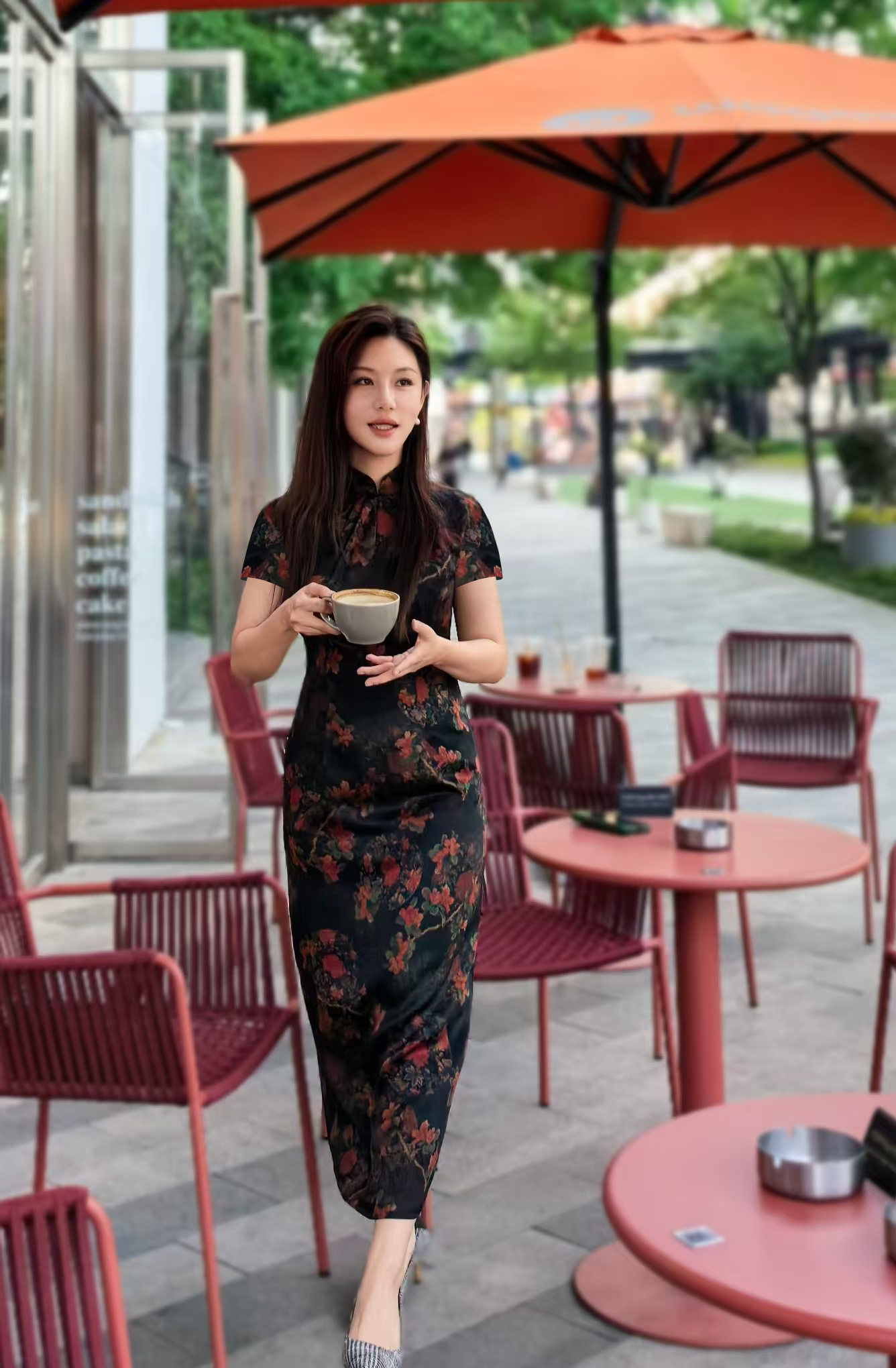 逸红颜明月优选<爆款二团>#28姆米香云纱旗袍「暗香」夜墨染花影,古色古香的牡丹花古董旗袍裙