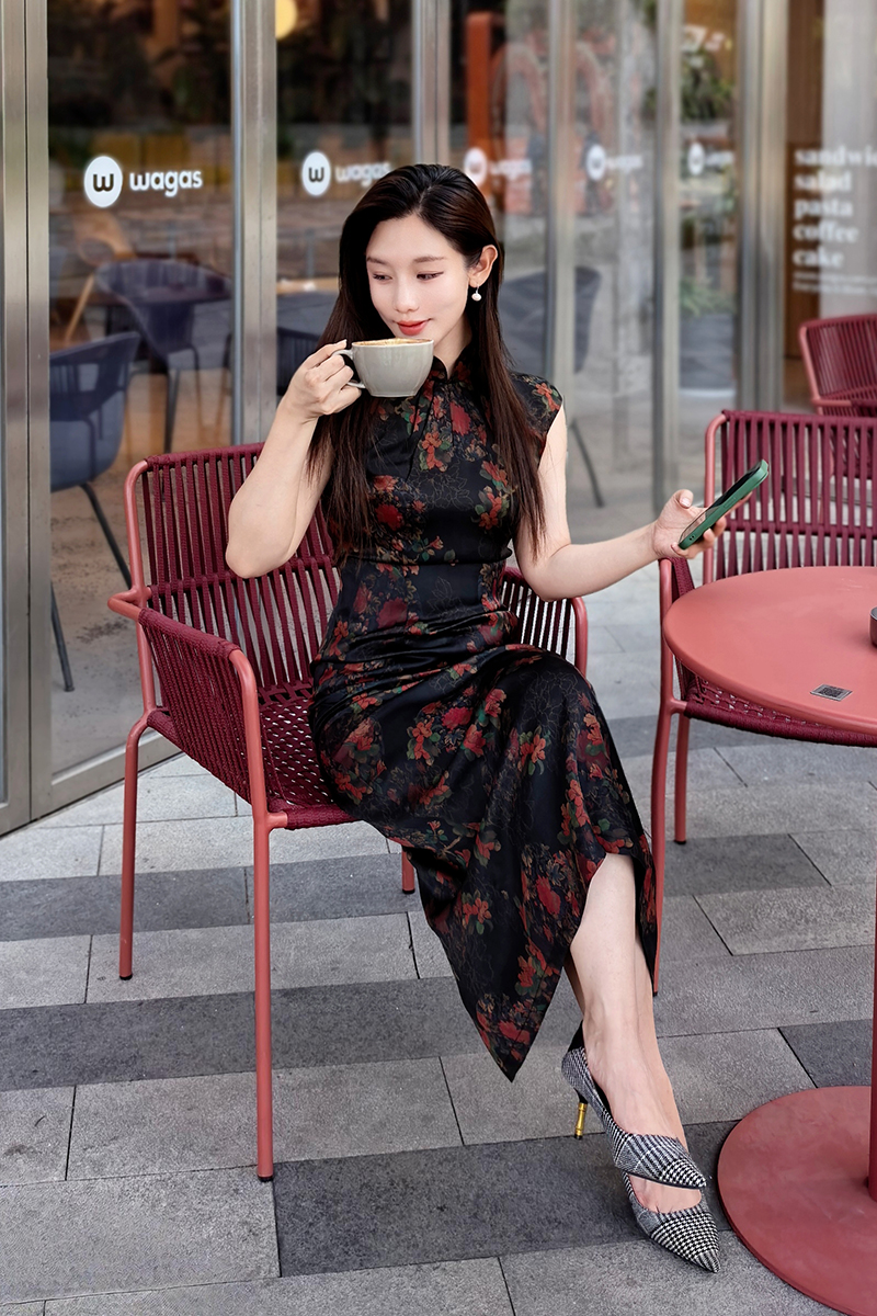 牡丹的炽烈被玄色云纱驯化成「浓妆淡抹总相宜」的雅致,墨色的沉肃又被朱红点染出「雪却输梅一段香」的灵动。