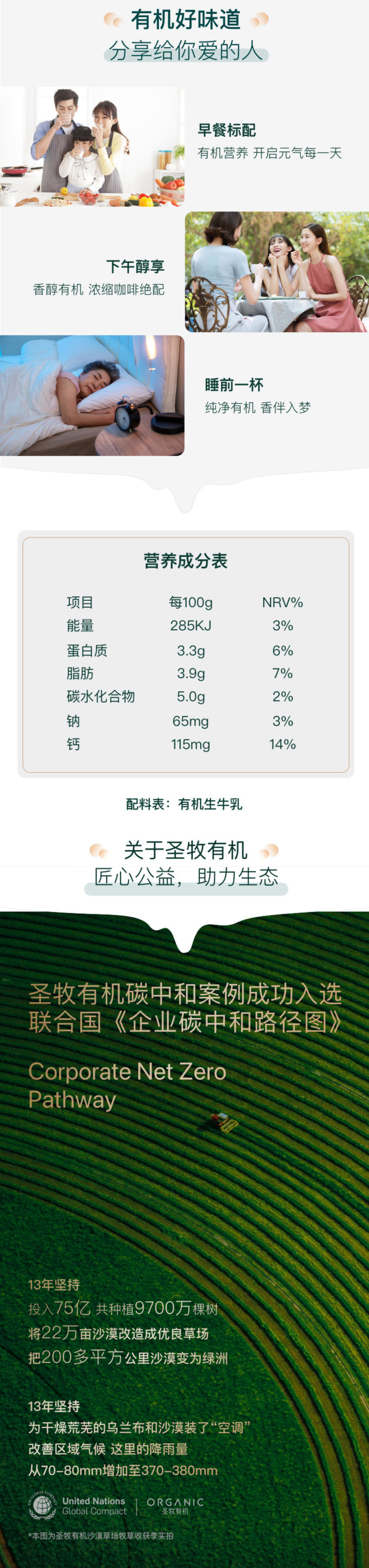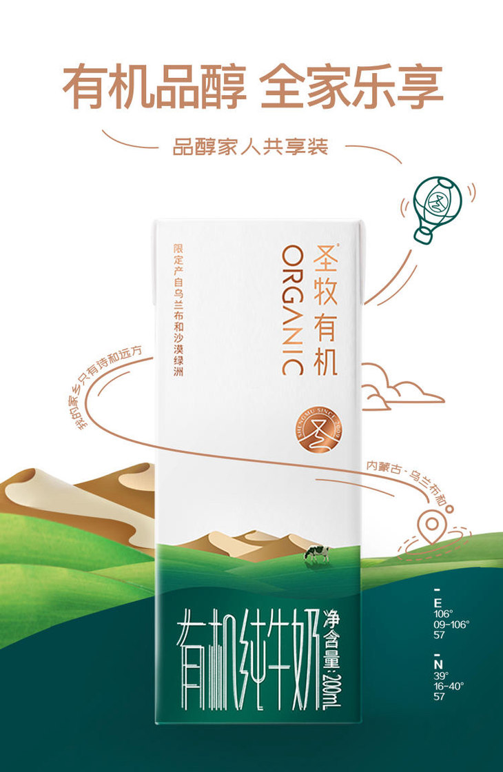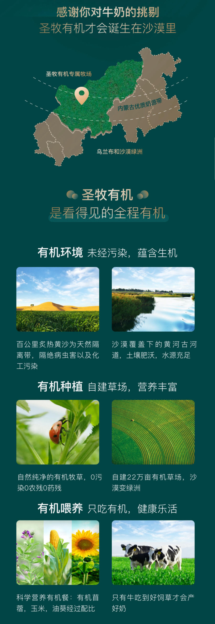 圣牧多年专注于研发适合国人的乳制品,采用天然新鲜原奶,确保每一口都是纯粹新鲜的牛奶滋味,是我国仅有的自有认证有机牧场乳品公司。在乌兰布和沙漠经过多年改造,建成11座水库,种植9000多万棵沙生树木,将22万亩沙漠改造为绿洲,不用化肥,不施农药,利用牧场牛粪有机还田,奶牛在这片天然有机的环境中生长,确保了牛奶的纯净品质。