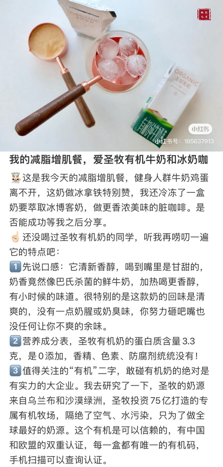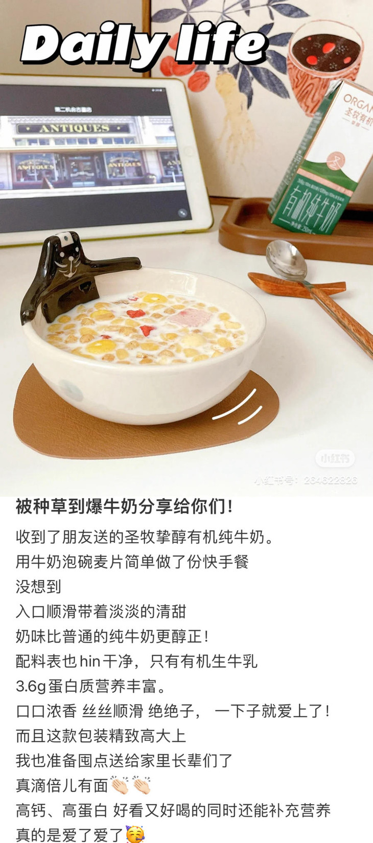 我很少喝纯奶,但也试了试,还不错!没什么奶腥味,很好入口,清香顺滑,微微甜,搭配咖啡也很合适!陆老师很爱喝,说很像小时候的玻璃瓶鲜奶,我也看了配料表,确实只有奶,非常单纯,而且营养价值也很高,每100ml的有机奶中含有3.3g的蛋白质和115mg的钙,特别适合小朋友!