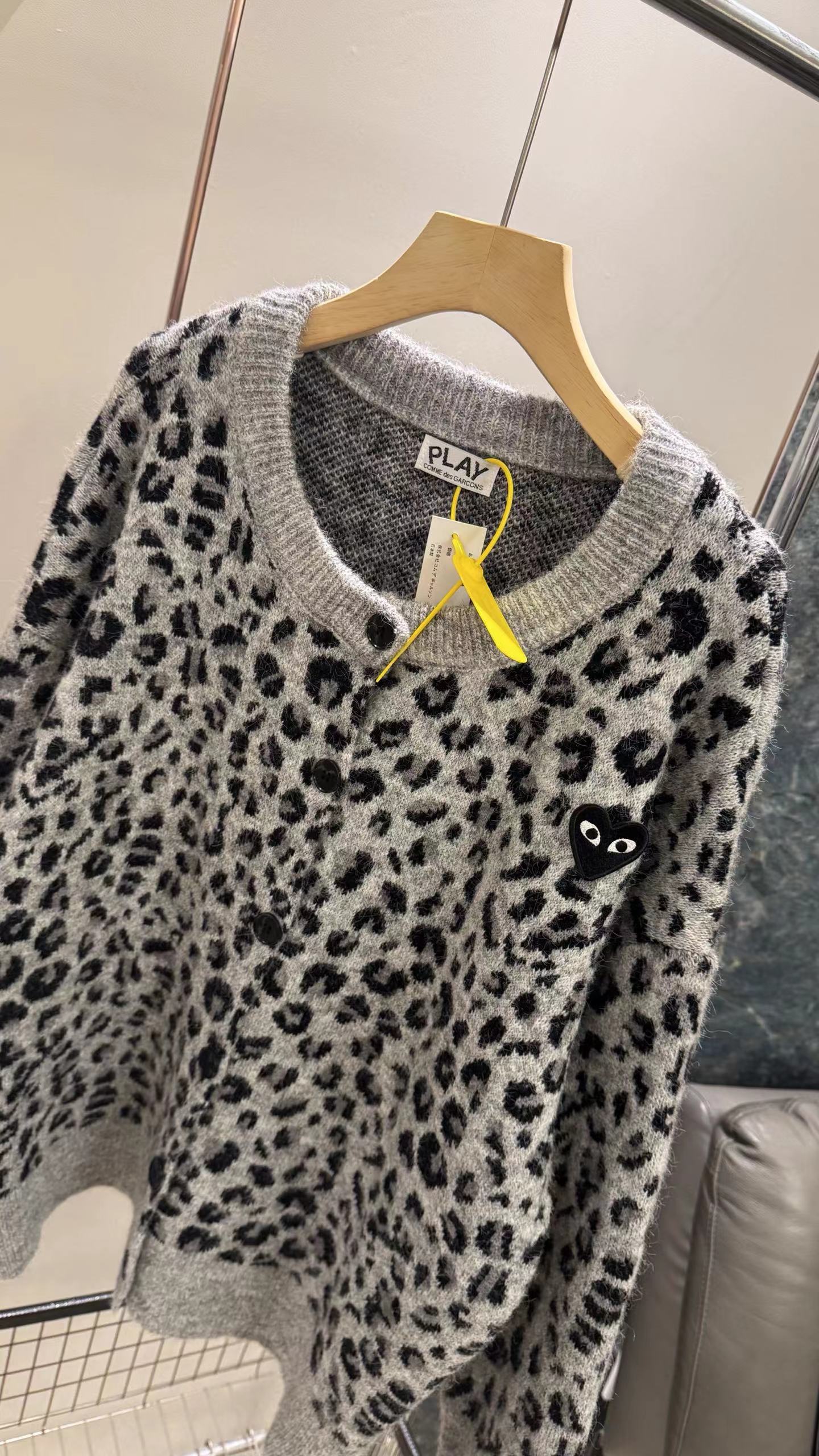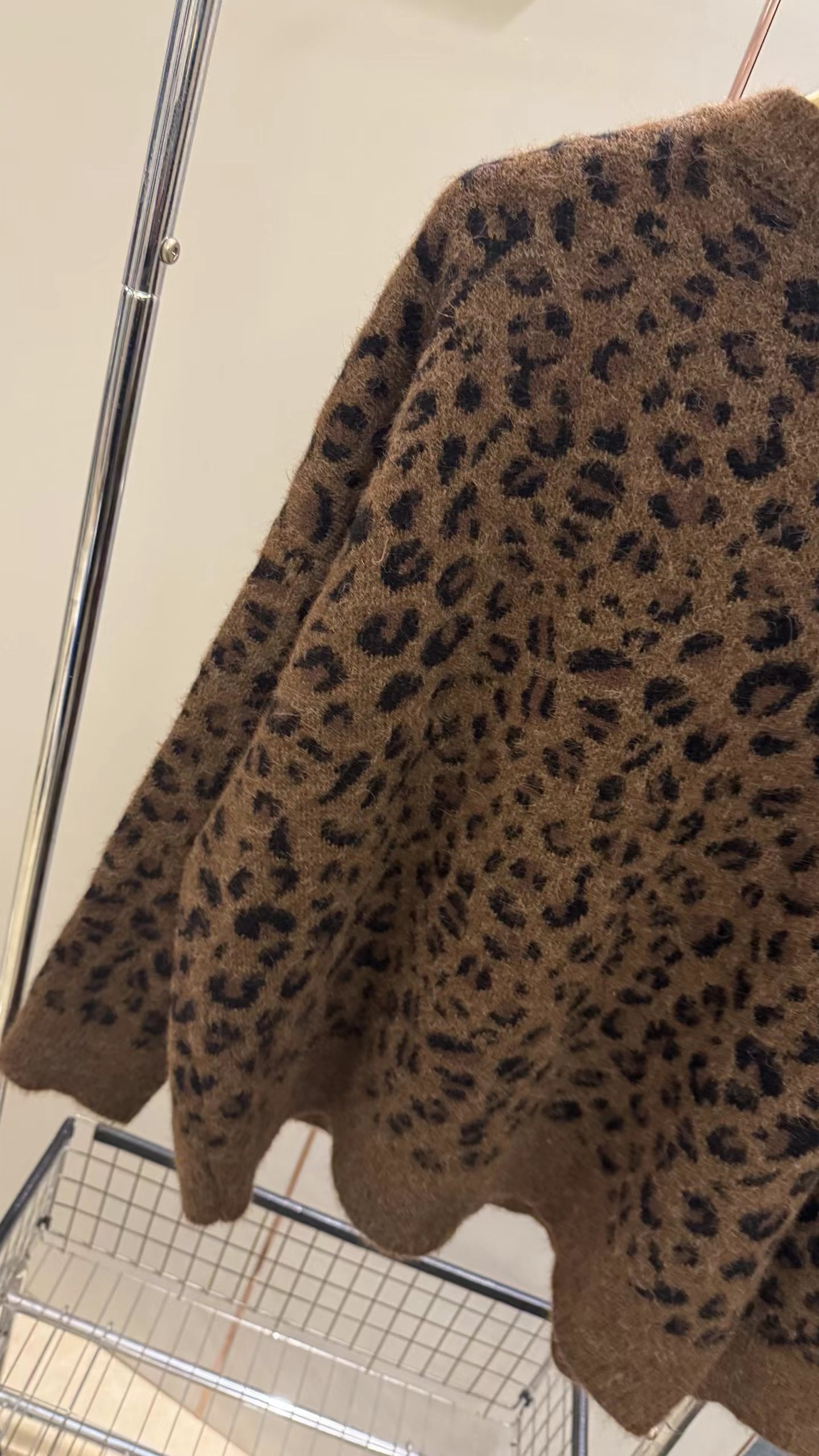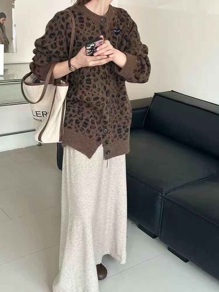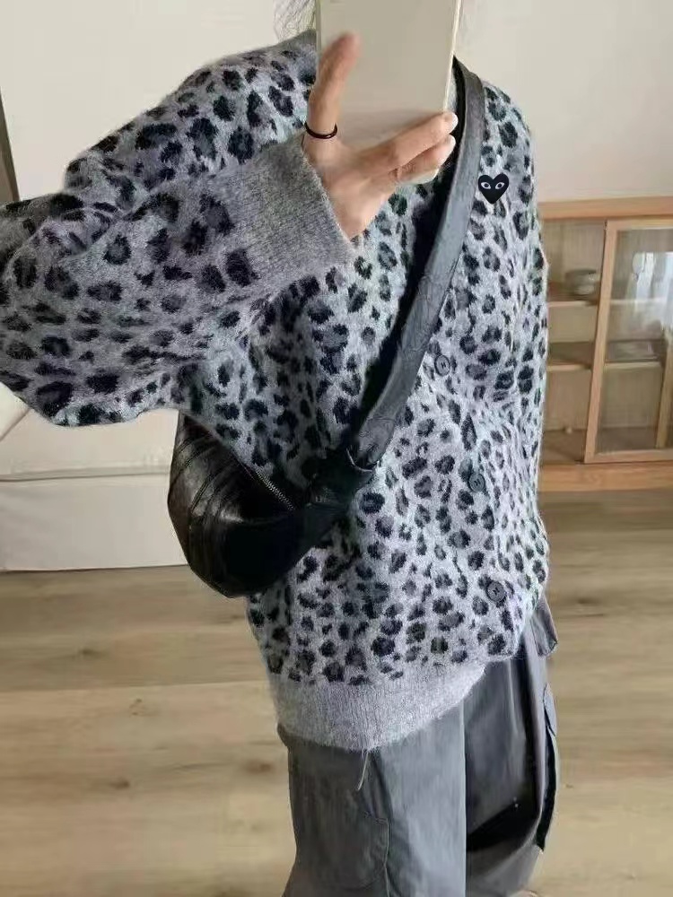 豹纹针织开衫复古甜酷的休闲风,豹纹元素自带时髦感,宽松版型慵懒随性,适配日常出街、通勤等多种场景。浅灰底色搭配深灰/黑色豹纹印花,色调柔和不张扬,弱化了豹纹的夸张感,豹纹分布均匀,视觉上丰富又不会过于杂乱,自带复古滤镜。V领+单排纽扣设计,开衫版型,可单穿也可叠搭内搭,适配不同季节。落肩+宽松袖型,修饰肩臂线条,对各种身材都很友好。袖口、下摆采用同色系纯色针织收边,平衡了豹纹的繁杂感,让整体更利落。左胸位置点缀黑色爱心刺绣小标,增添辨识度与可爱感,中和了豹纹的野性。针织面料看起来柔软蓬松,带有轻微毛绒感,触感舒适且保暖性佳,适合秋冬季节。面料垂坠感好,上身不会显臃肿,能轻松营造慵懒氛围。