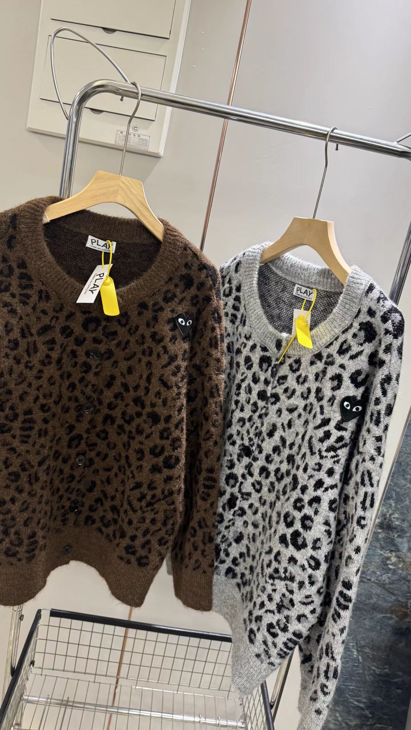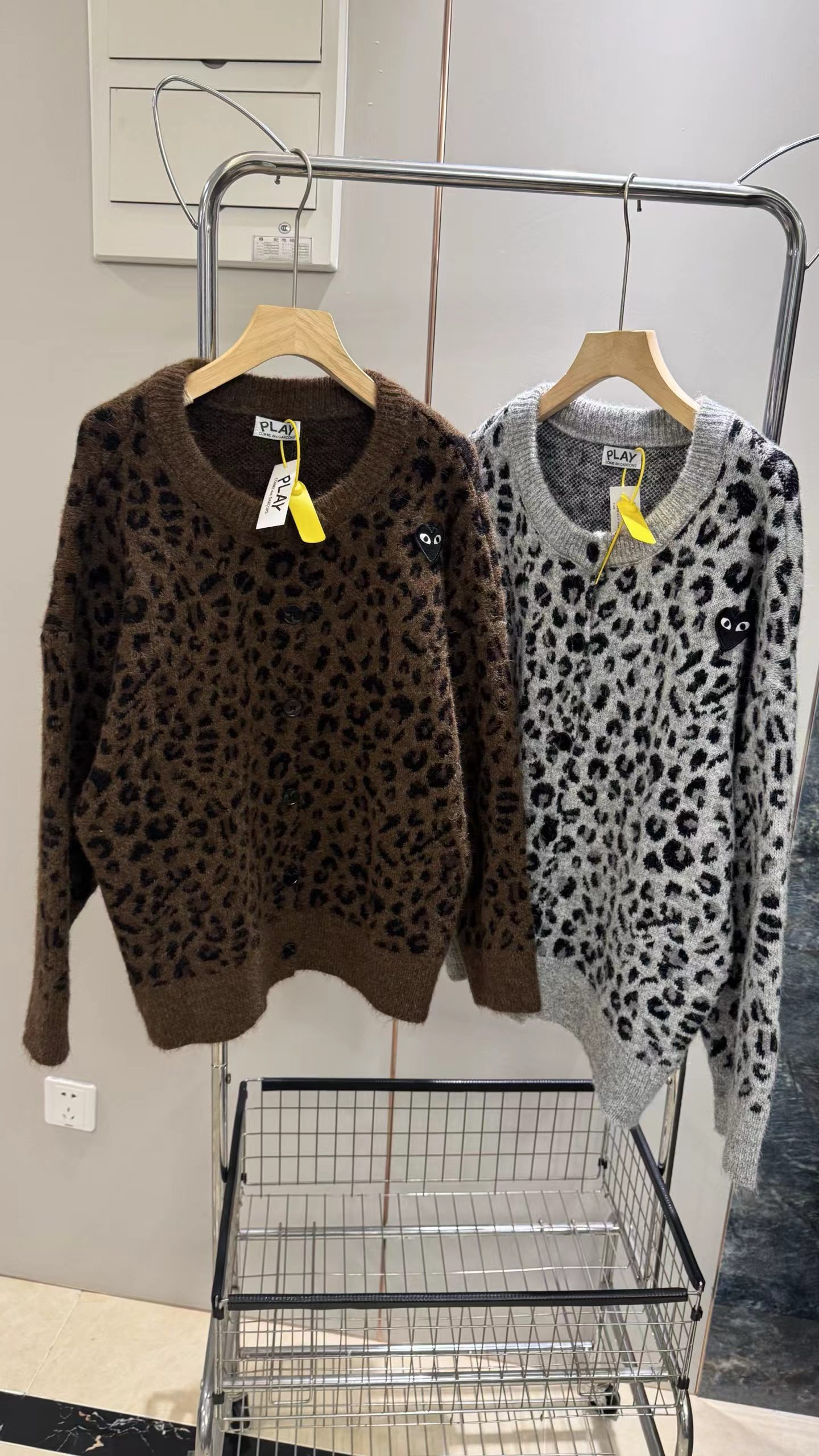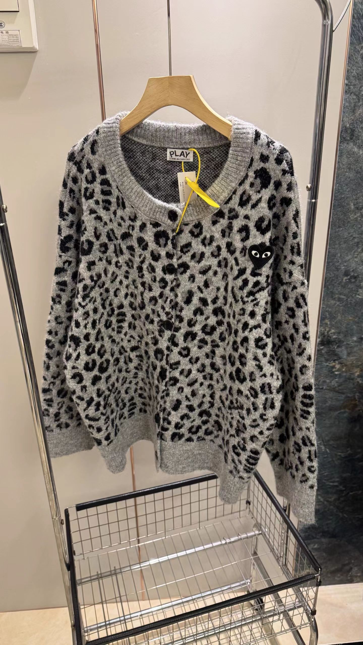 豹纹针织开衫复古甜酷的休闲风,豹纹元素自带时髦感,宽松版型慵懒随性,适配日常出街、通勤等多种场景。浅灰底色搭配深灰/黑色豹纹印花,色调柔和不张扬,弱化了豹纹的夸张感,豹纹分布均匀,视觉上丰富又不会过于杂乱,自带复古滤镜。V领+单排纽扣设计,开衫版型,可单穿也可叠搭内搭,适配不同季节。落肩+宽松袖型,修饰肩臂线条,对各种身材都很友好。袖口、下摆采用同色系纯色针织收边,平衡了豹纹的繁杂感,让整体更利落。左胸位置点缀黑色爱心刺绣小标,增添辨识度与可爱感,中和了豹纹的野性。针织面料看起来柔软蓬松,带有轻微毛绒感,触感舒适且保暖性佳,适合秋冬季节。面料垂坠感好,上身不会显臃肿,能轻松营造慵懒氛围。