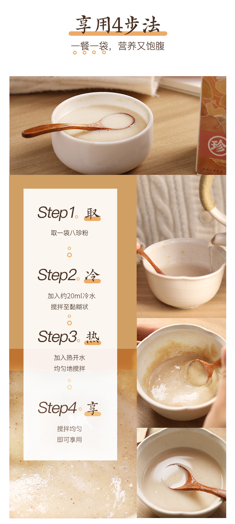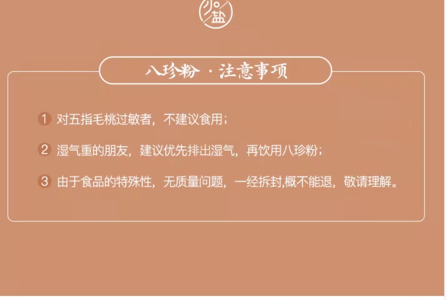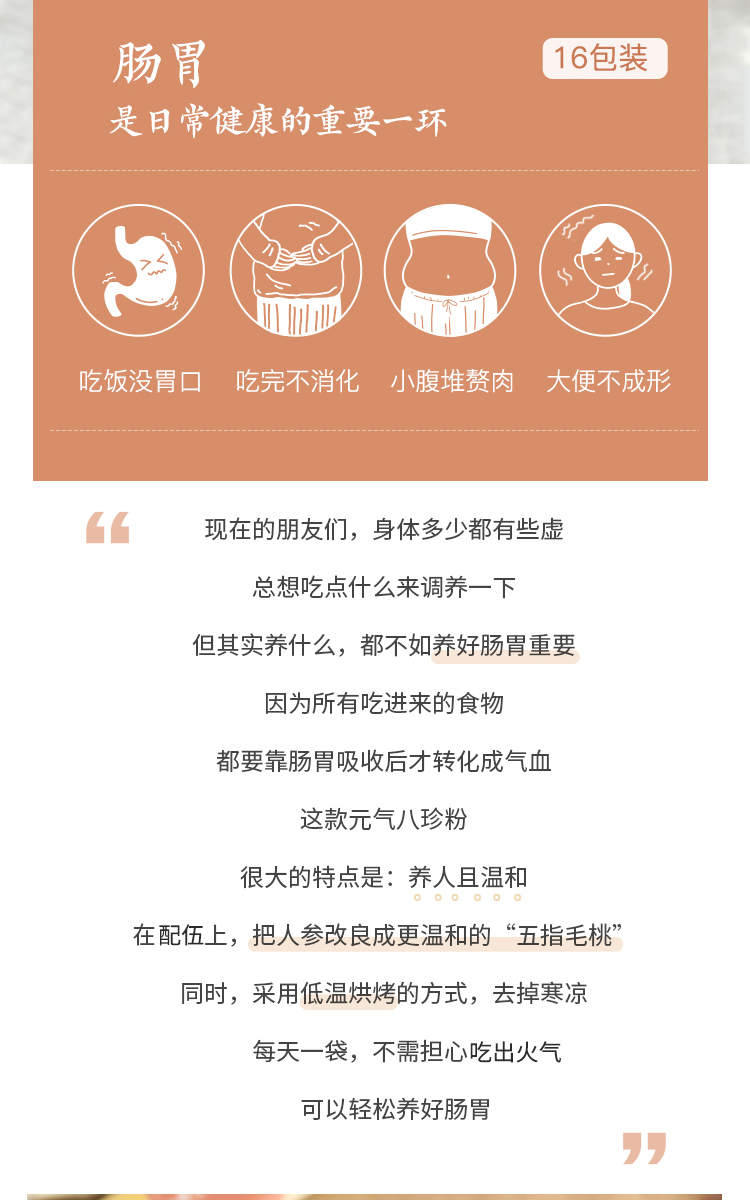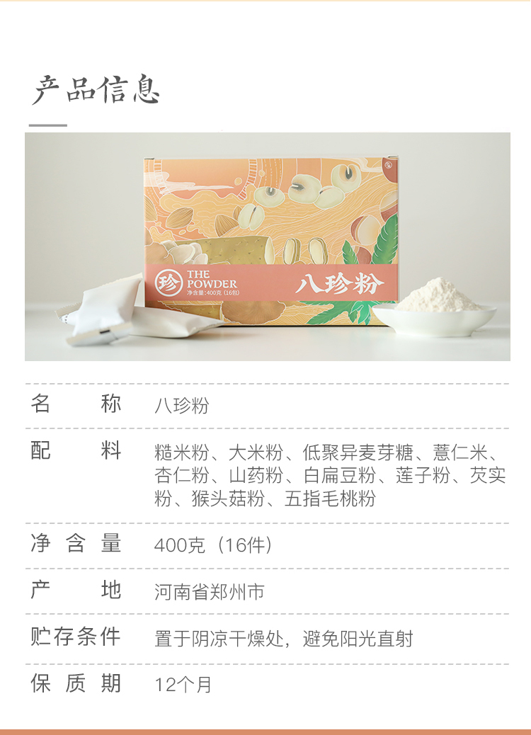 这次新版的八珍粉,我们对配方做了一些调整,把原来的“人参”替换成了“五指毛桃”,更温和,避免身体出现火气,小朋友也可放心食用。如果您是以前经常购买八珍粉的朋友,可能会觉得口味有些许改变,建议初次购买1盒进行品尝