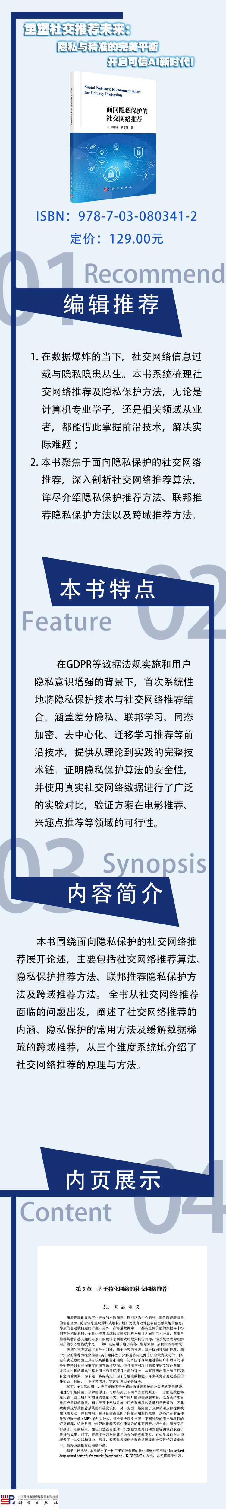 随着社交网络的飞速发展,社交网络的应用范围逐步扩展,用户规模不断扩大,信息更新速度不断加快,社交网络已成为互联网的一大发展趋势,社交网络不仅满足人们网上交流的需求,更成为人们分享、获取和传播信息的重要渠道。用户规模呈爆炸式增长,用户身边充斥着大量信息,为了提供精准化的服务,推荐系统得到了广泛应用。传统的推荐系统需要服务器集中用户原始数据产生推荐结果,在这一过程中用户的隐私易受到威胁。2016年,欧盟发布了《通用数据保护条例》,禁止商业公司在未经相应用户许可的情况下收集、处理或交换用户数据。紧接着美国和中国也分别相继出台了类似的法律规定《美国数据隐私保护法》和《中国信息保护法》。推荐系统的研究对国家安全也具有重大意义,如社交网络中的个性化信息排序和推荐对社会舆情和热点事件监测起到积极的引导作用,以及通过社交网络中的社交关系的预测和推荐可以提升反恐、网络诈骗的检测效率和准确率。随着推荐系统在社交网络中应用范围的拓展和用户参与度的不断增加,隐私保护成为一个日益敏感的问题。 本书对社交网络推荐算法及其隐私保护方法展开研究,全书首先对社交网络的概念、相关技术、评价指标及其面临的挑战进行了简介,然后分章对社交网络推荐模型进行而分析,主要包括基于矩阵分解的社交推荐算法、基于深度学习的社交推荐、推荐差分隐私保护方法及联邦推荐隐私保护方法四个方面。