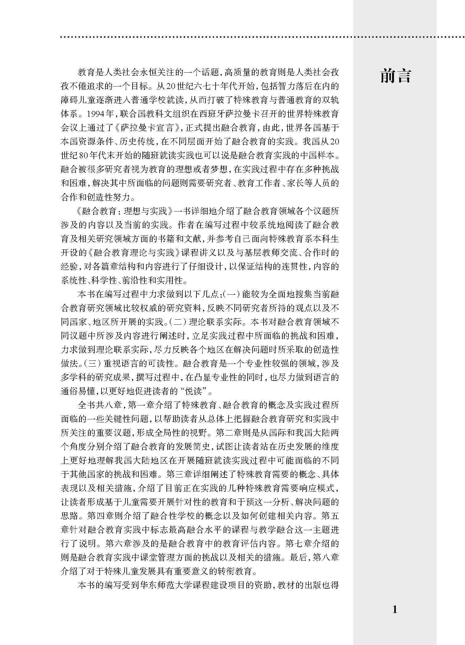 本书着眼当前的现实,从理想与当前现实所面临的困难两个角度介绍融合教育这一教育模式。本书将涉及以下内容:融合教育的基本概念及发展历史(包括中国随班就读实施的历史背景)、融合教育实践中的关键性问题、特殊教育需要以及应对模式、个别化教育与差异化教学、特殊学生的教育评价、融合课堂中的学生行为管理以及融合教育中的转衔教育。