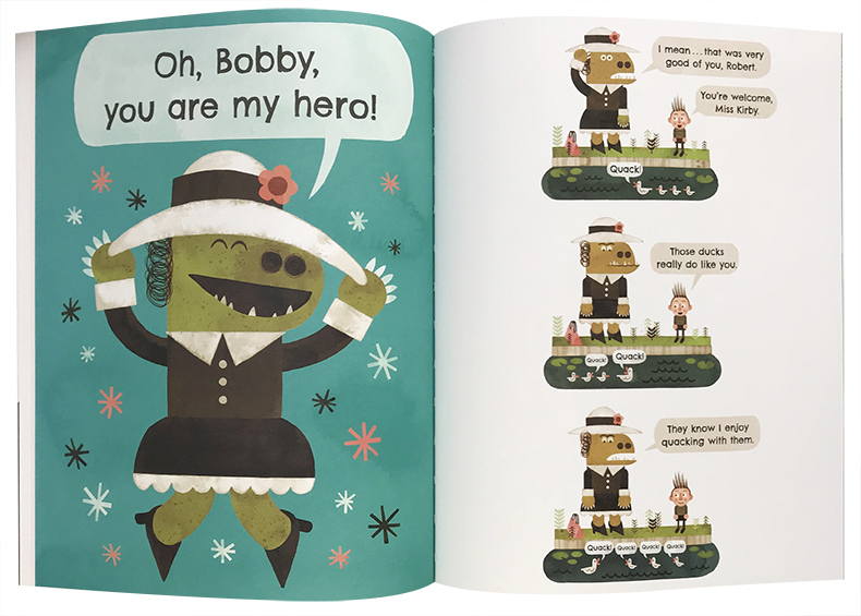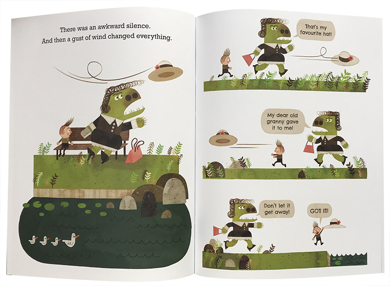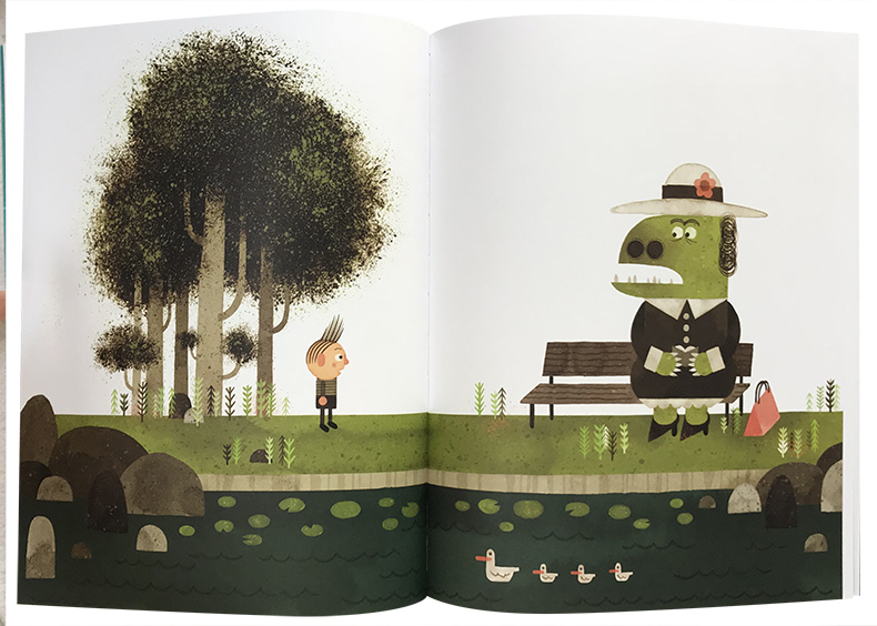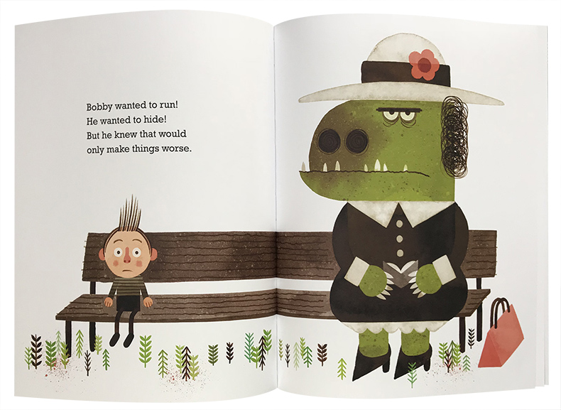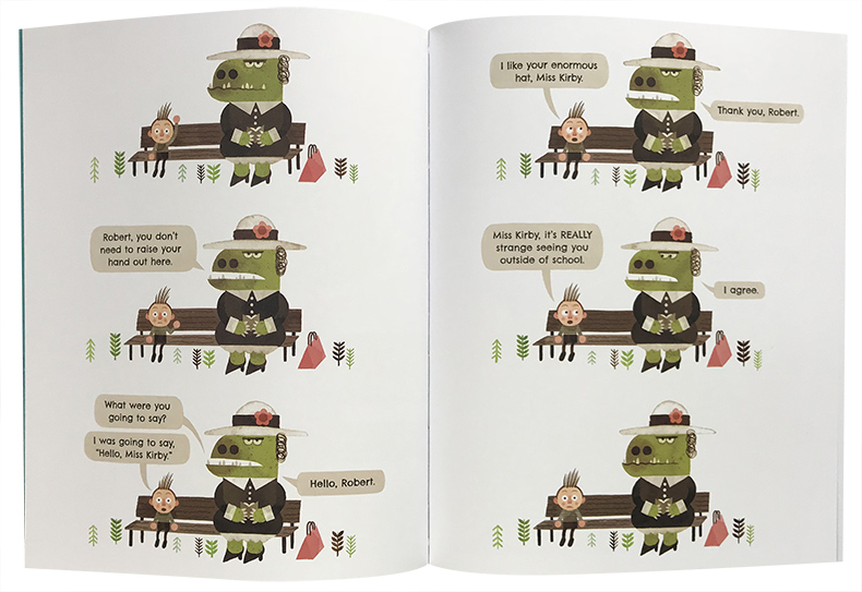 为了真实呈现孩子的样貌与心声,彼得.布朗一次又一次的走进校园,和老师与小朋友恳谈,以捕抓住孩子的观点与感受。在这本书里,他先用铅笔、墨水、水彩、不透明水彩画在纸张上,再以电脑数位处理、合成上色,简洁的构图、几何的造形、复古的色彩,以及漫画式的对话框,呈现这个让孩子感同身受的故事,尤其是绿色怪兽老师的形象,相信孩子可以体会主角小罗的感受。