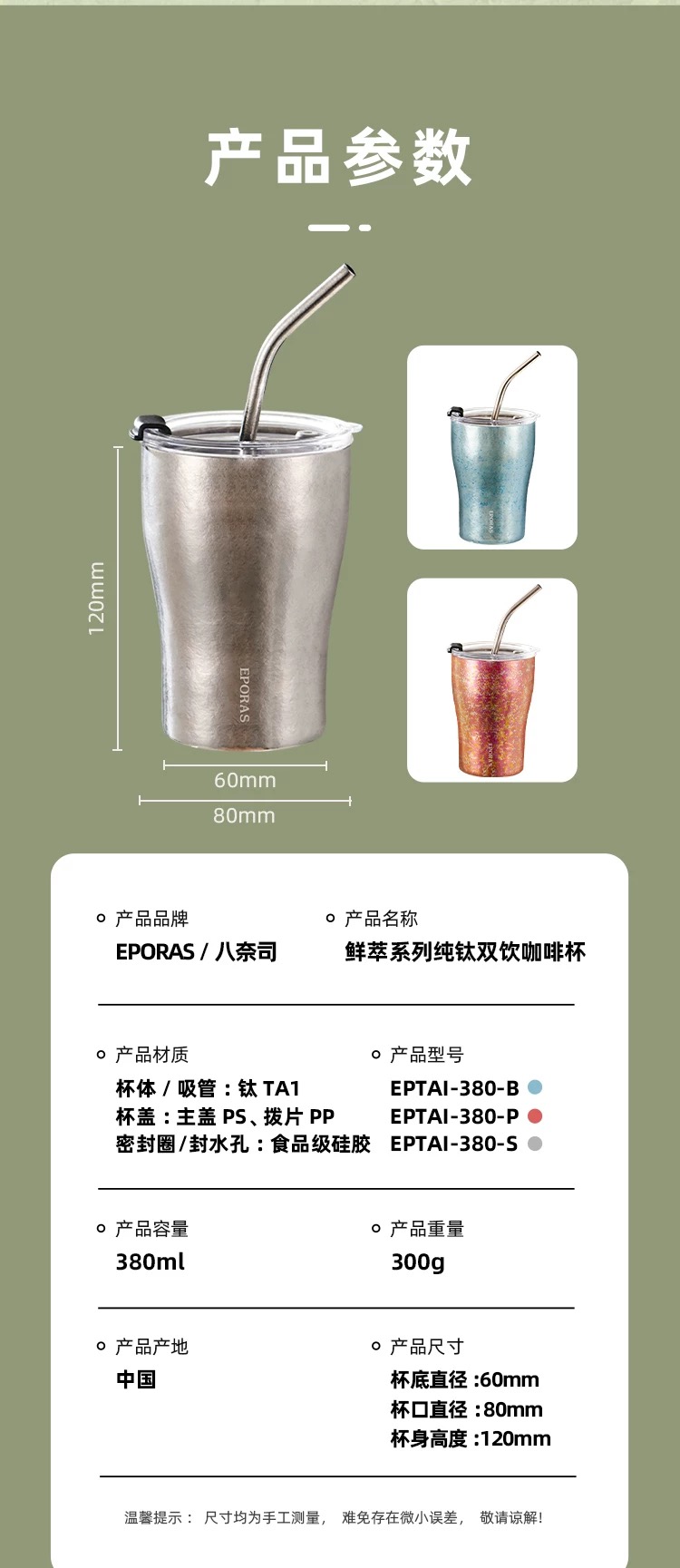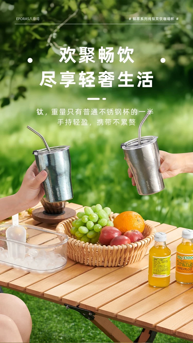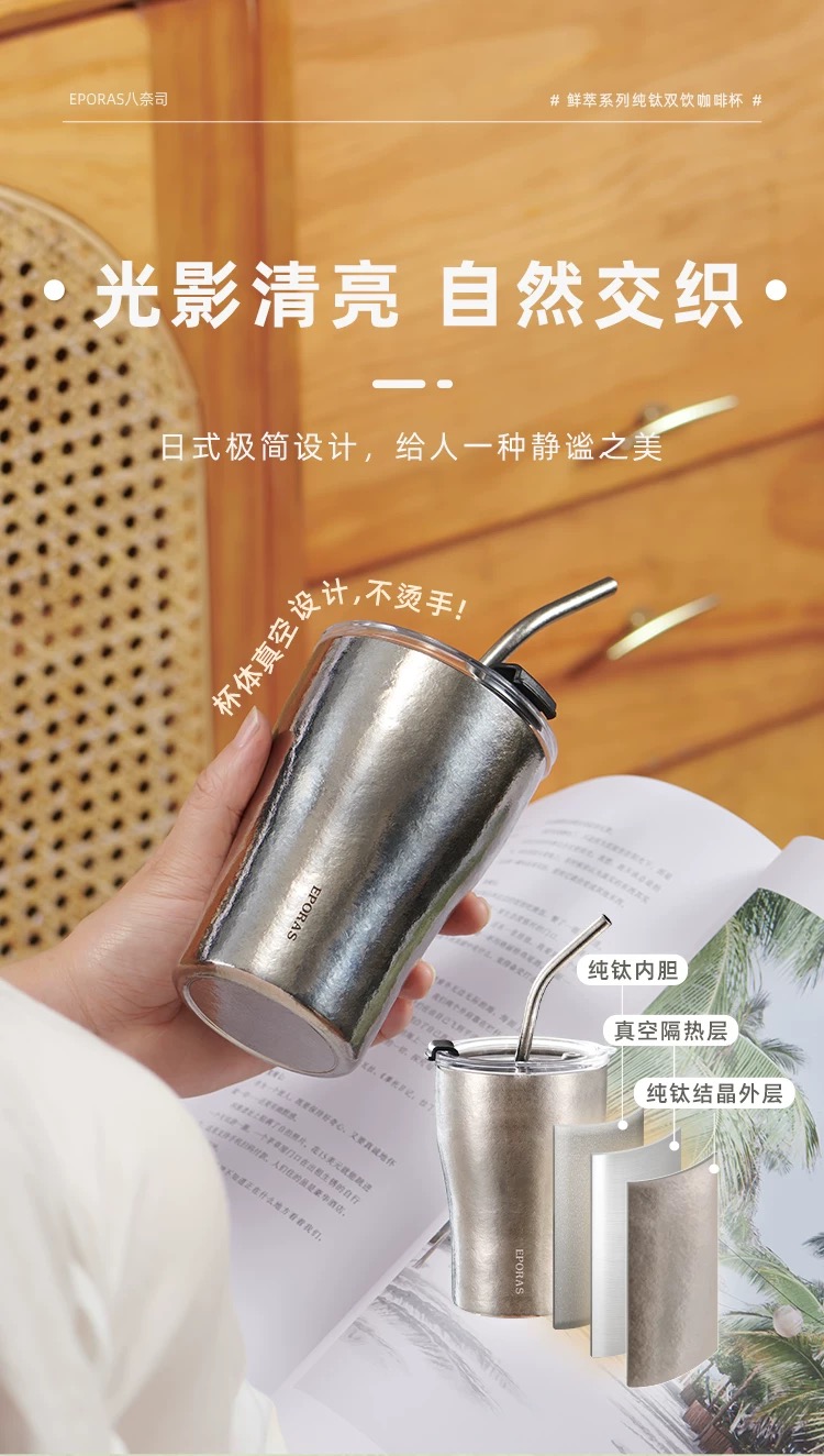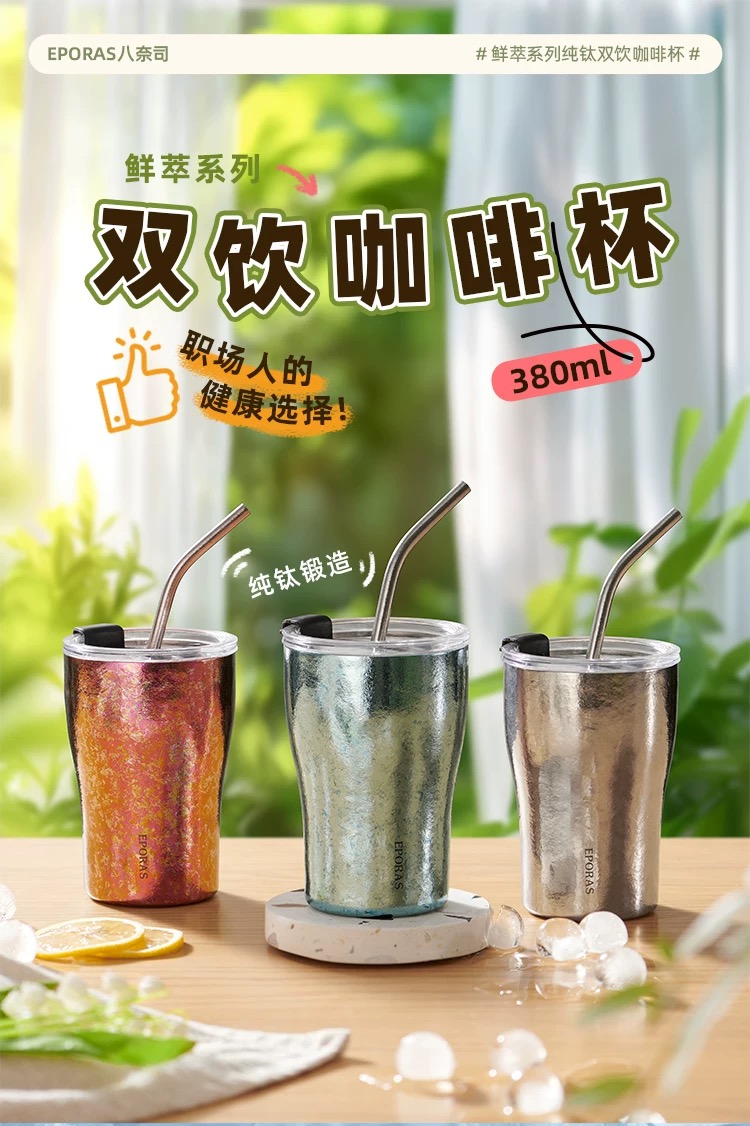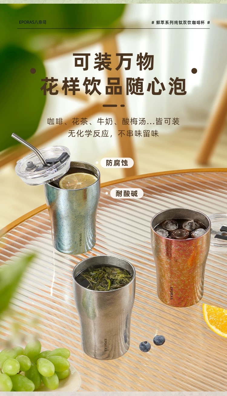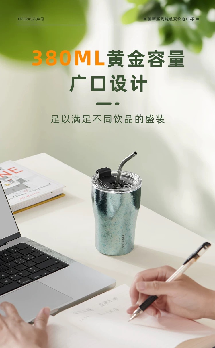 日本 EPORAS 八奈司 纯钛保冷保温杯高颜值咖啡 便携吸管杯 380ml 新品上新
