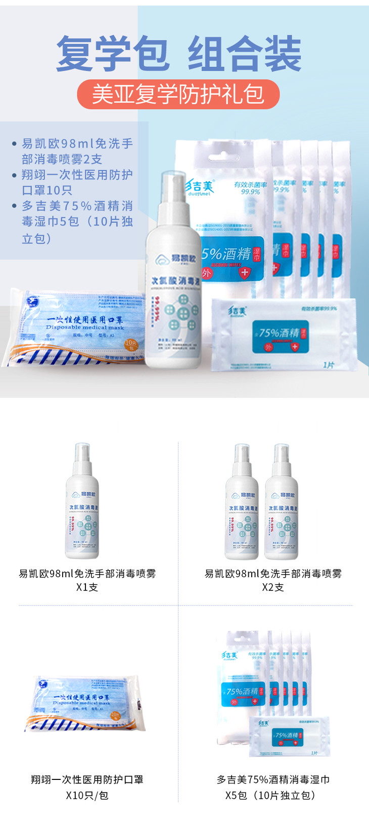 美亚健康 复学防护礼包 免洗手消 消毒湿巾 医用口罩 包邮 预售