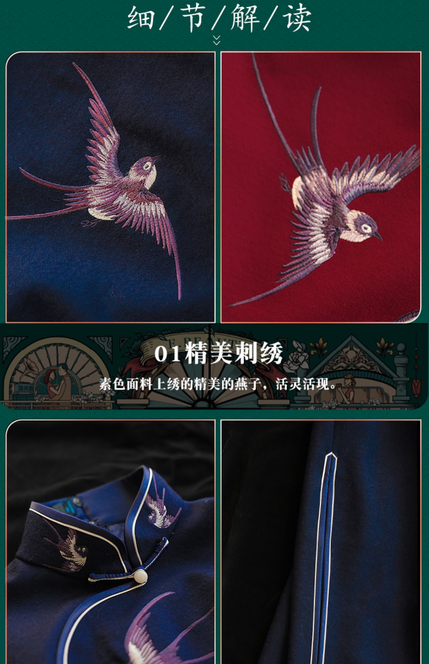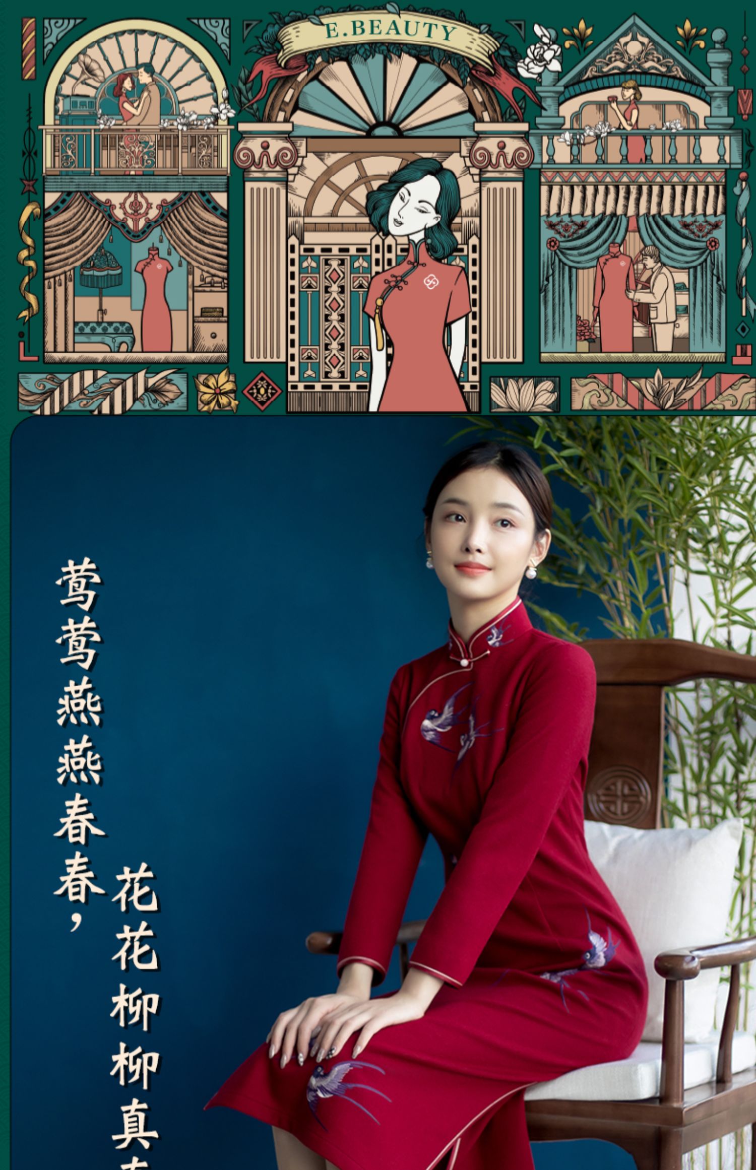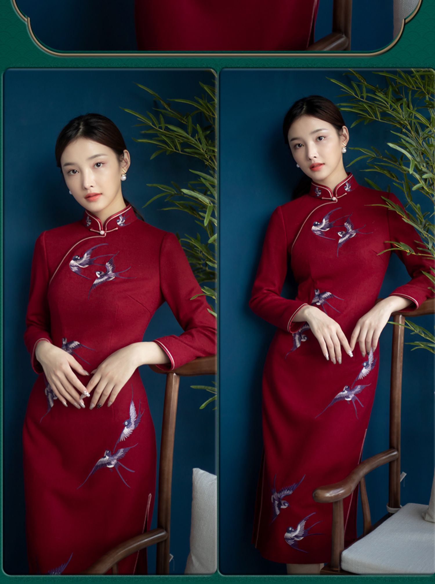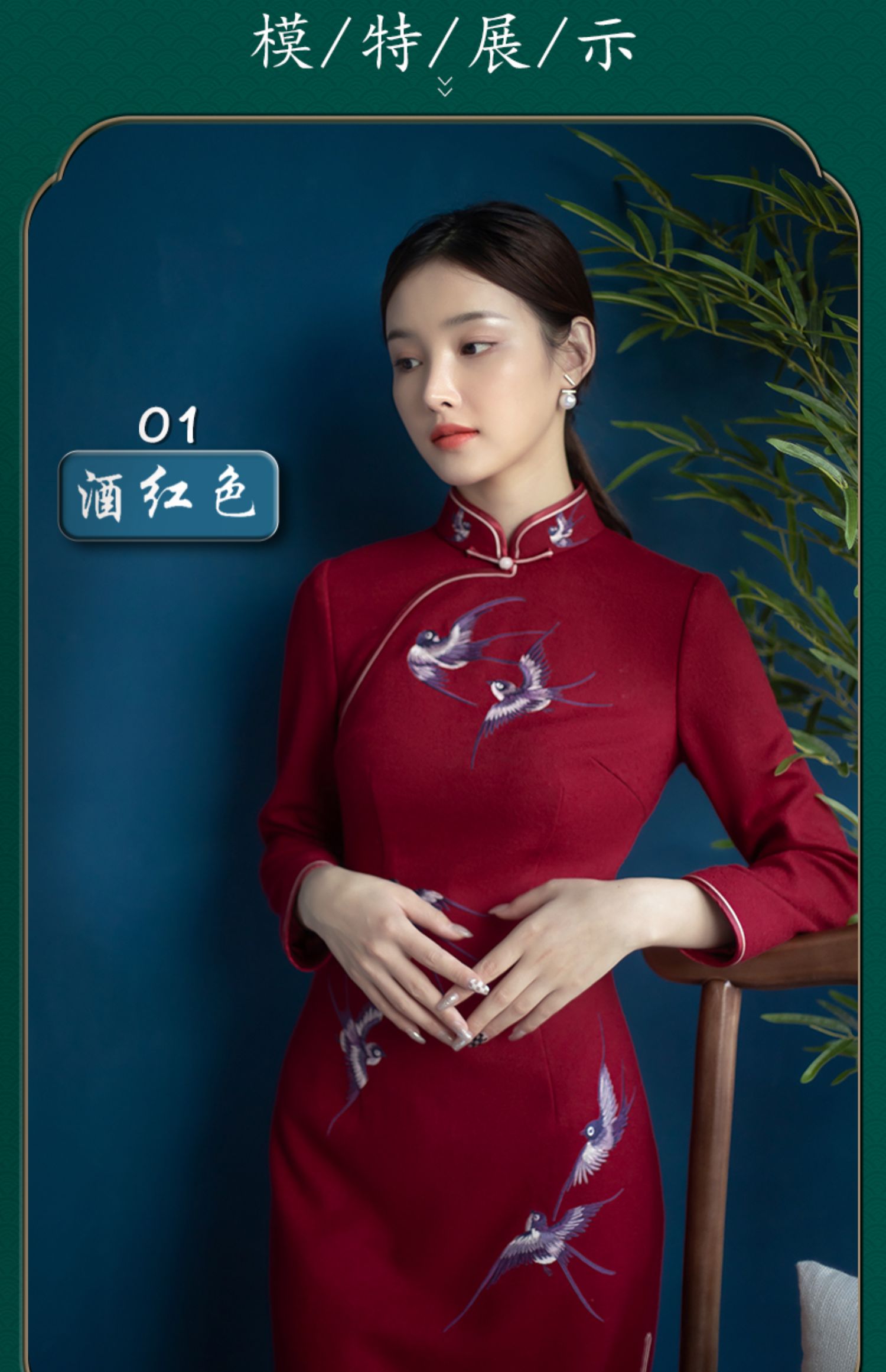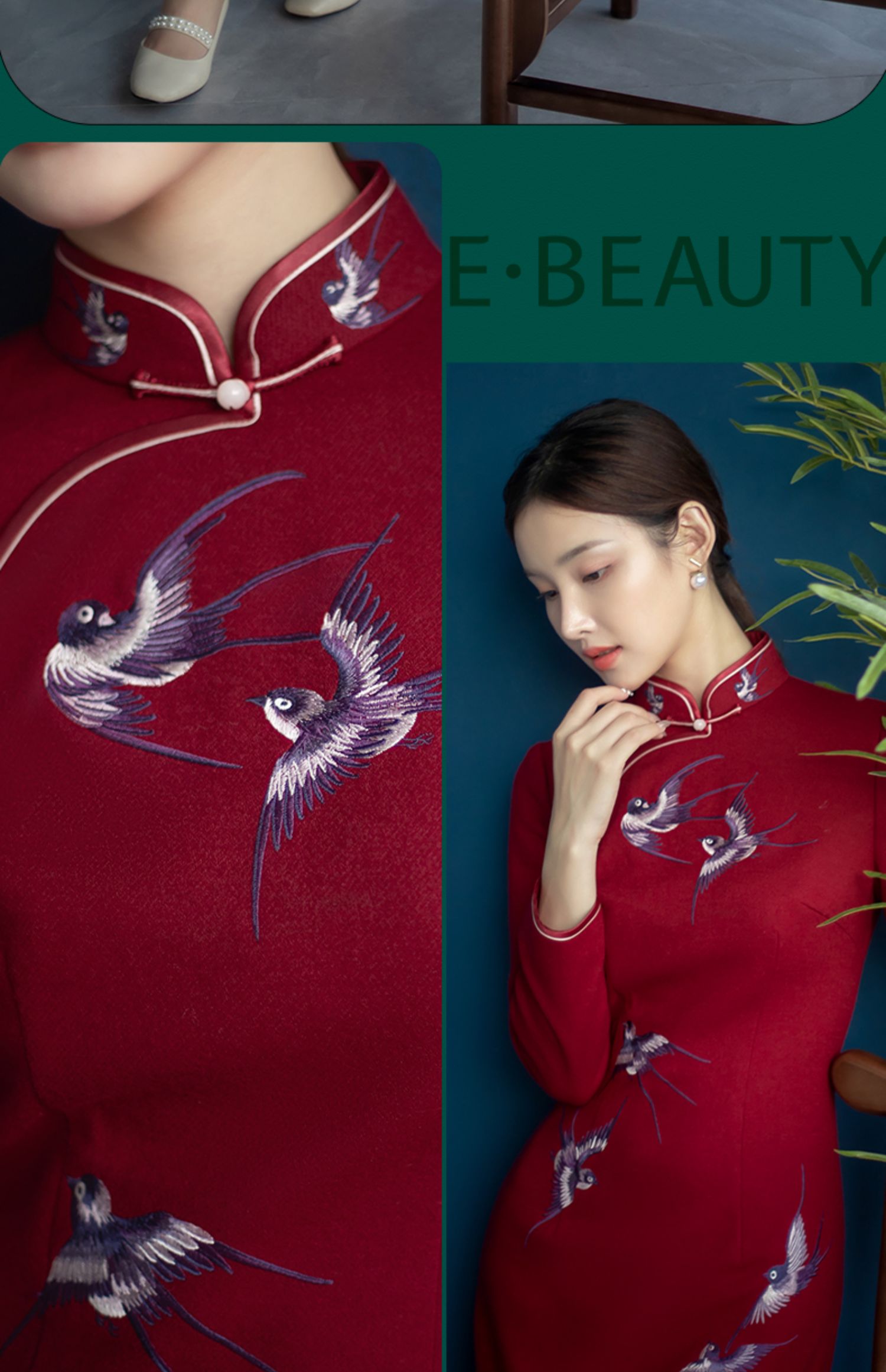 逸红颜 仓灵 2025冬新品羊毛针织呢栩栩如生双飞燕刺绣日常旗袍女