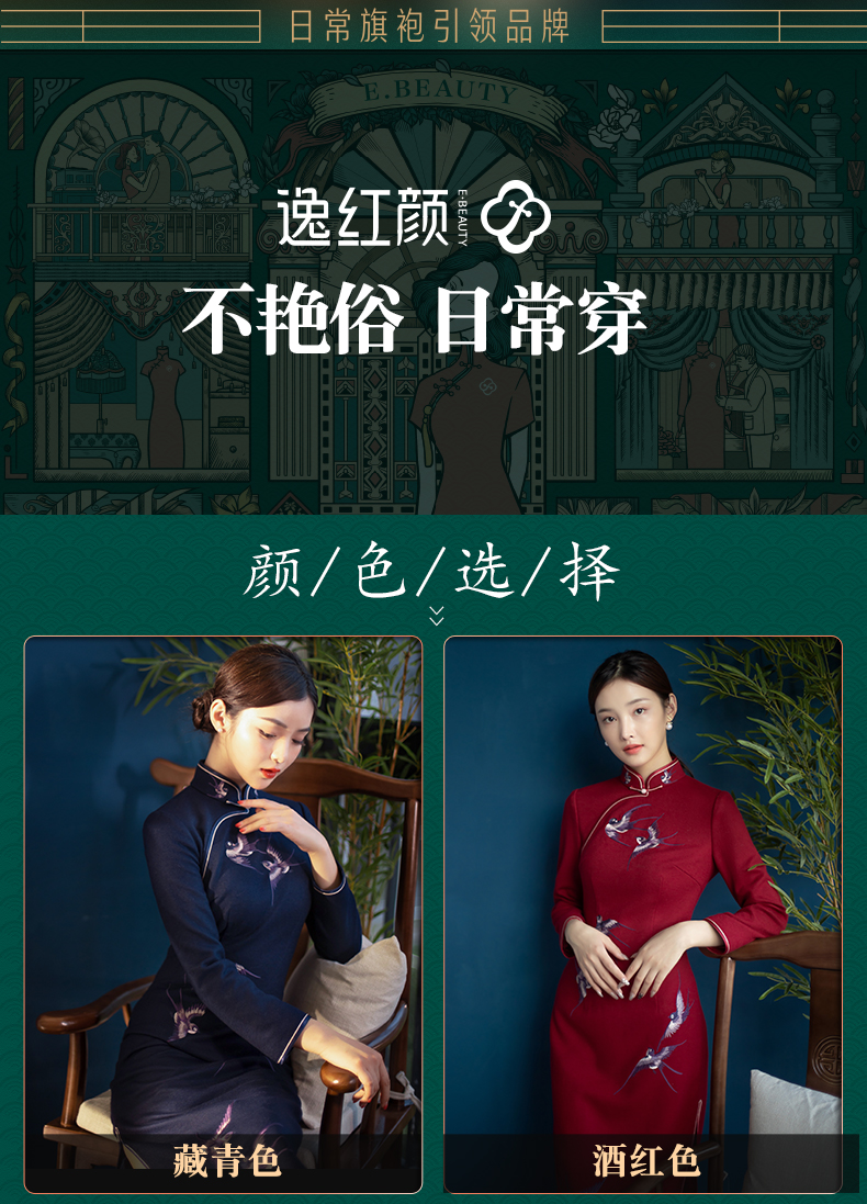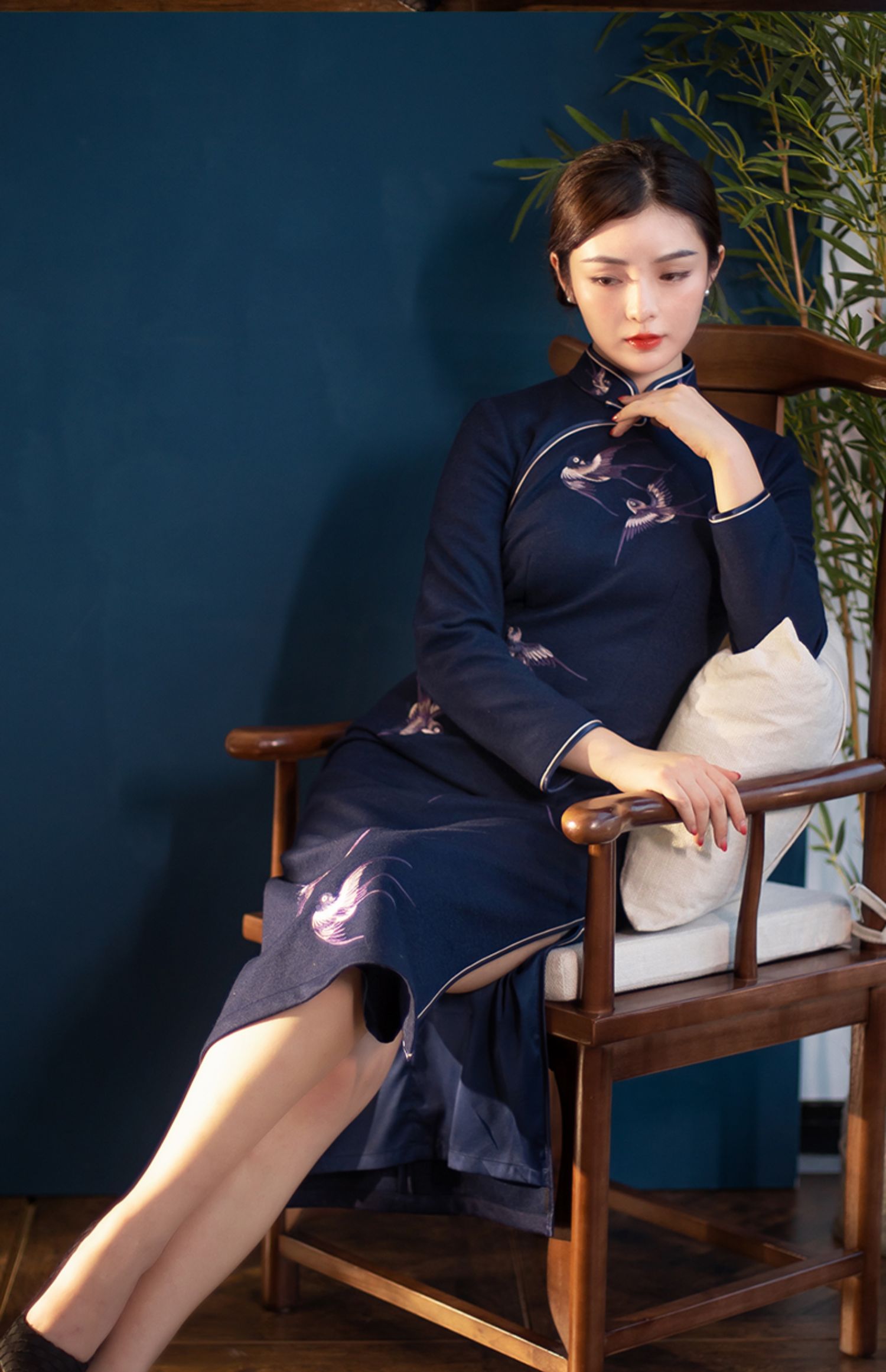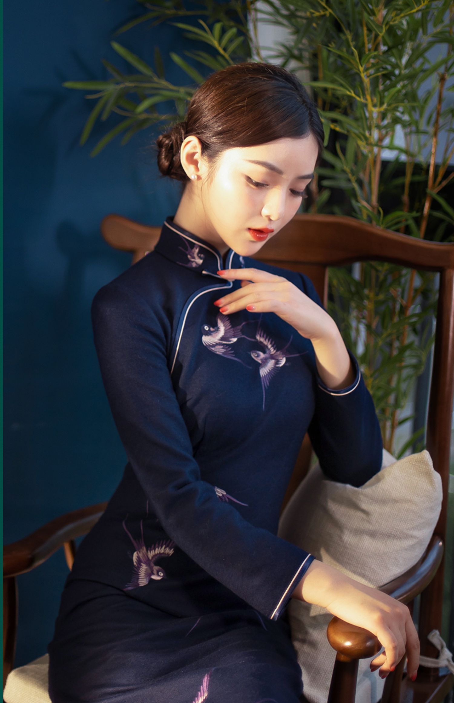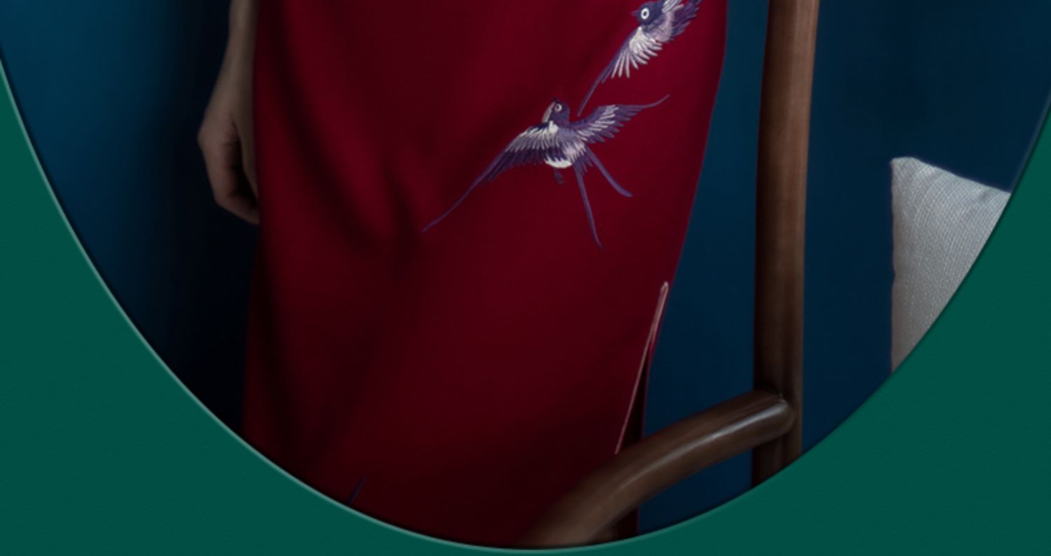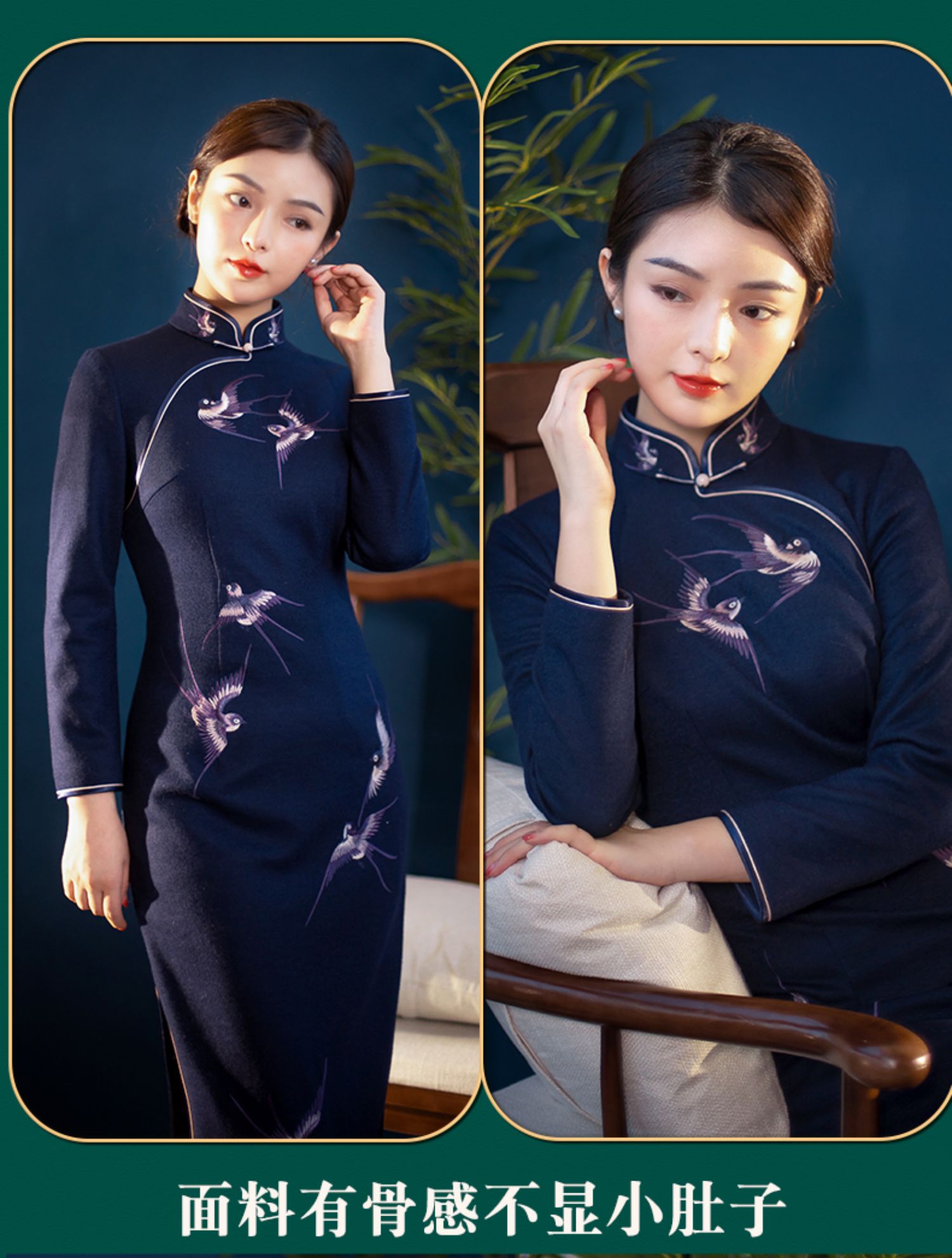 逸红颜 仓灵 2025冬新品羊毛针织呢栩栩如生双飞燕刺绣日常旗袍女
