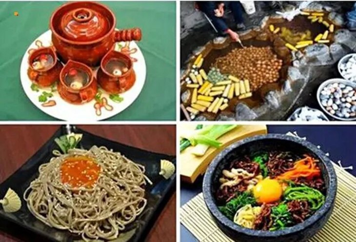 长白山美食兼有着典型的东北风昧和朝鲜风昧,以炖菜和凉拌菜为主的 东北菜,加上以辣白菜和狗肉汤为特色的朝鲜菜,不仅色泽上红艳鲜亮勾起 人的食欲,而且药腾结合的配菜方式使美食更加营养与绿色。