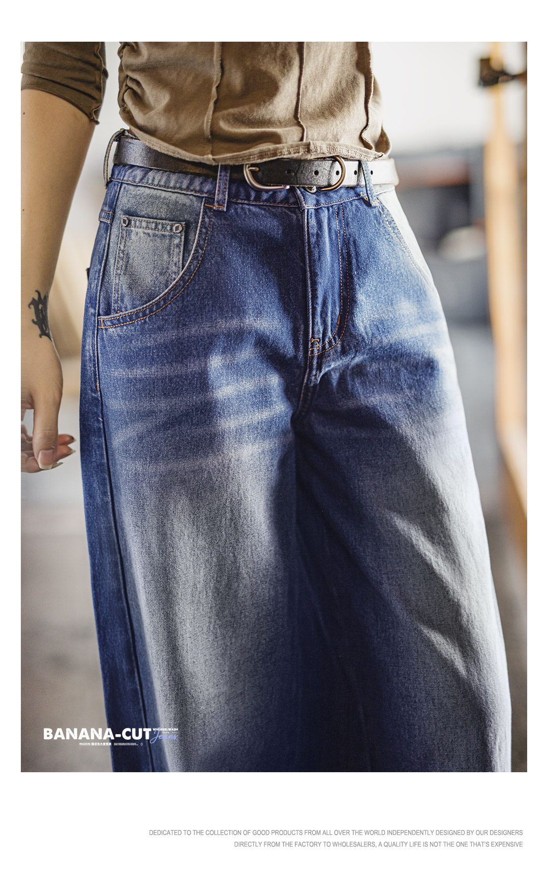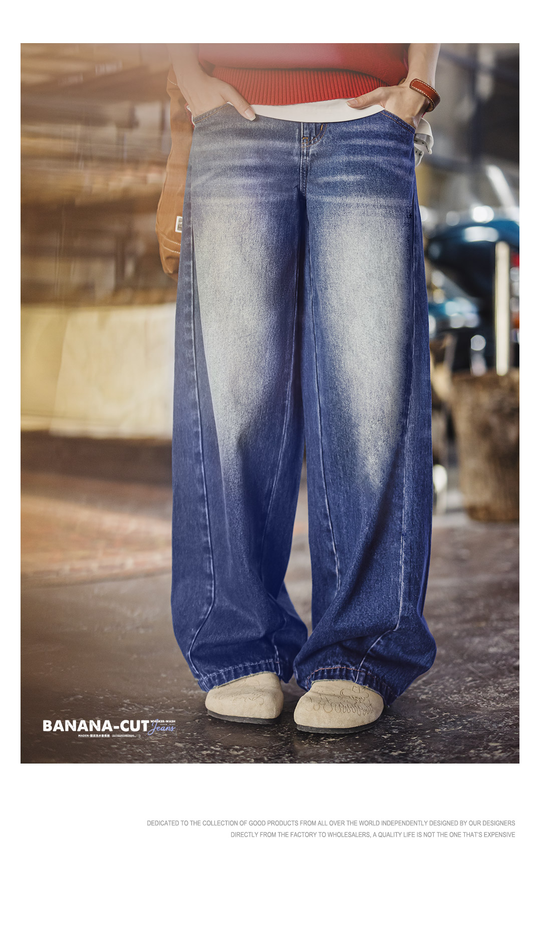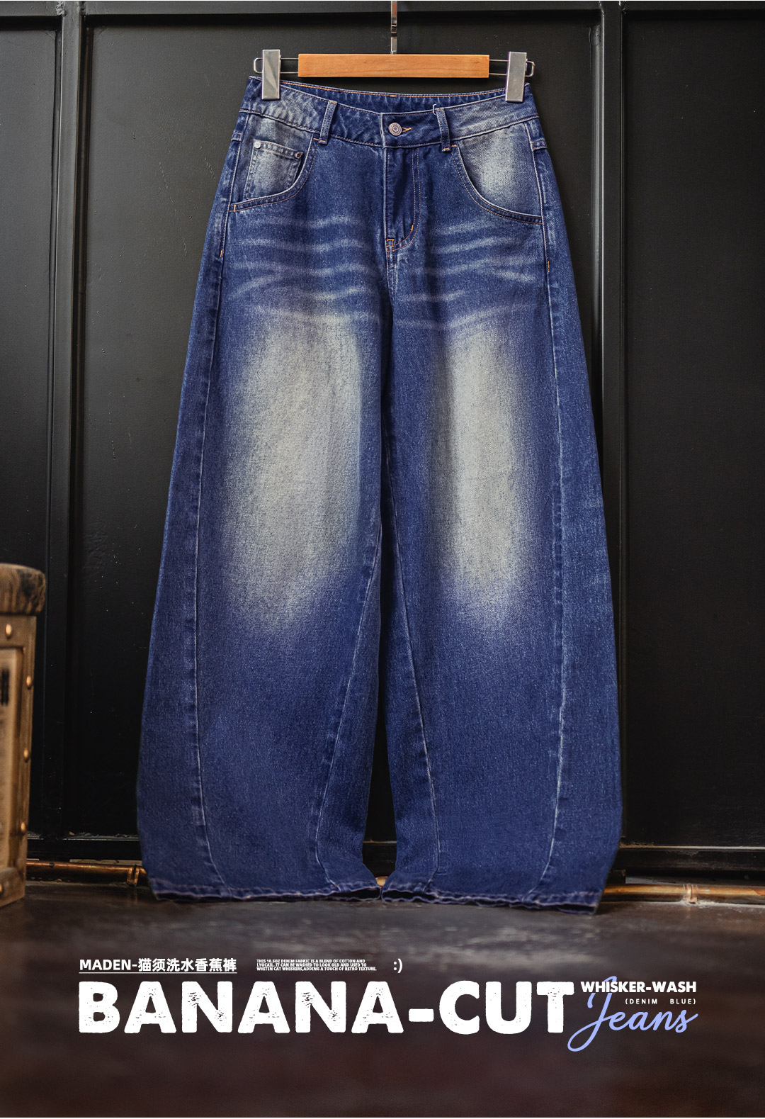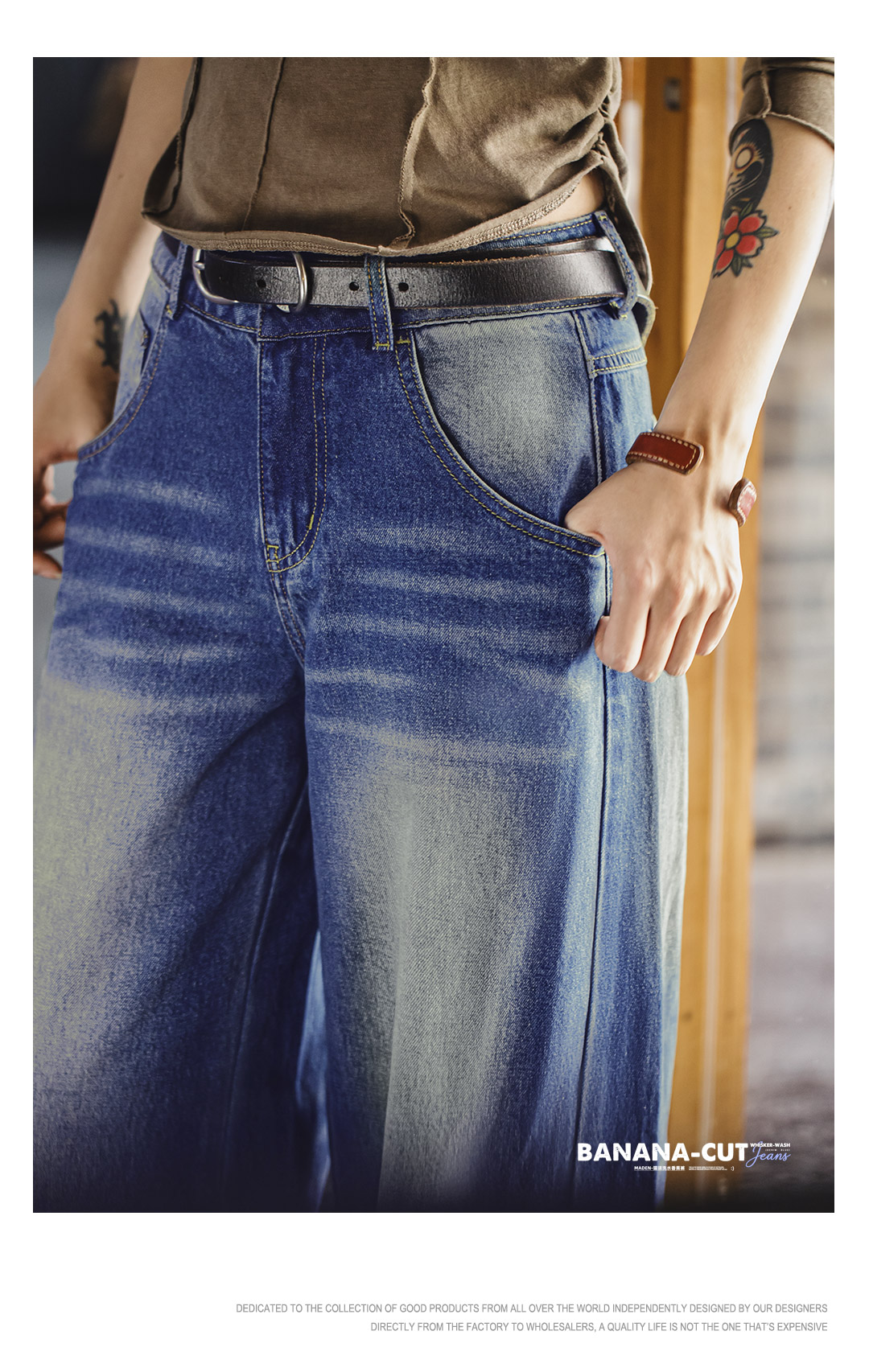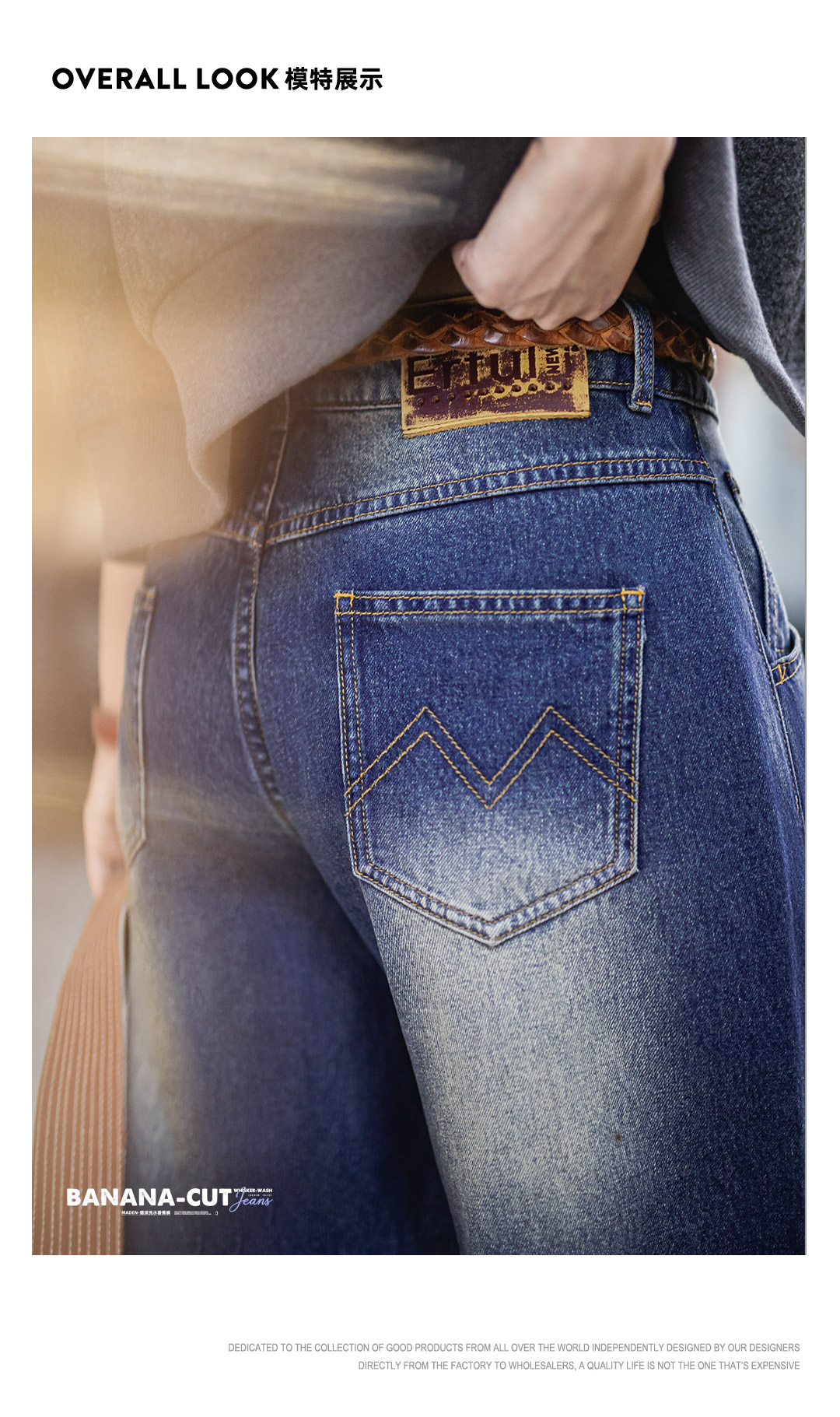 马登丹宁蓝美式复古闪电纹水洗宽松香蕉弯镰刀牛仔阔腿裤子女士秋