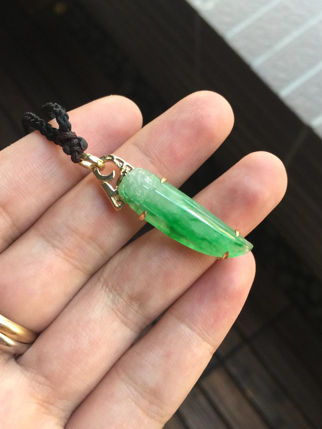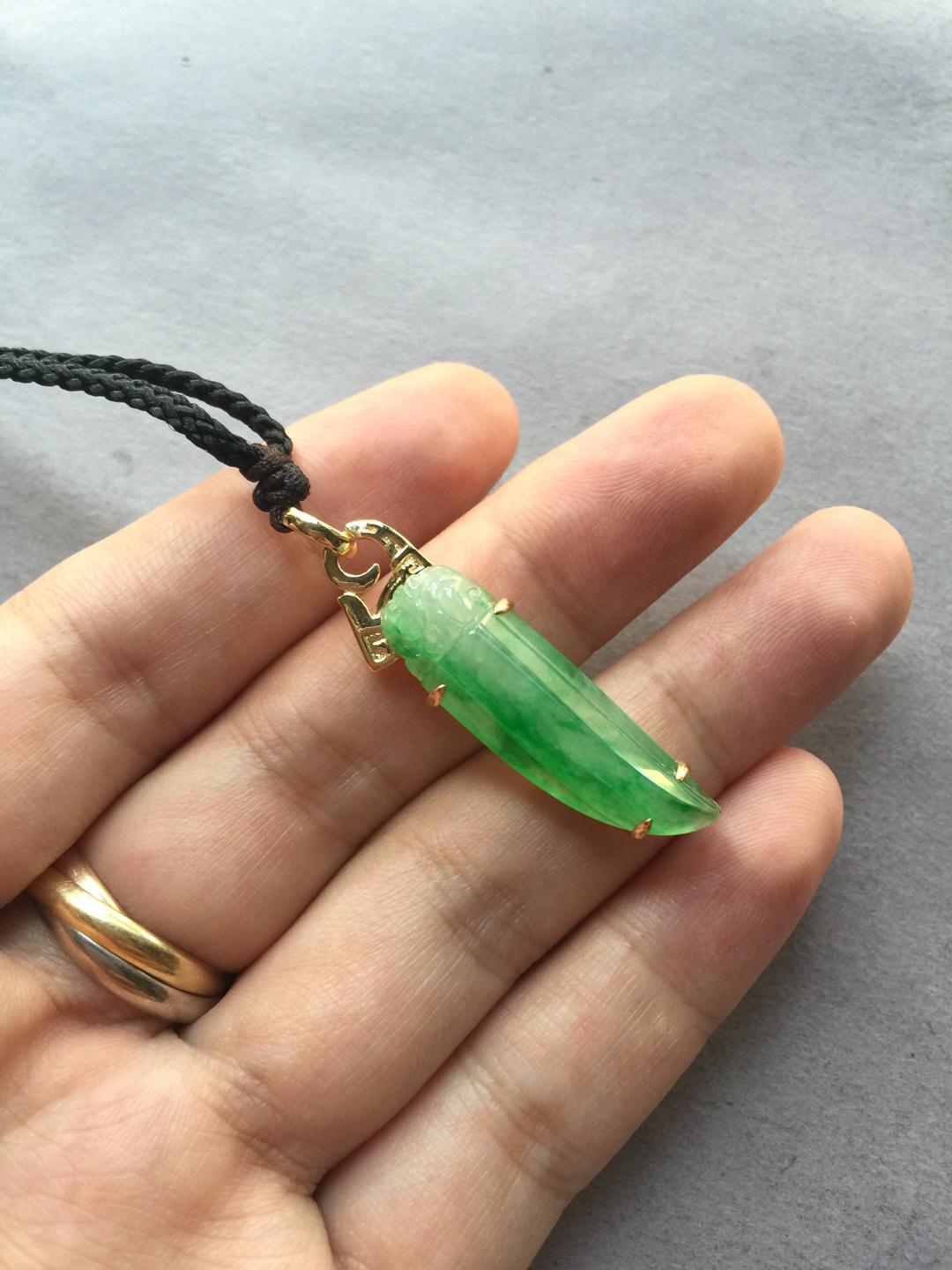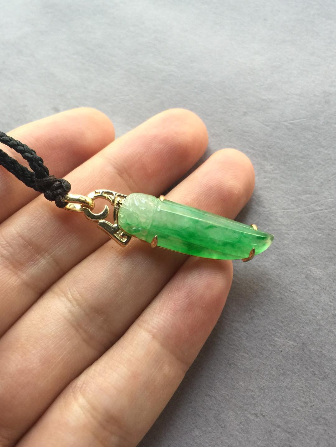 翡翠冰种阳绿府上有龙,种色俱佳,30.7*10.5*4mm,镶嵌后41.9*10.5*6.5mm。种水棒,荧光四射,正阳绿艳丽,18k黄金镶嵌,古典造型,让人心情大好的漂亮宝贝,饱满尺寸,“玉斧”上手工精雕貔貅,龙之九子。寓意家中必出贤贵之才。府上有龙,特别适合望子成龙,望女成凤的朋友,好意头。再加上漂亮的阳绿,美不胜收