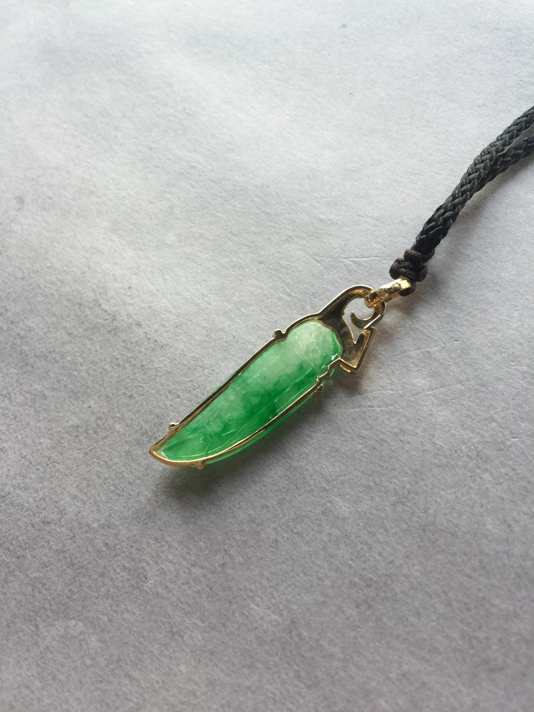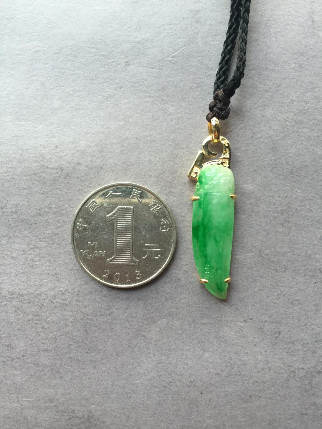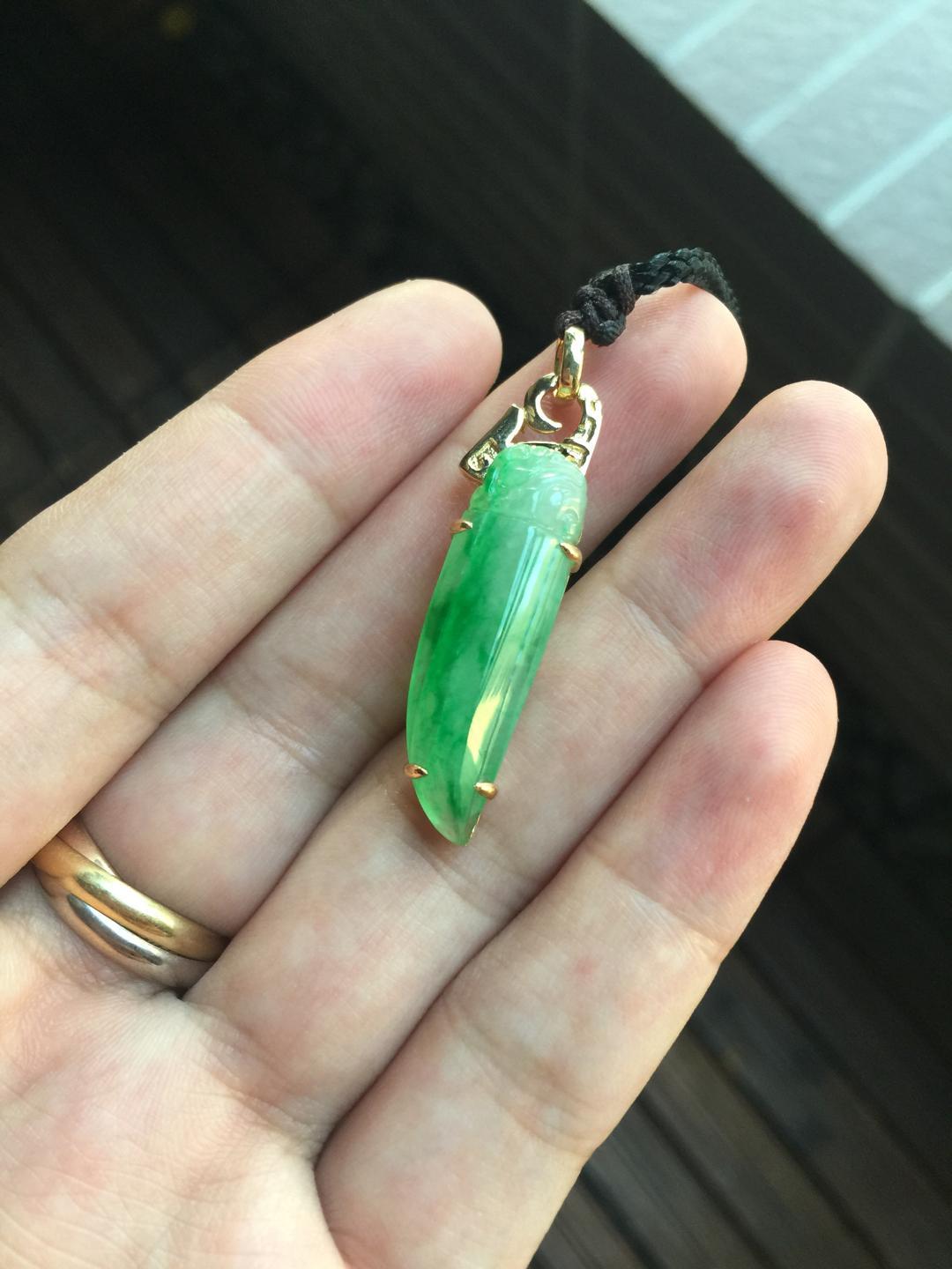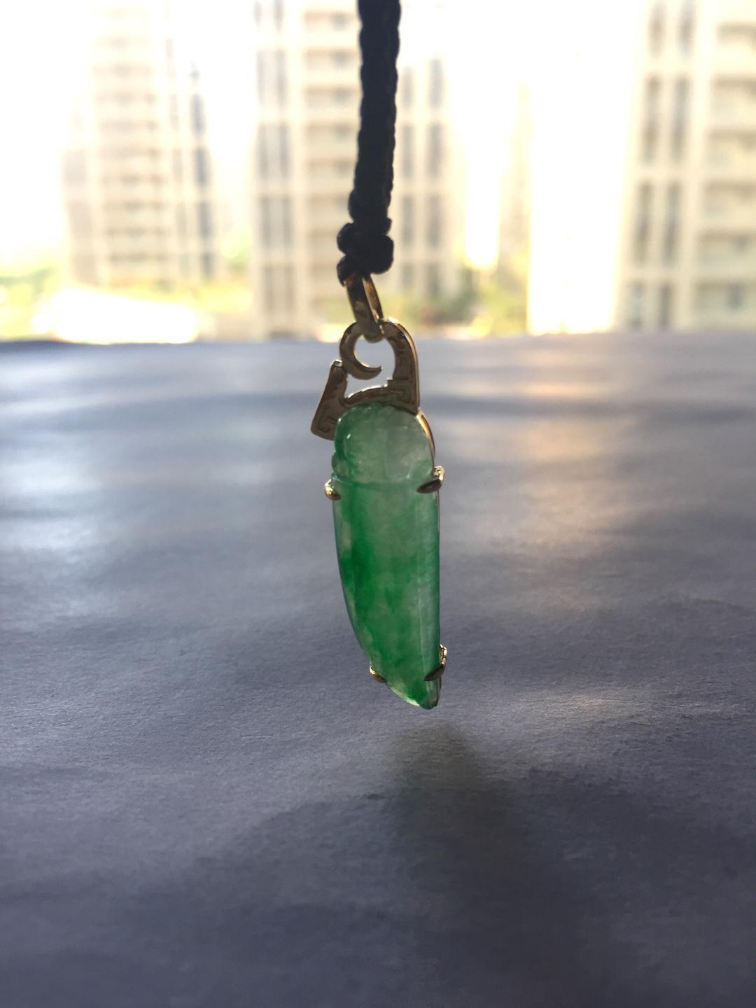 翡翠冰种阳绿府上有龙,种色俱佳,30.7*10.5*4mm,镶嵌后41.9*10.5*6.5mm。种水棒,荧光四射,正阳绿艳丽,18k黄金镶嵌,古典造型,让人心情大好的漂亮宝贝,饱满尺寸,“玉斧”上手工精雕貔貅,龙之九子。寓意家中必出贤贵之才。府上有龙,特别适合望子成龙,望女成凤的朋友,好意头。再加上漂亮的阳绿,美不胜收