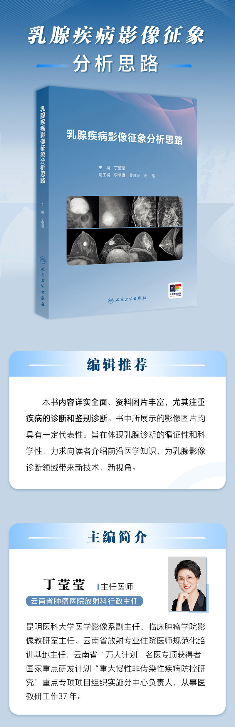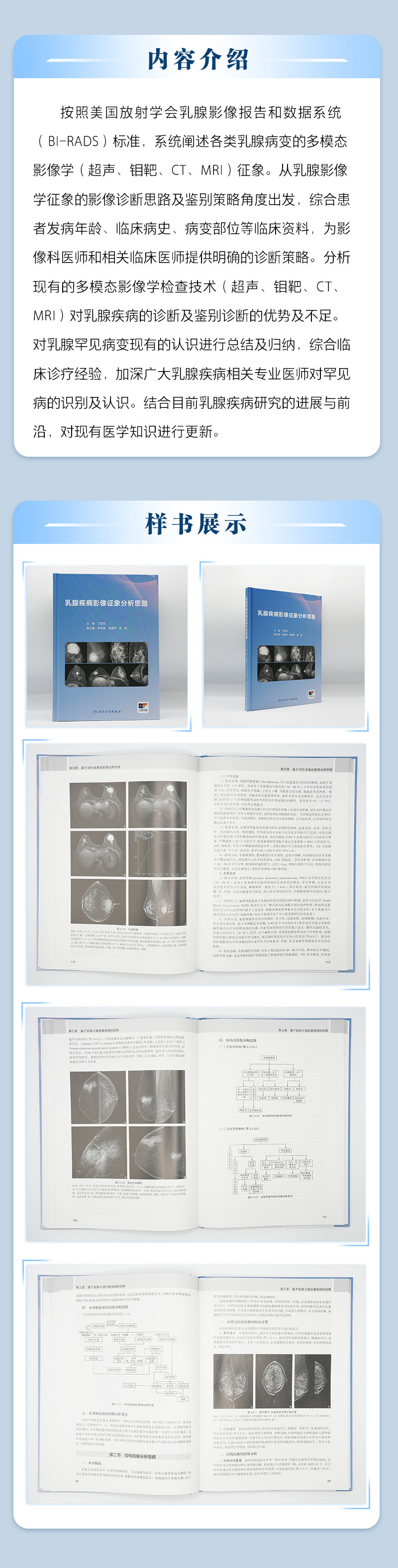 1.按照美国放射学会乳腺影像报告和数据系统(BI-RADS)标准,系统阐述各类乳腺病变的多模态影像学(超声、钼靶、CT、MRI)征象。 2.从乳腺影像学征象的影像诊断思路及鉴别策略角度出发,综合患者发病年龄、临床病史、病变部位等临床资料,为影像科医师和相关临床医师提供明确的诊断策略。 3.分析现有的多模态影像学检查技术(超声、钼靶、CT、MRI)对乳腺疾病的诊断及鉴别诊断的优势及不足,为患者选择优质及个体检查方法提供理论及技术依据。 4.对乳腺罕见病变现有的认识进行总结及归纳,综合临床诊疗经验,加深广大乳腺疾病相关专业医师对罕见病的识别及认识。 5.结合目前乳腺疾病研究的新进展与前沿,对现有医学知识进行更新。