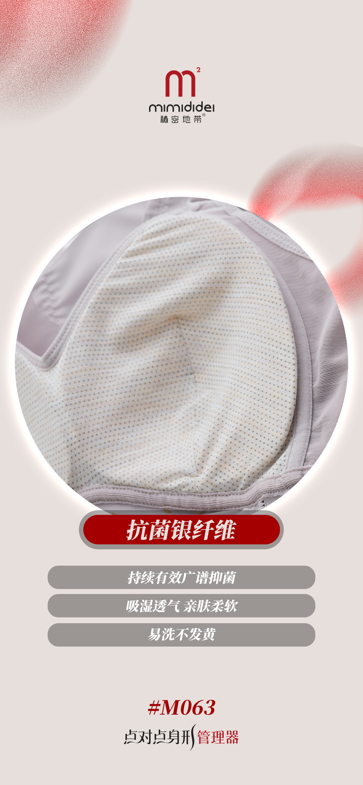 杯里采用银纤维,防辐射,抗菌,防紫外线、防过敏,吸汗性强。作为内衣里料,柔软,如第二层肌肤般轻薄。银纤维面料柔软全方位触碰胸部,让胸部肌肤每一刻都在呼吸。