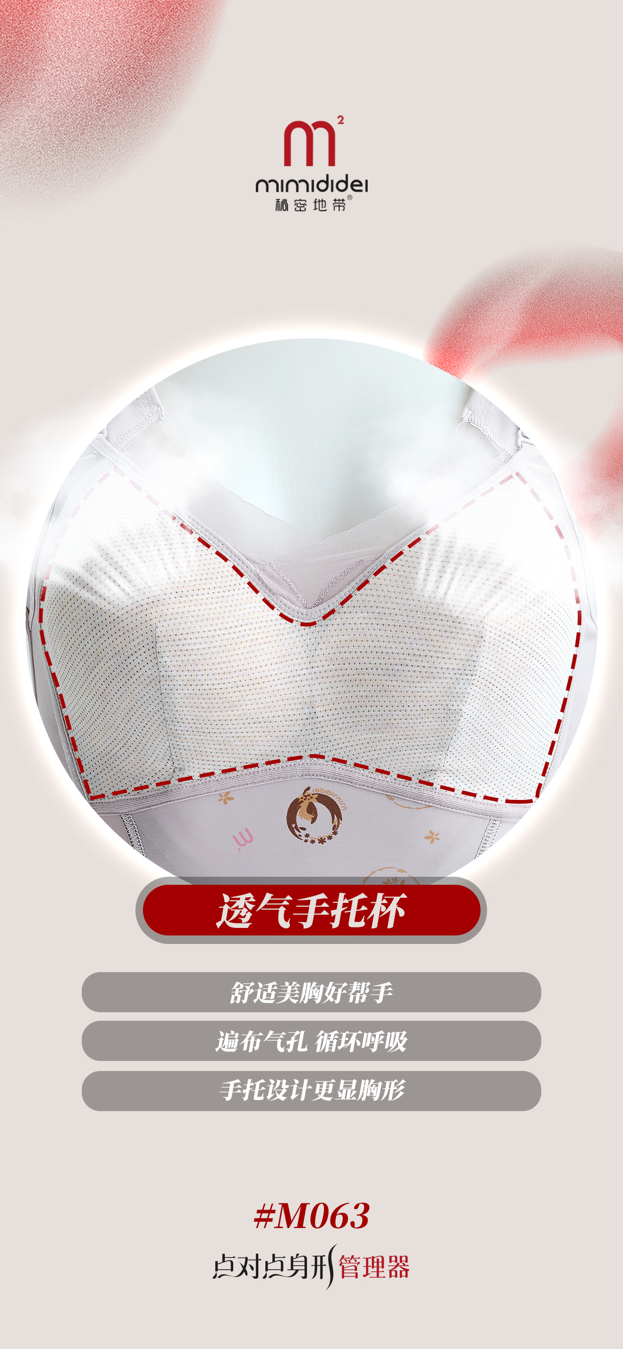 罩杯里杯采用打孔设计:透气面料,也是透气文胸界的佼佼者。透气率是海绵文胸的6.7倍,排除闷热,更加干爽,更加轻盈,由植物健康环保纤维编织,无污染,更环保。胸部不透气,容易造成皮肤瘙痒,严重或引起疼痛!所以选择一款透气的文胸很重要!天天穿都有裸感体验。乳头会呼吸,舒服又透气。手掌式托杯,就像没有穿文胸一样的舒适感,更好地承托起胸部,防止胸部下垂外扩